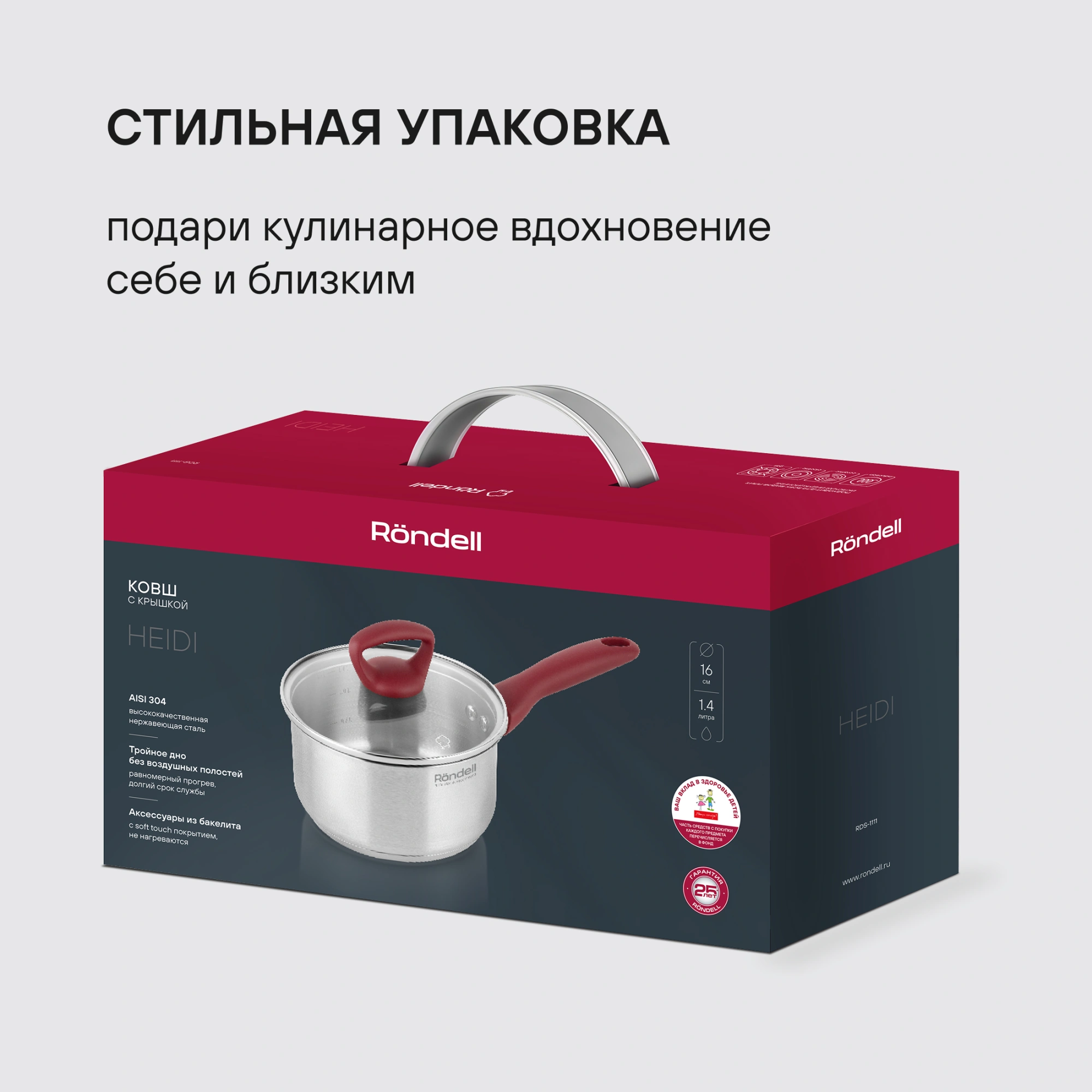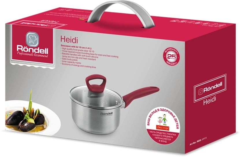 В коллекцию Heidi входят три кастрюли и ковш, изготовленные из высококачественной нержавеющей стали. Главной изюминкой коллекции являются эргономичные бакелитовые ручки с внешним покрытием Soft Touch, благородный красный цвет которых гармонично сочетается с серебристой поверхностью посуды.