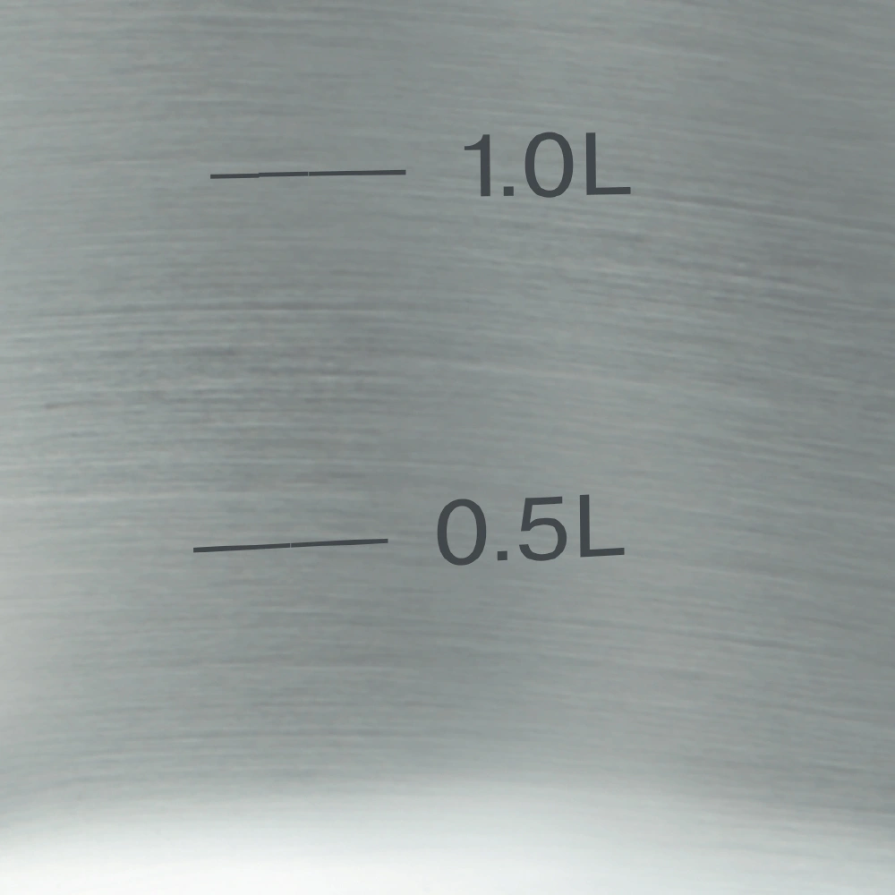 Технология: тройное вштампованное, а затем вплавленное дно без воздушных полостей. Внешнее покрытие и отделка: сатинированная полировка корпуса. Преимущества: эргономичная ручка из бакелита с внешним покрытием Soft Touch; отметки литража на внутренних стенках.