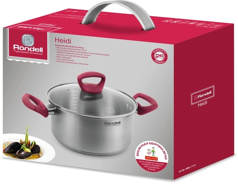 Коллекция Heidi в состав которой входят три кастрюли и ковш, изготовленные из высококачественной нержавеющей стали. Главной изюминкой являются эргономичные бакелитовые ручки с внешним покрытием Soft Touch, благородный красный цвет которых гармонично сочетается с серебристой поверхностью посуды.