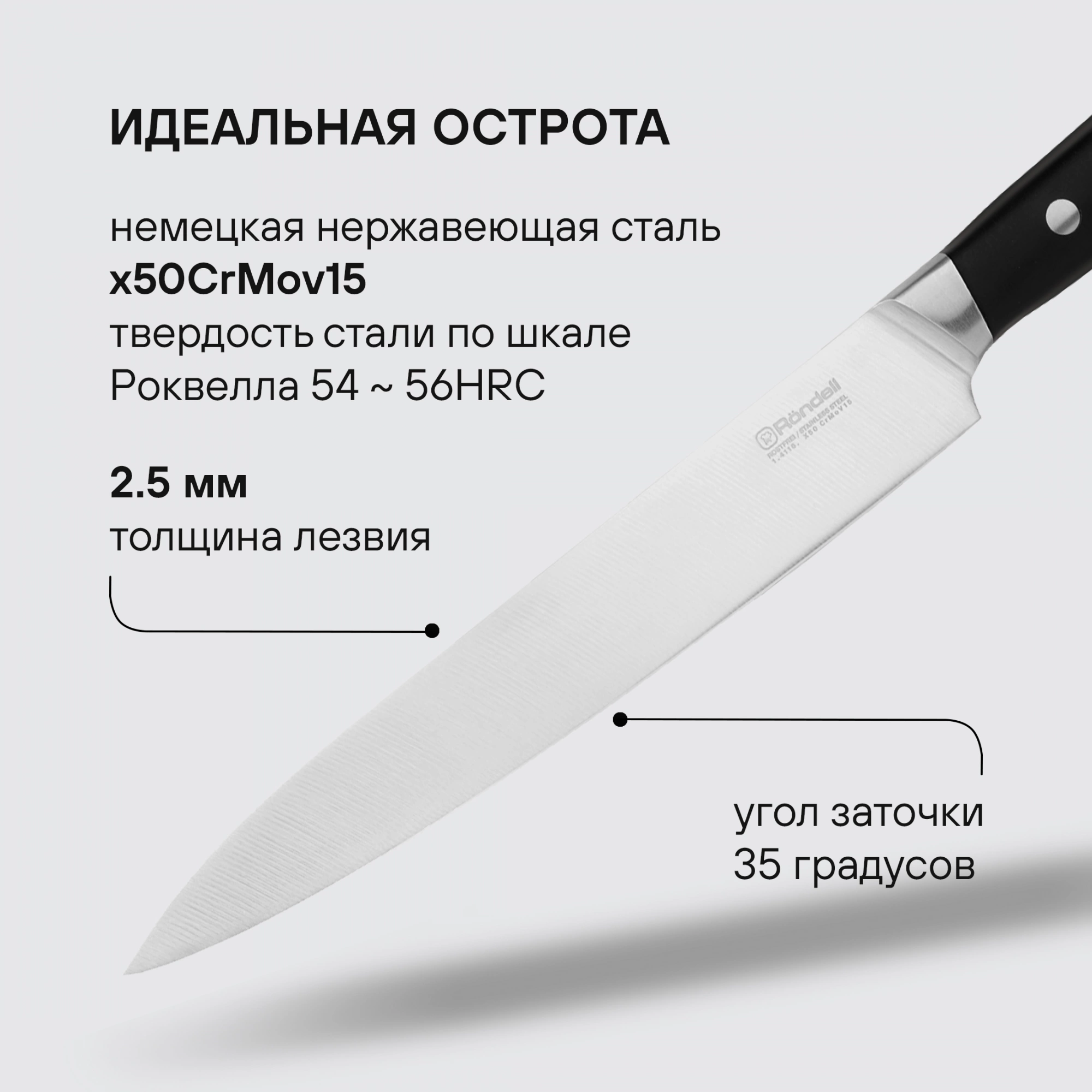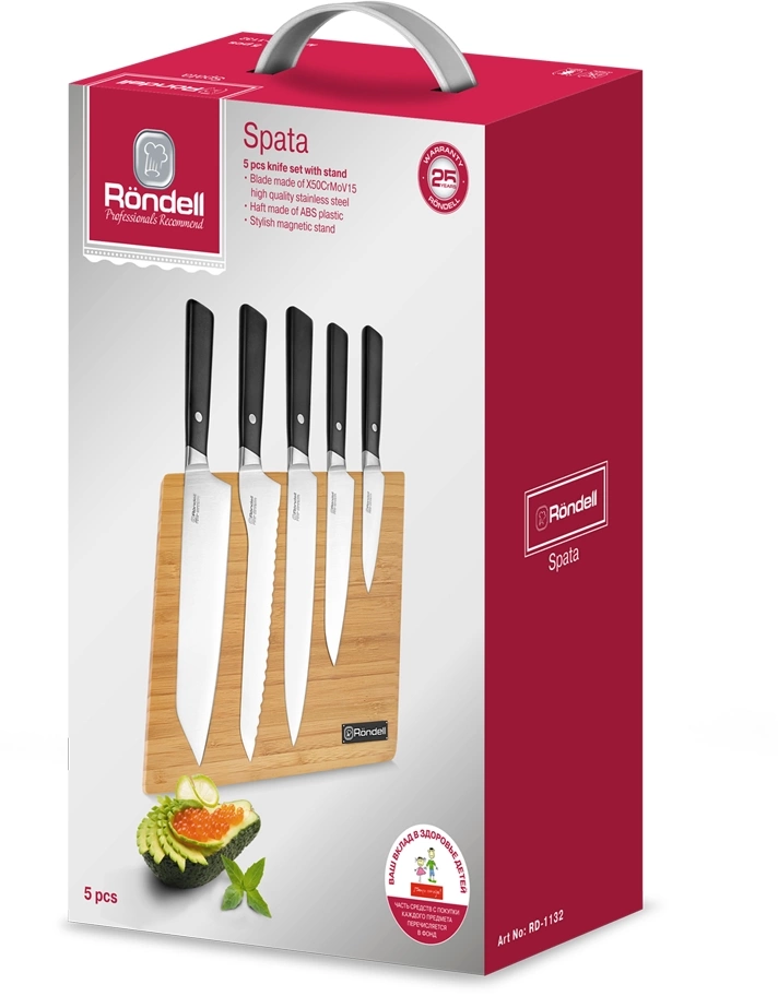 Набор ножей Rondell Spata включает в себя 5 аксессуаров с лезвиями из высококачественной немецкой нержавеющей стали X50CrMoV15 – материала, который не подвержен преждевременной утрате остроты и появлению коррозийного налета.