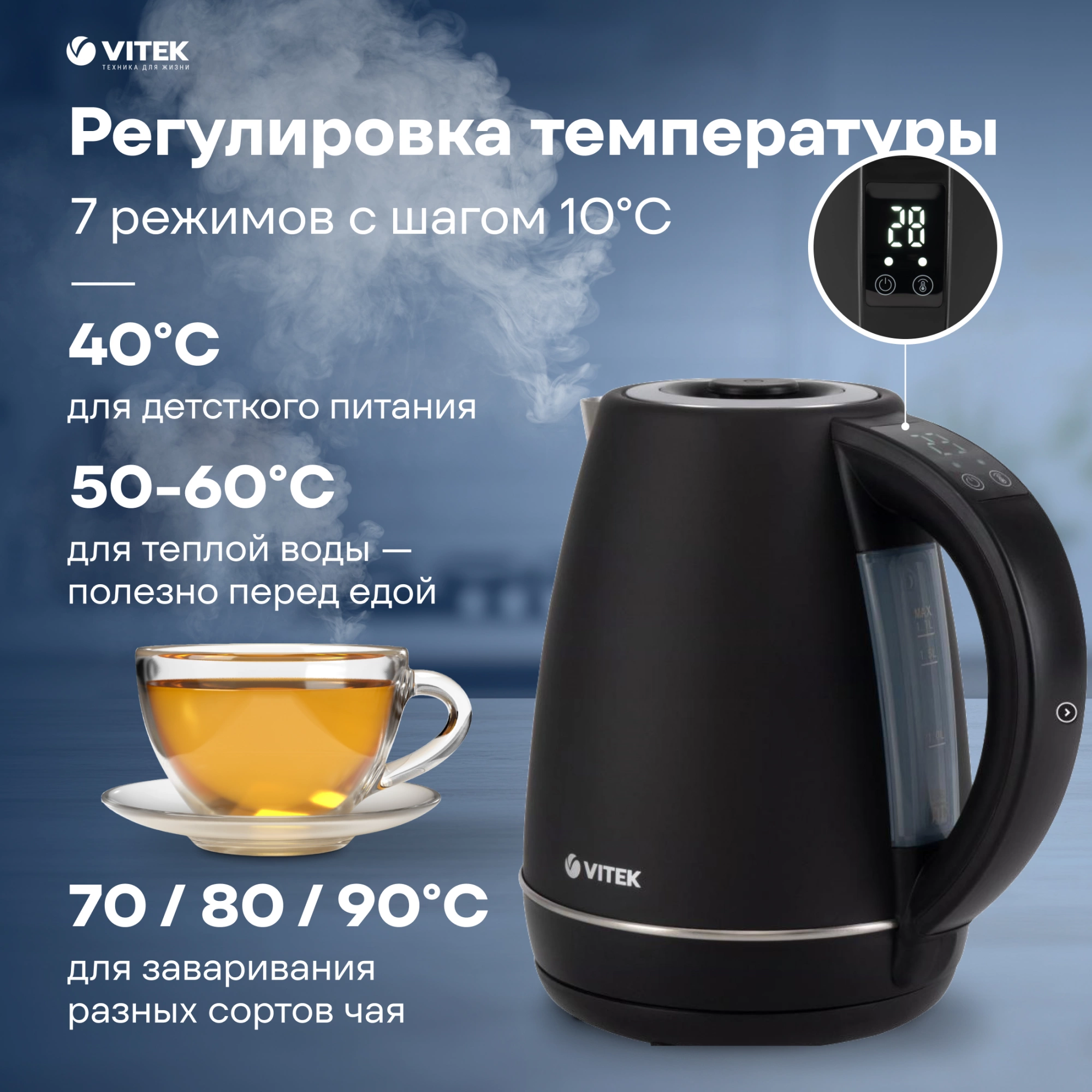 Чайник VITEK VT-1161, изготовленный из нержавеющей стали с матовым черным покрытием, выглядит настолько презентабельно, что его хочется приобрести просто из эстетических соображений. Но этому прибору есть, чем похвастаться, и помимо внешней «красоты»! Во-первых, чайник оснащен сертифицированным английским контроллером STRIX, благодаря которому прибор будет служить вам долго и надежно. Во-вторых, в устройстве имеется 7 режимов (40°С/50°С/60°С/70°С/80°С/90°С/100°С), которые позволят вам правильно заварить детское питание, черный, зеленый, белый, цветочный чай или растворимый кофе. Имеется и функция поддержания температуры (40°С/50°С/60°С/70°С/80°С/90°С). Информация о ней отражается на LED-дисплее, расположенном на ручке чайника.