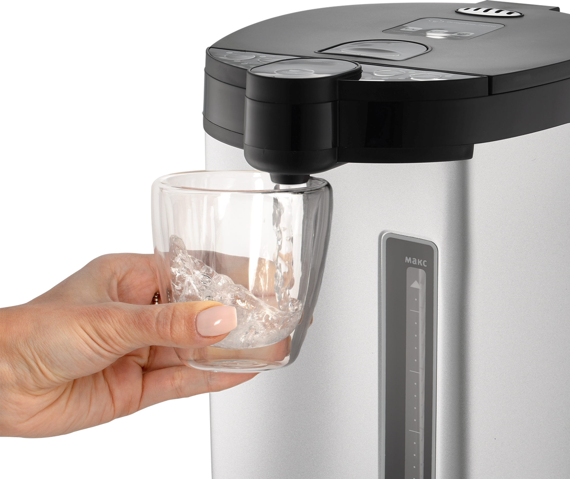 Корпус из нержавеющей стали придает термопоту элегантный вид и обеспечивает долговечность эксплуатации. Доступны автоматическая и ручная подача воды — с помощью электропомпы или нажатием чашкой на клапан.