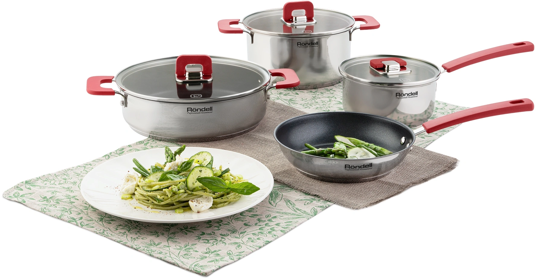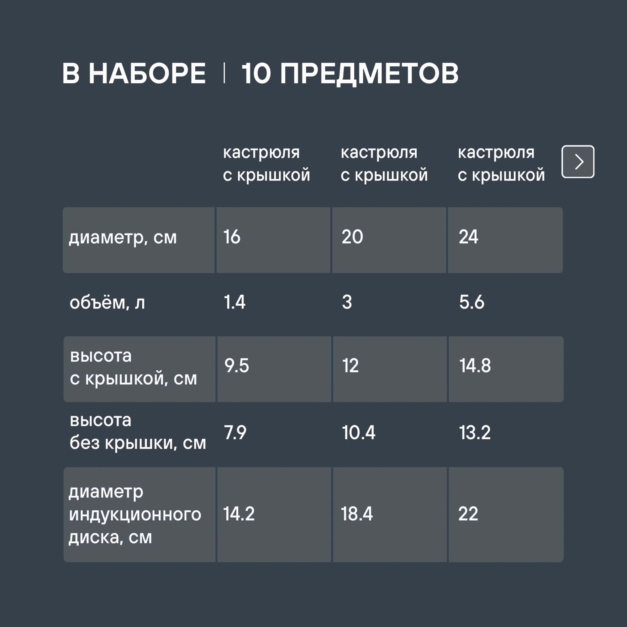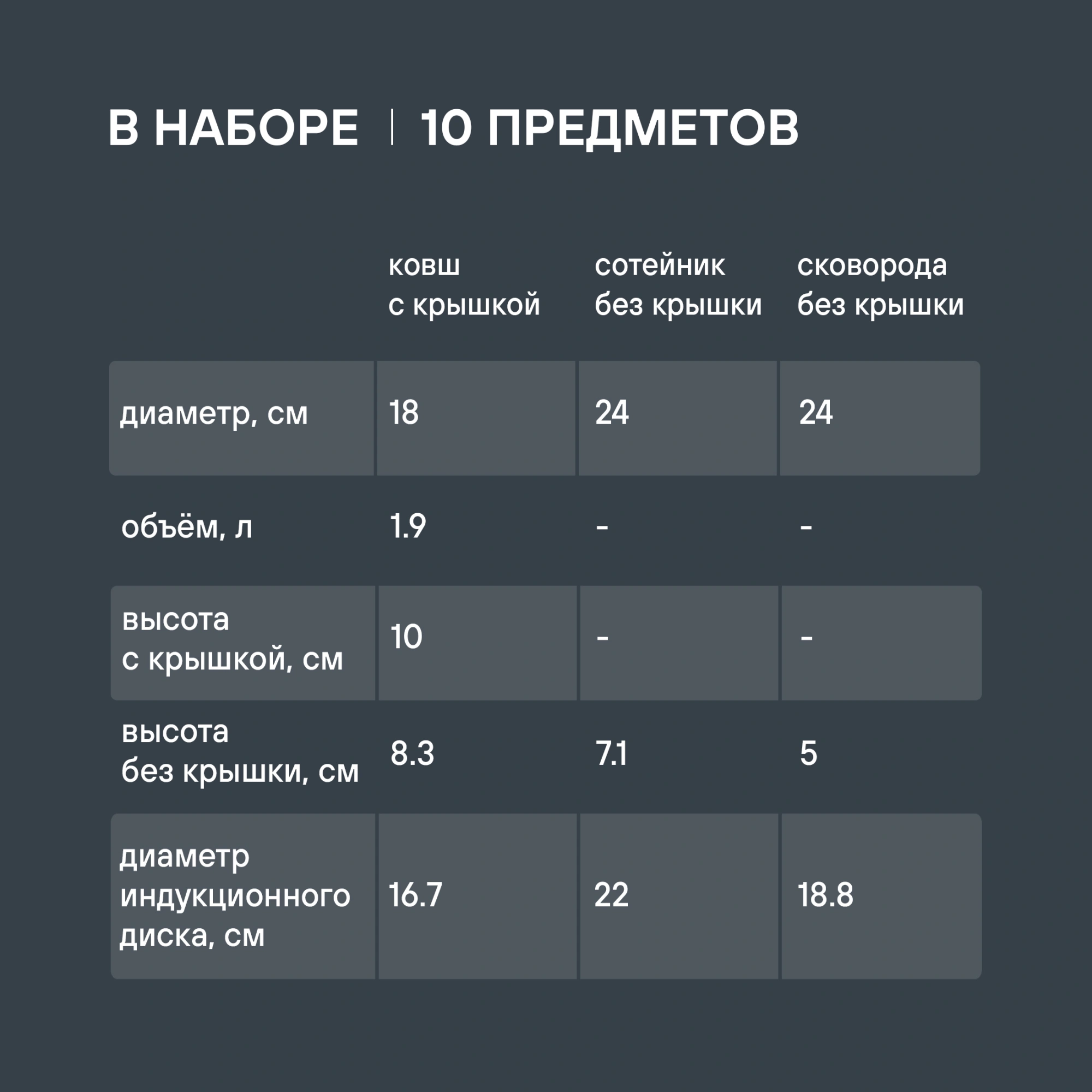 Кастрюли 16 см (1,4 л), 20 см (3 л), 24 см (5,6 л), ковш 18 см (1,9 л), со стеклянными крышками, сотейник 24х7,1 см, сковорода 24х5 см