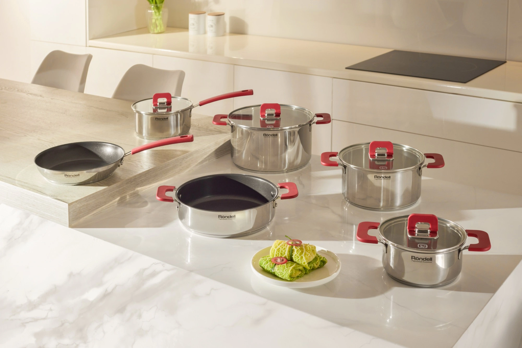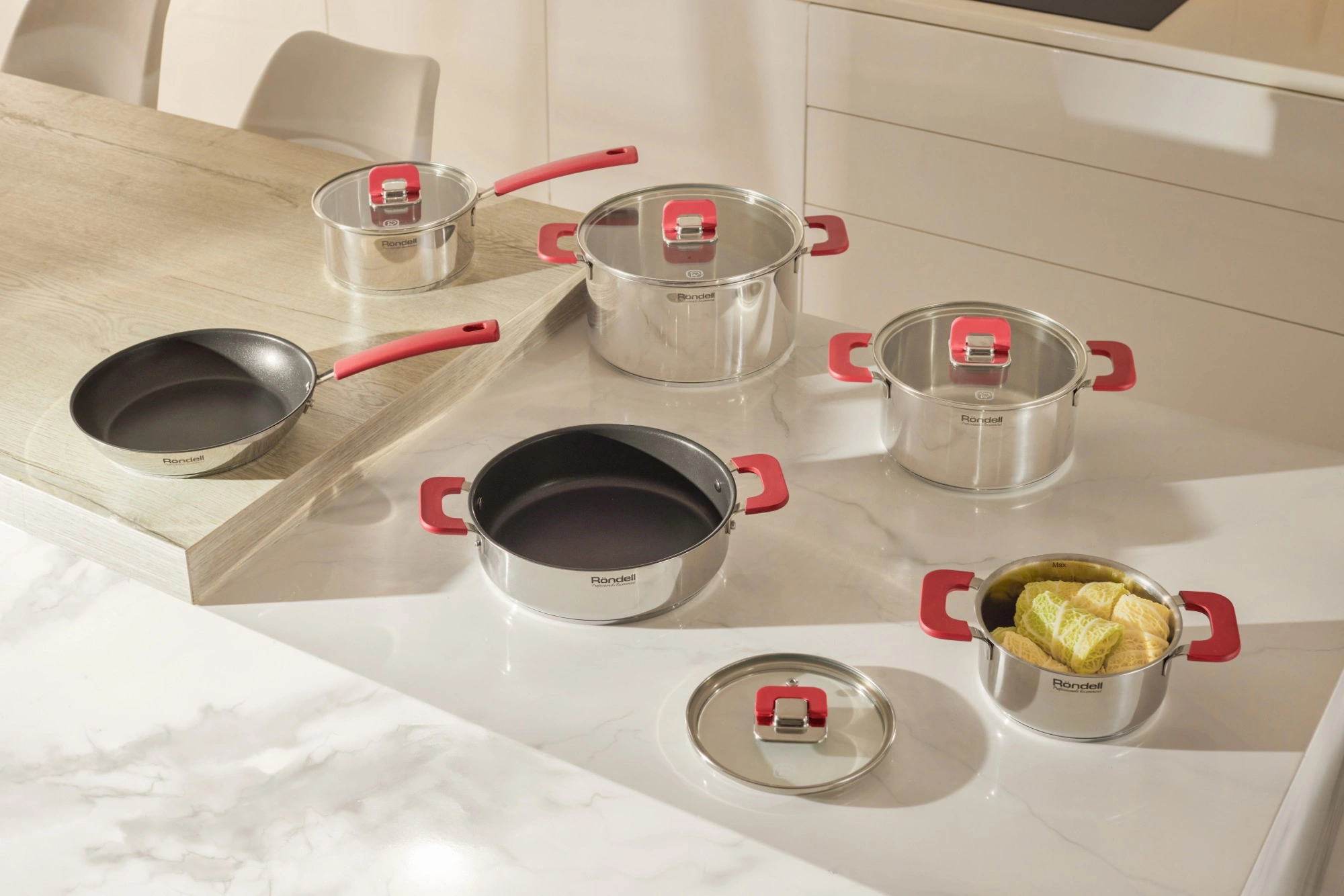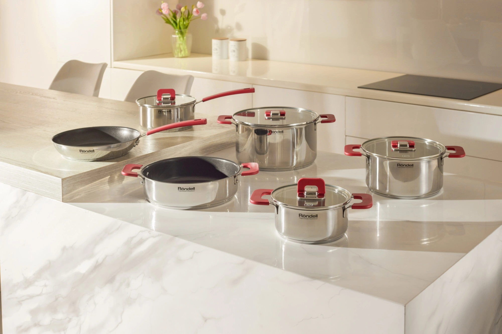 Кастрюли 16 см (1,4 л), 20 см (3 л), 24 см (5,6 л), ковш 18 см (1,9 л), со стеклянными крышками, сотейник 24х7,1 см, сковорода 24х5 см