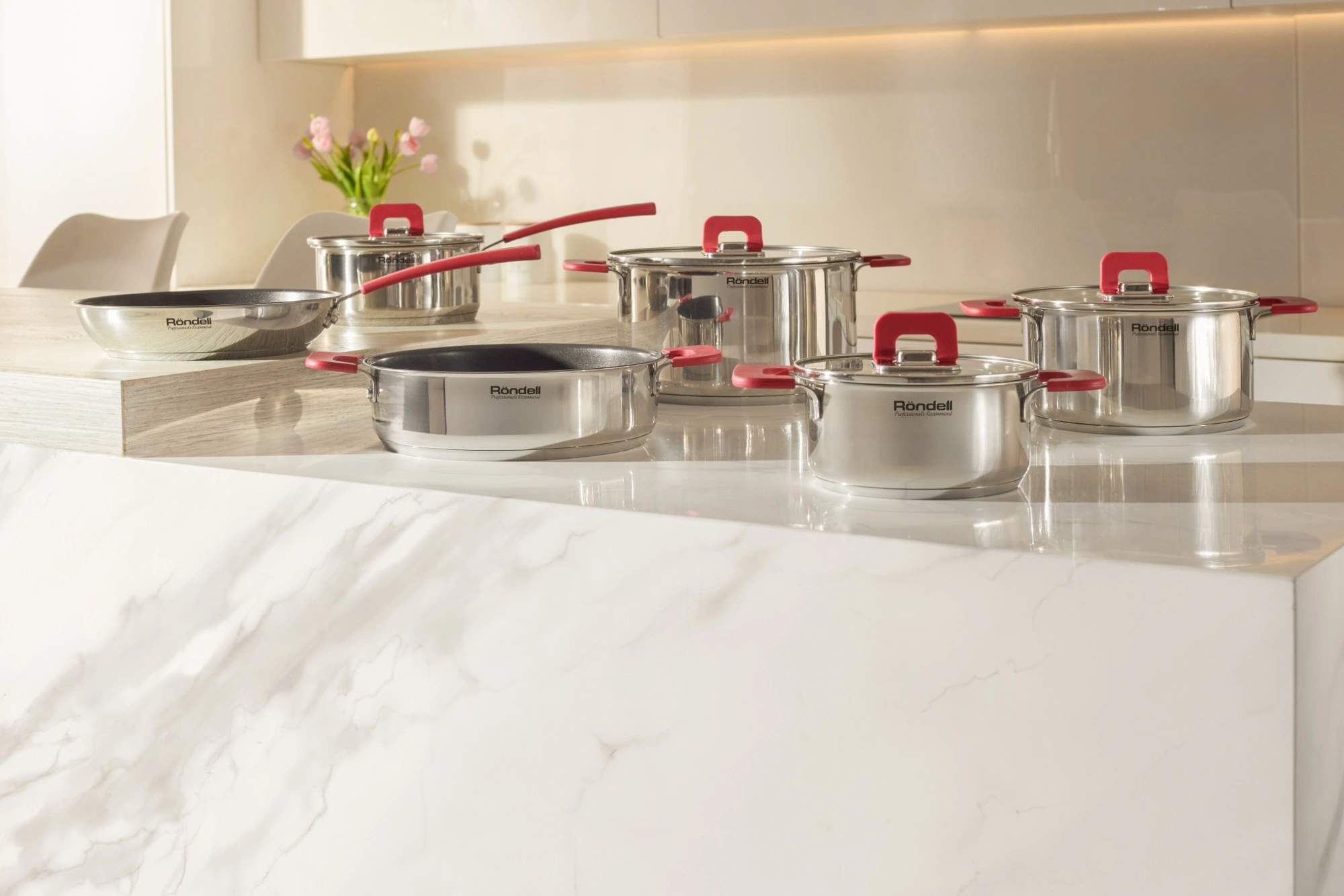 Материал: высококачественная нержавеющая сталь 18/10. SilkWare® - двухслойное антипригарное покрытие для интенсивного использования (для сковороды и сотейника). Толщина стенок: 0,5 мм. Толщина дна: 4,5 мм; 5,0 мм; 4,0 мм. Преимущества: складная ручка на плоской крышке для экономии пространства;