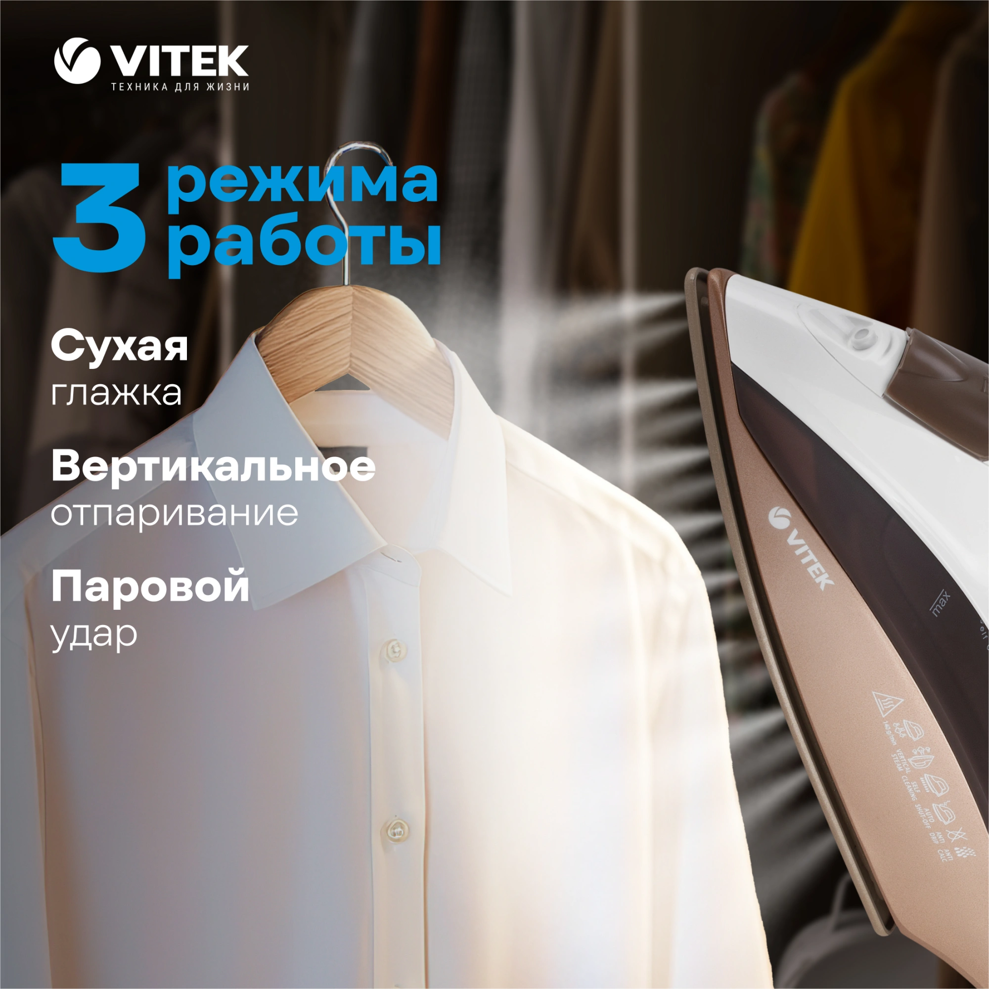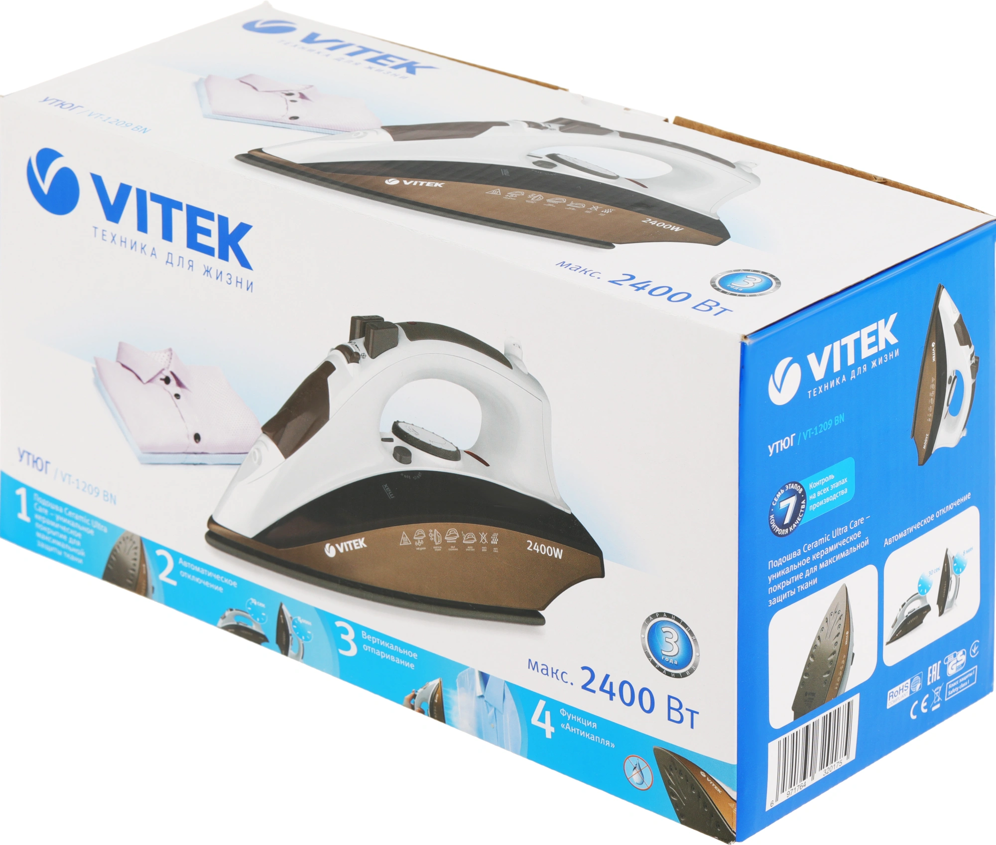 Утюг VITEK VT-1209 с керамической подошвой прост в эксплуатации и обслуживании. Благодаря умным функциям глажка превратится в удовольствие. Автоматическое отключение делает прибор еще безопаснее.