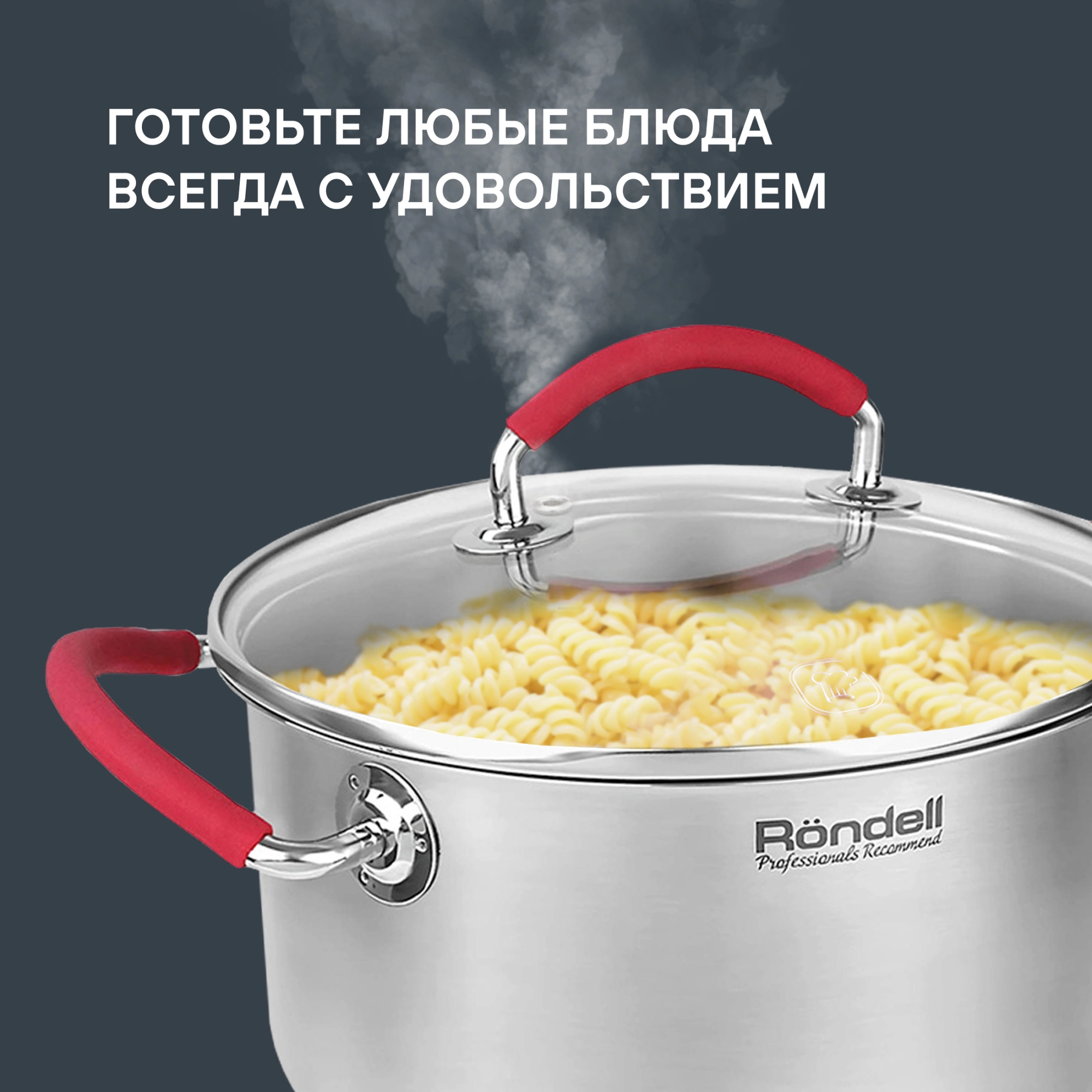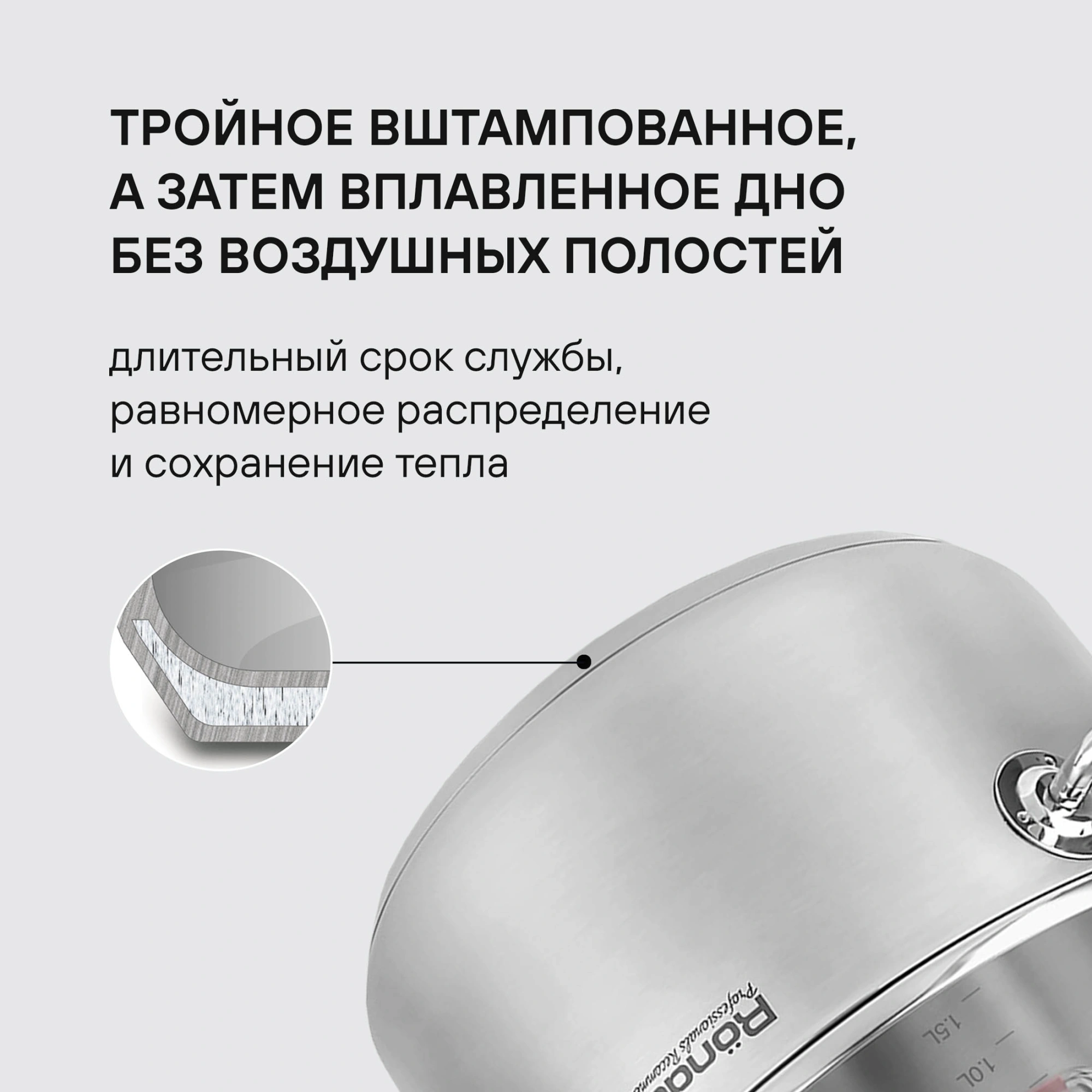 Материал: высококачественная нержавеющая сталь 18/10. Технология: тройное вштампованное, а затем вплавленное дно без воздушных полостей. Материал крышки: термостойкое стекло. Аксессуары: удобные комбинированные: нержавеющая сталь и силикон. Преимущества: эргономичная форма ручек.