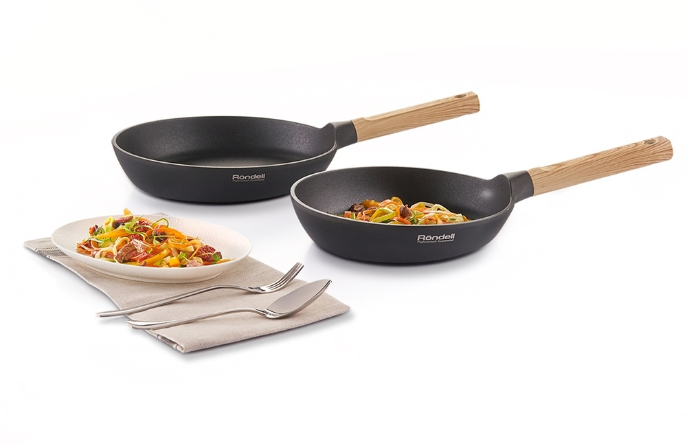 Технология: специальная фактурная обработка внутренней поверхности. Аксессуары: из бакелита, с покрытием Soft Touch. Преимущества: оригинальная форма корпуса для удобства переворачивания блюда. Упаковка: картонный рукав.