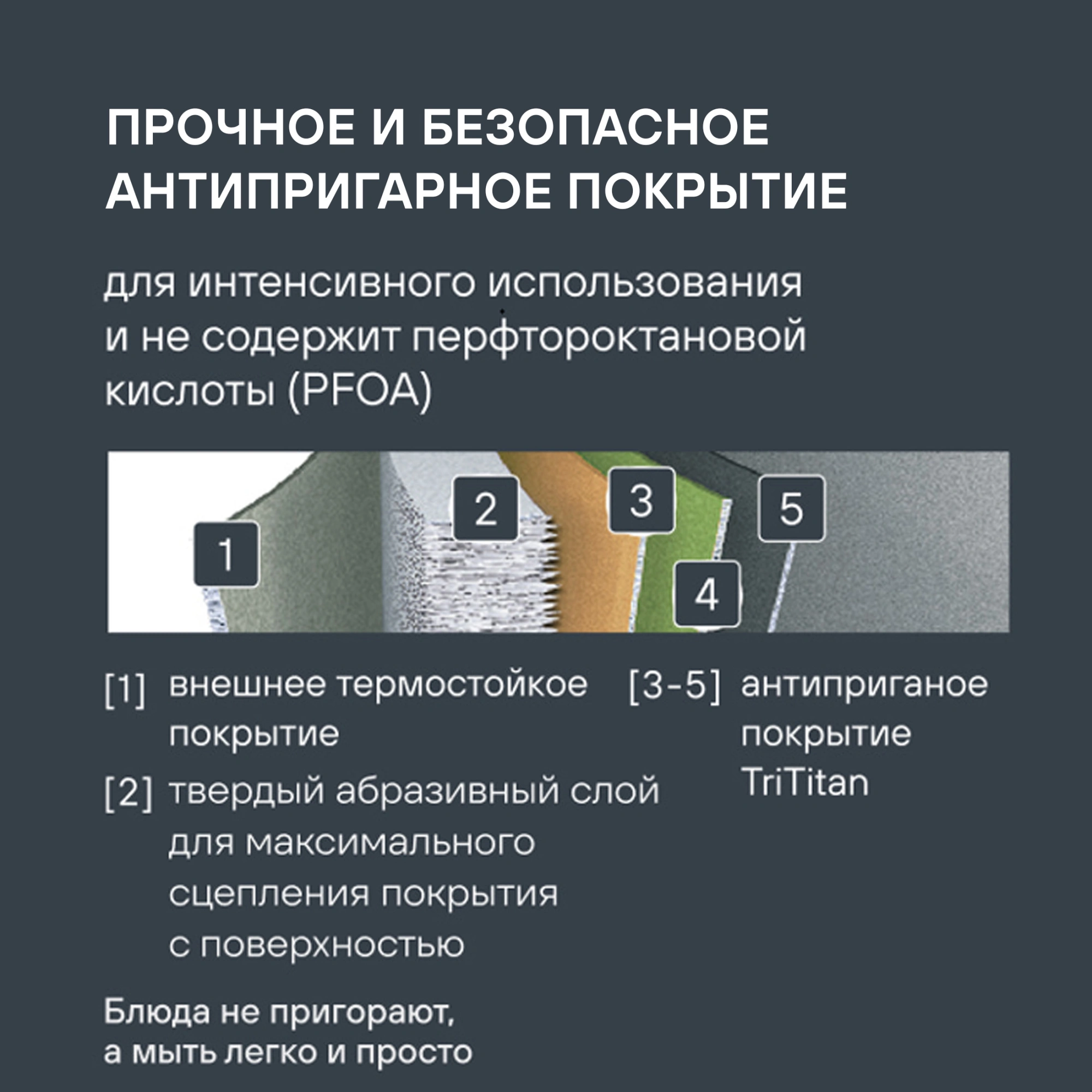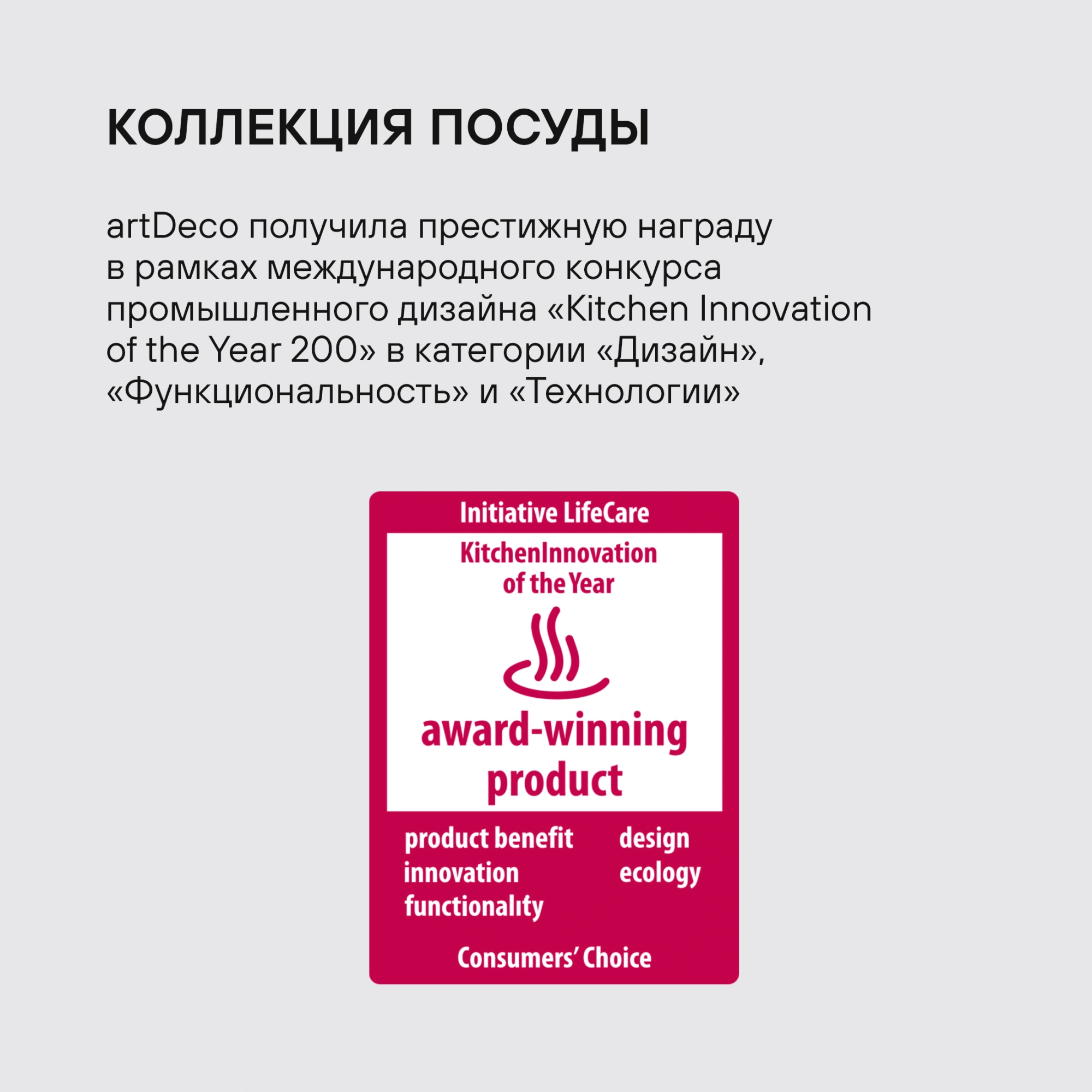 Коллекция ArtDeco отмечена престижной международной наградой Kitchen Innovation-2020 за инновации и дизайн. Все предметы имеют внутреннее надежное антипригарное трехслойное покрытие TriTitan®, которое дарит особый комфорт в процессе приготовления и дает возможность использовать металлические лопатки