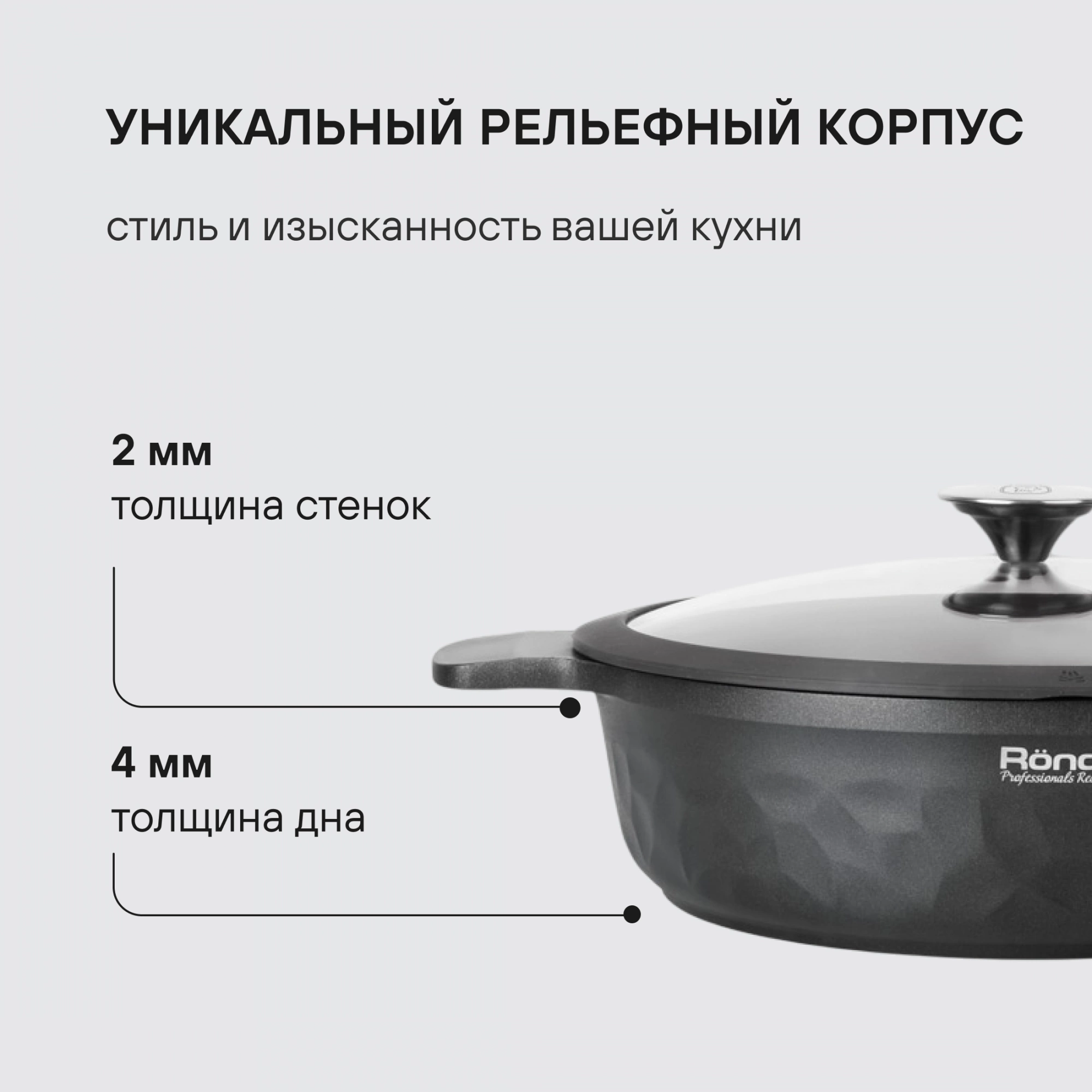 Внутреннее покрытие: TriTitan® - трехслойное, износостойкое антипригарное покрытие на основе титана. Специальное внешнее термостойкое покрытие для легкого ухода со стильным фактурным дизайном. Аксессуары: Монолитные алюминиевые ручки.