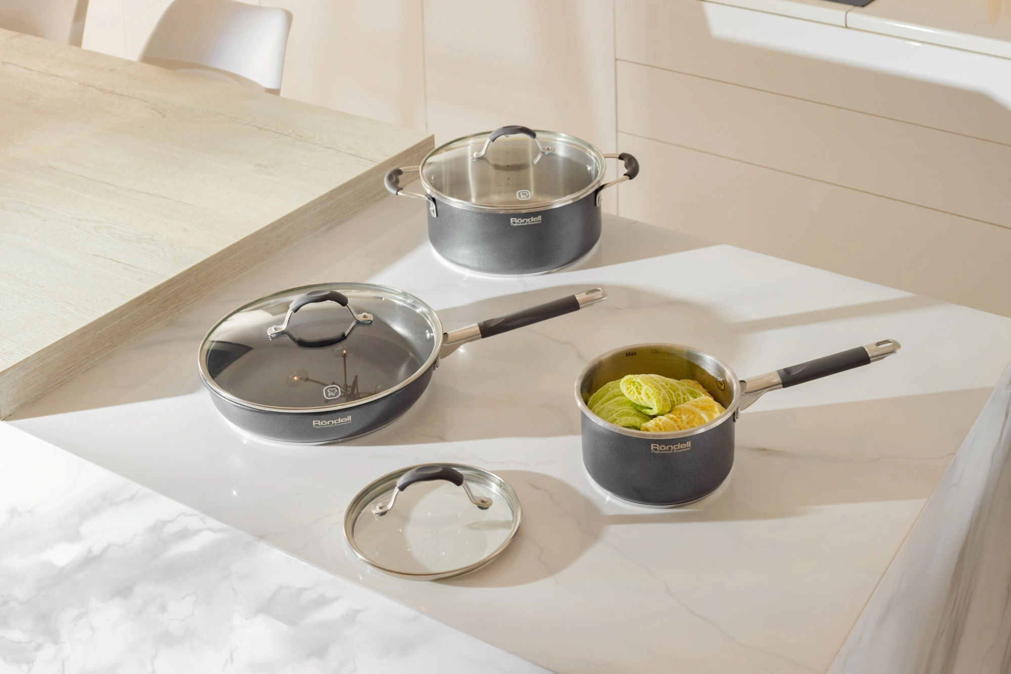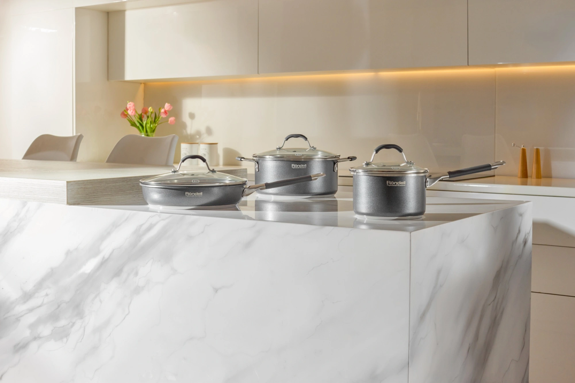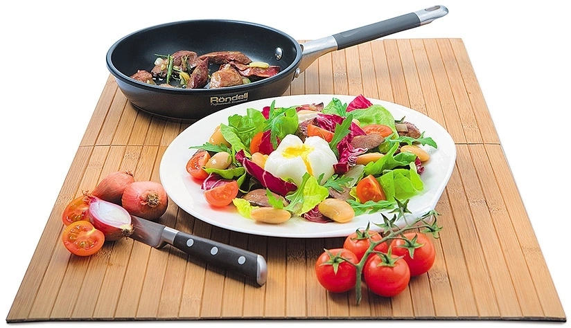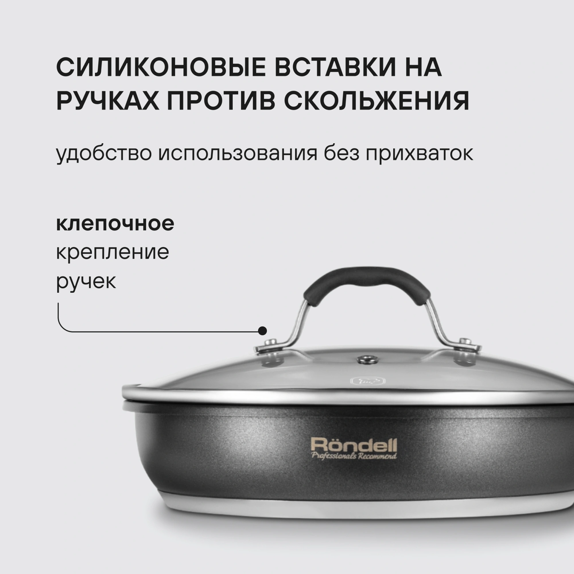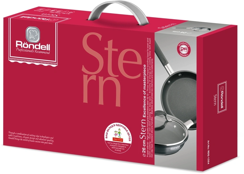 Технология: тройное вштампованное, а затем вплавленное дно без воздушных полостей. Аксессуары: удобные комбинированные: нержавеющая сталь и силикон. Преимущества: возможно использование металлических лопаток. Упаковка: подарочная коробка с ручкой.