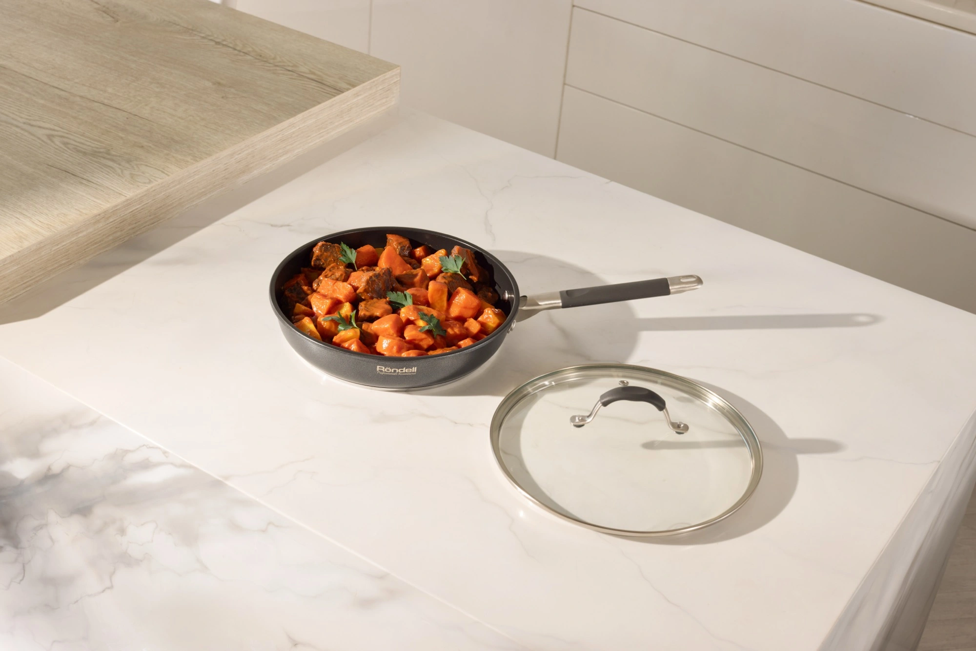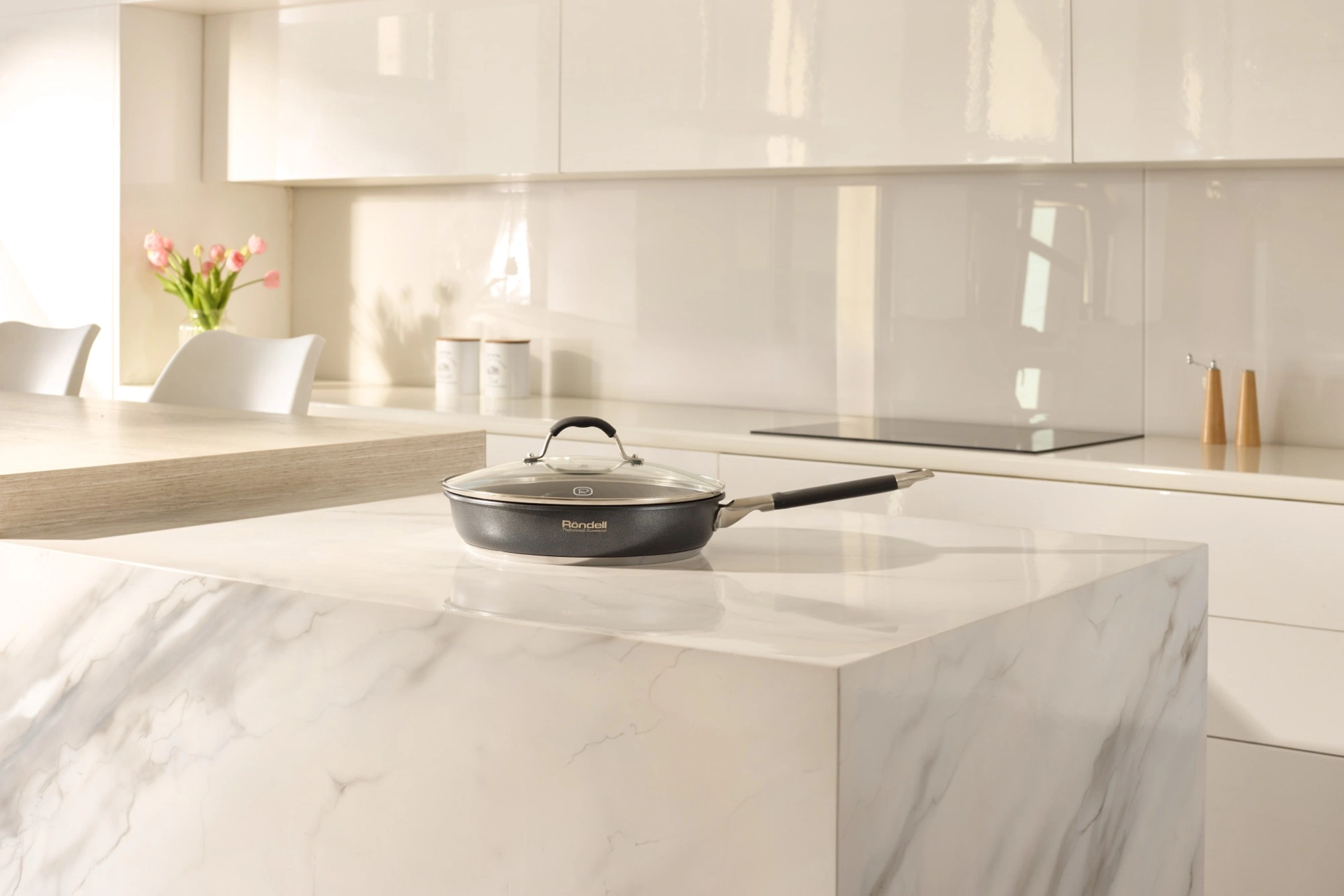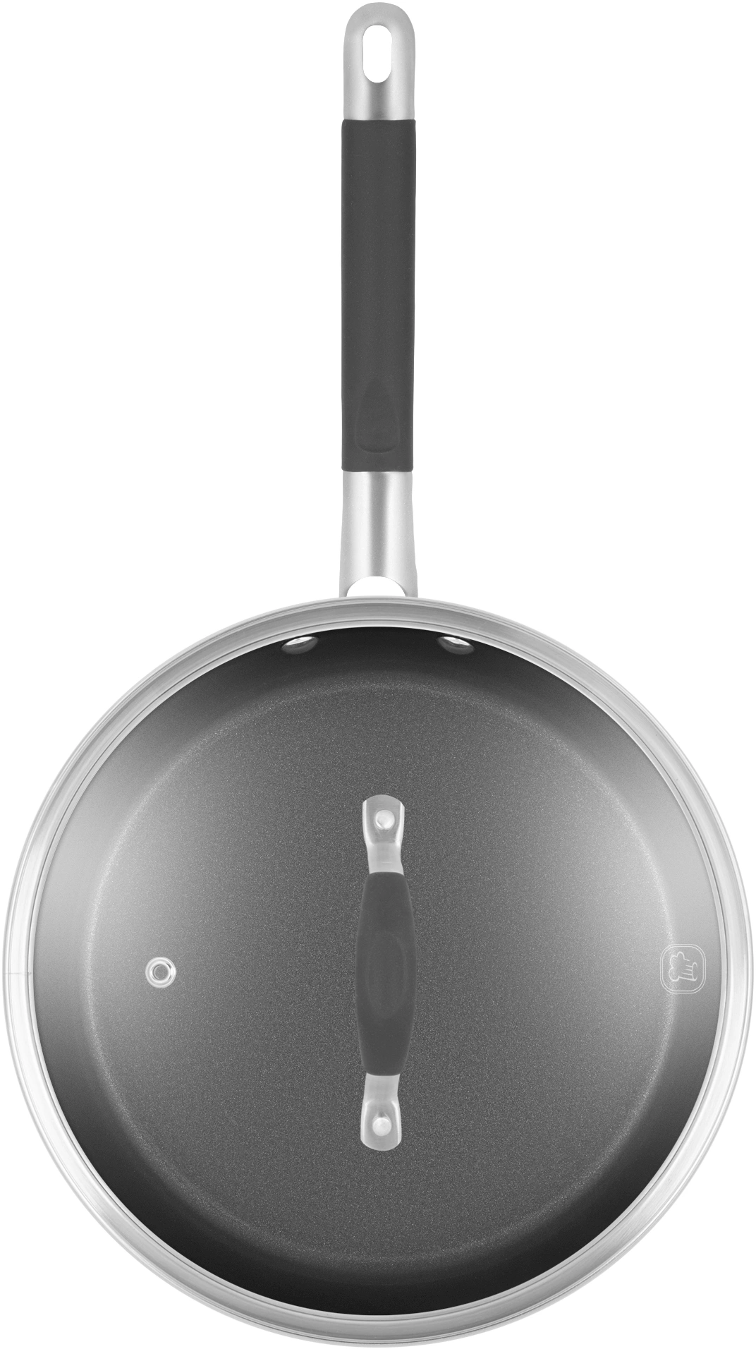 Технология: тройное вштампованное, а затем вплавленное дно без воздушных полостей. Аксессуары: удобные комбинированные: нержавеющая сталь и силикон. Преимущества: возможно использование металлических лопаток. Упаковка: подарочная коробка с ручкой.