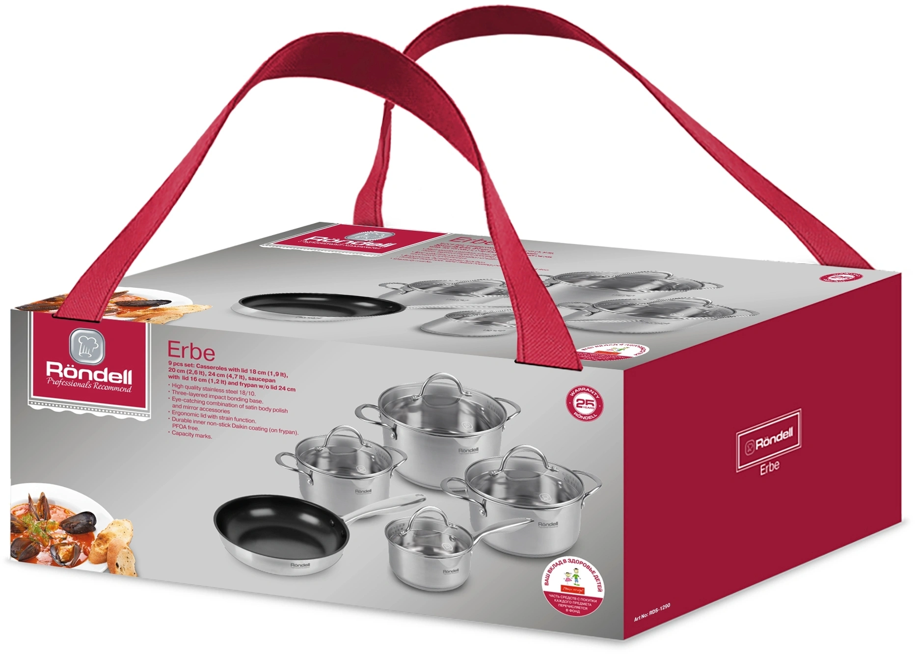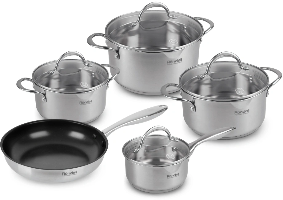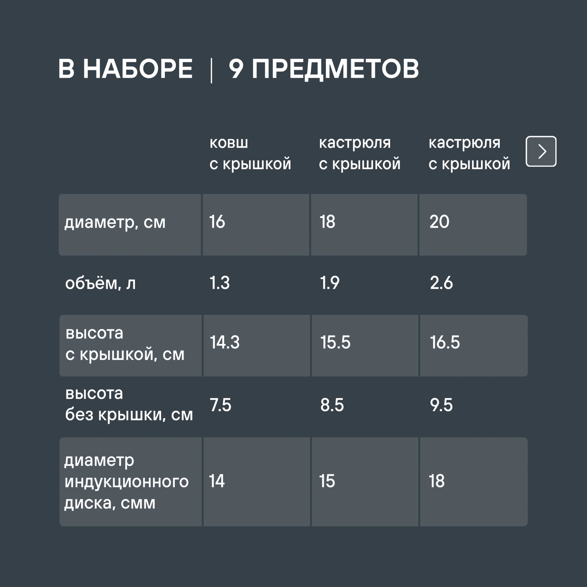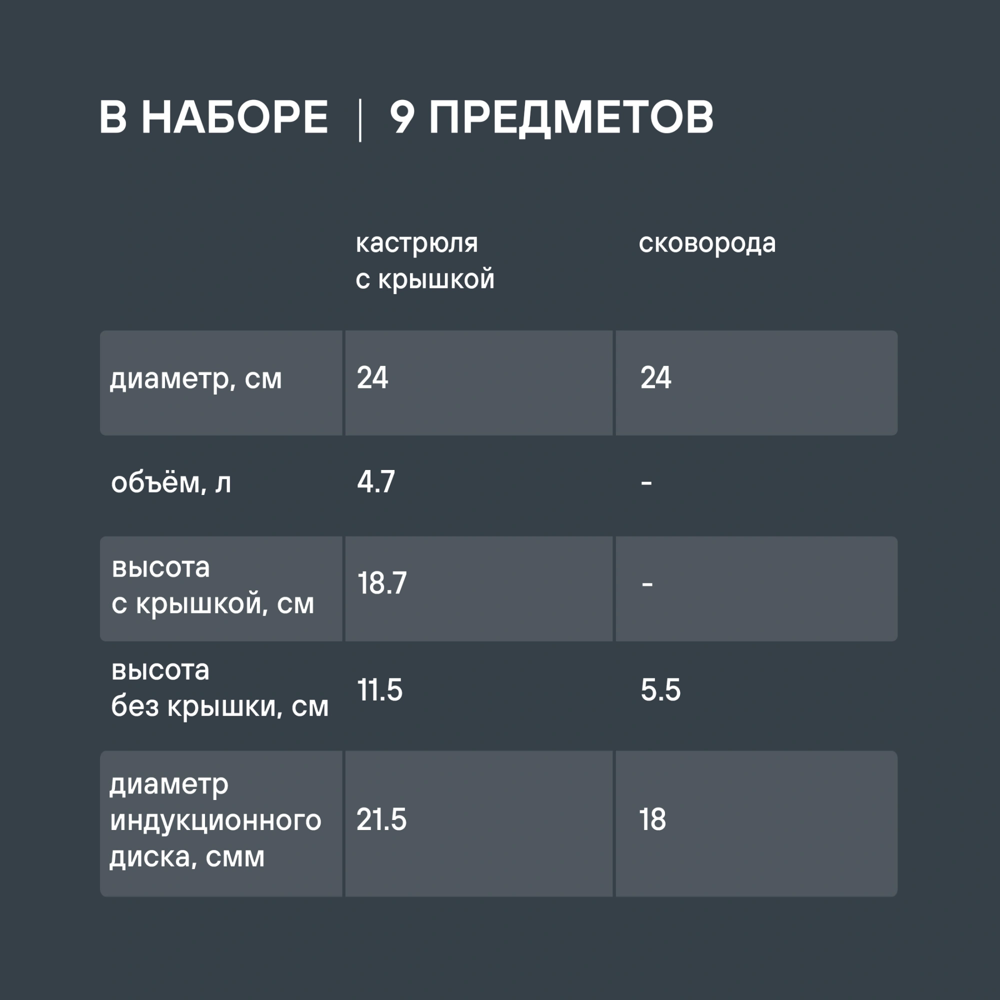 Кастрюли 18 см (1,9 л), 20 см (2,6 л), 24 см (4,7 л), ковш 16 см (1,3 л) со стеклянными крышками, сковорода 24 см