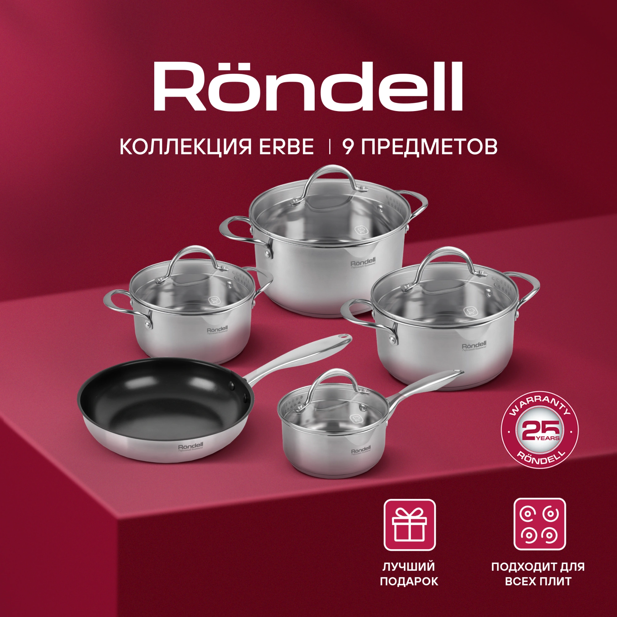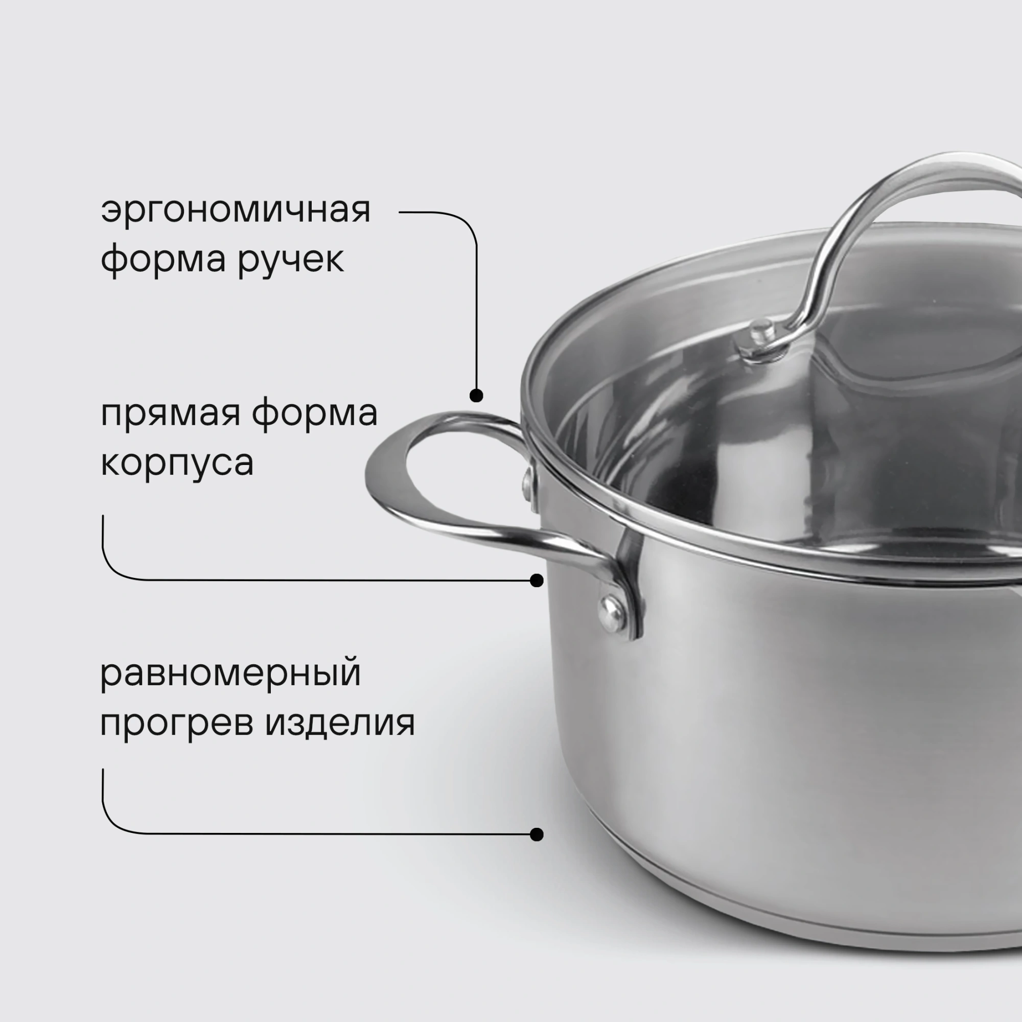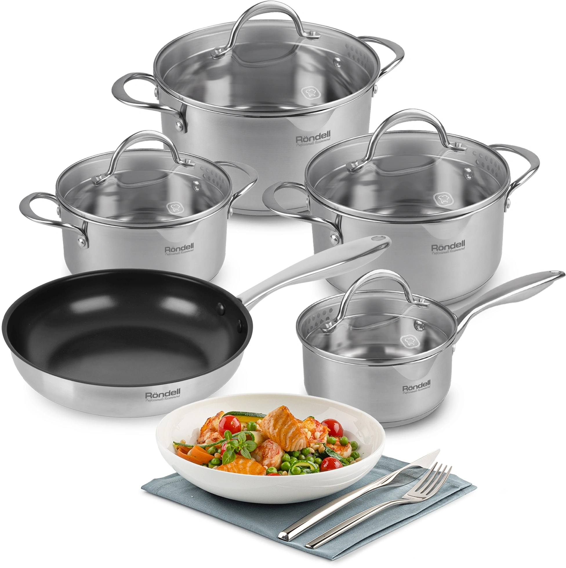 Кастрюли 18 см (1,9 л), 20 см (2,6 л), 24 см (4,7 л), ковш 16 см (1,3 л) со стеклянными крышками, сковорода 24 см