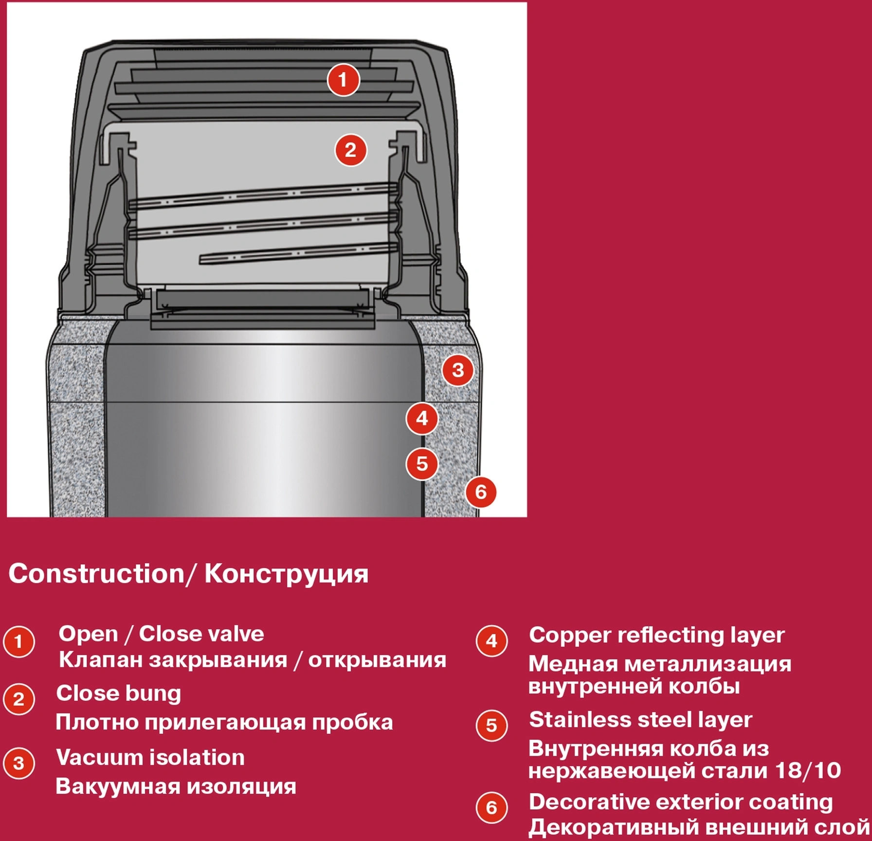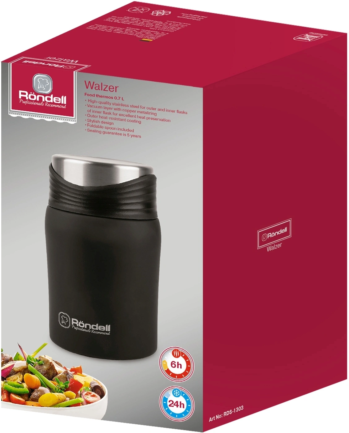 Стильный термос Walzer поддерживает температуру без изменений на протяжении длительного времени, благодаря внутреннему теплозащитному экрану. Вакуумный слой с медной металлизацией (для внешнего контейнера): 24 часа – холодная вода, 6 часов – горячая вода (до 75С). Стальная ложка в комплекте.
