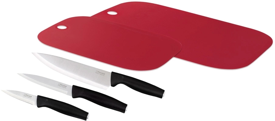 Высококачественная нержавеющая сталь X30Cr13. В комплекте: поварской 20см, универсальный 12,7см, нож для овощей 8,9см + две разделочные доски среднего (34х24 см) и малого (27,5х20 см) размера. Разделочная доска подходит для посудомоечной машины. Ножи не рекомендуется мыть в посудомоечной машине