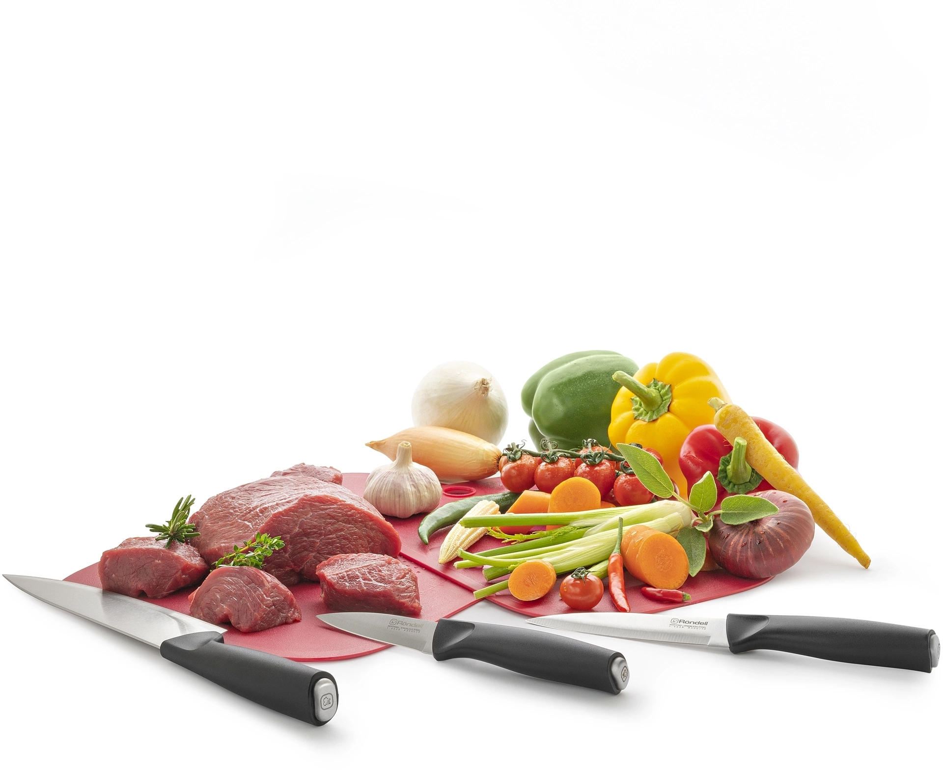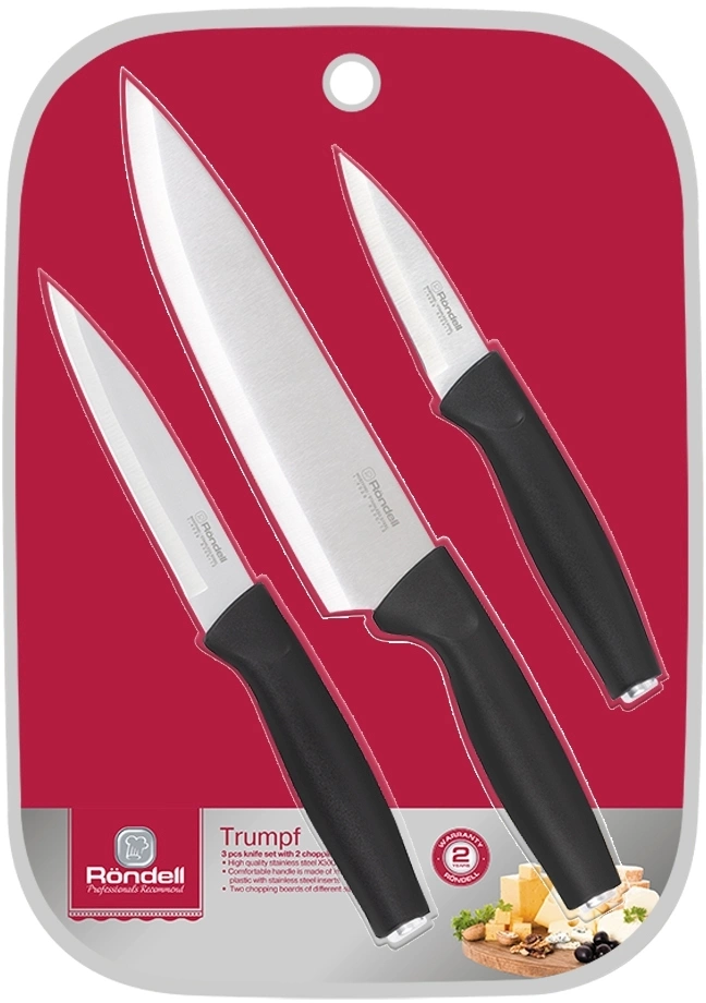 Дополняет коллекцию Trumpf набор ножей с разделочной доской в комплекте. Лезвия ножей выполнены из надежной нержавеющей стали, поэтому они прослужат вам действительно долго. Прорезиненные ручки с удобным хватом, не позволяющим руке скользить – особый комфорт в процессе использования гарантирован.