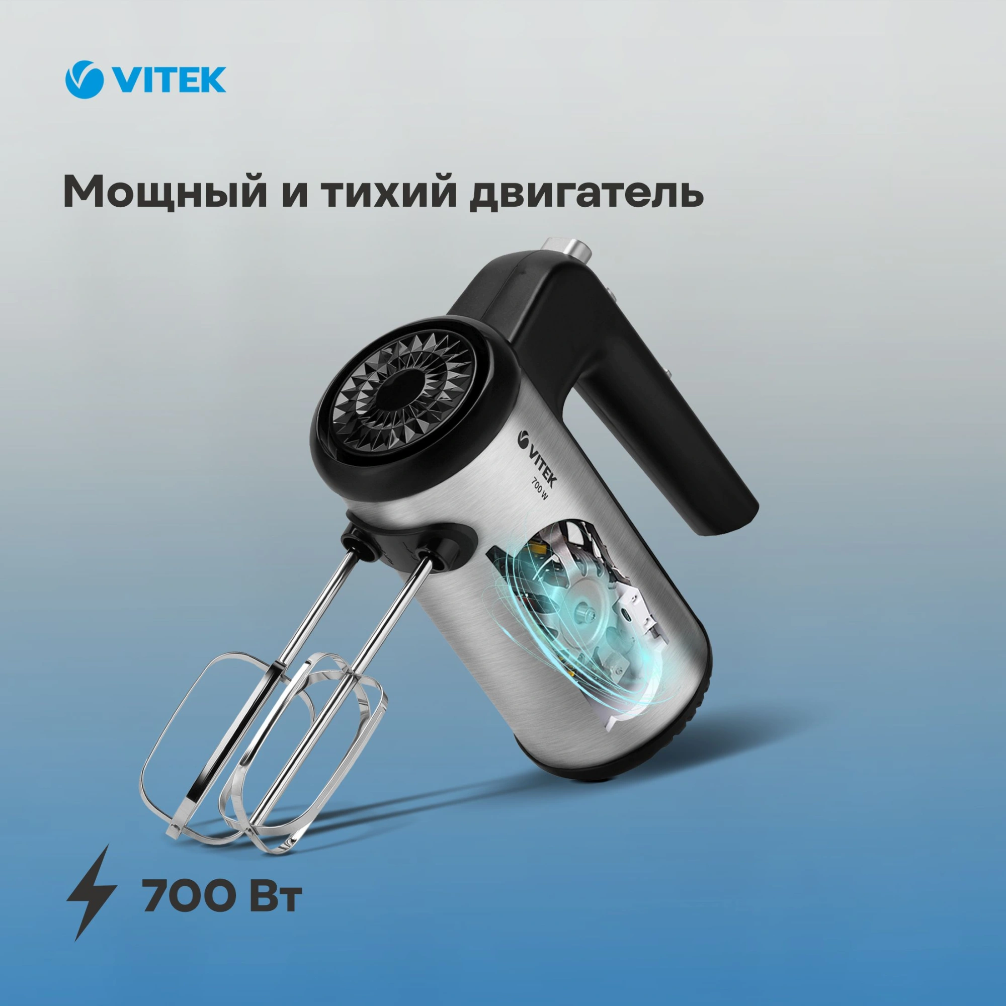 Превосходно справиться с любой кондитерской задачей (взбить белки, крем или легкое тесто) позволит кухонный миксер VITEK VT-1411 с максимальной мощностью 700 Вт. Он имеет пять скоростных режимов, а также особый режим TURBO, который усиливает вращение насадок и таким образом повышает эффективность обработки ингредиентов. В комплект с миксером входят два венчика для взбивания и два крюка для вымешивания теста, изготовленные из высококачественной нержавеющей стали: насадки легко отделяются от корпуса нажатием специальной кнопки. Прибор оснащен эффективной системой охлаждения, предотвращающей перегрев. Купить миксер VITEK — значит, приобрести действительно отличный надежный прибор, помогающий не просто готовить, а творить. С VITEK жить в большом городе легко и комфортно!