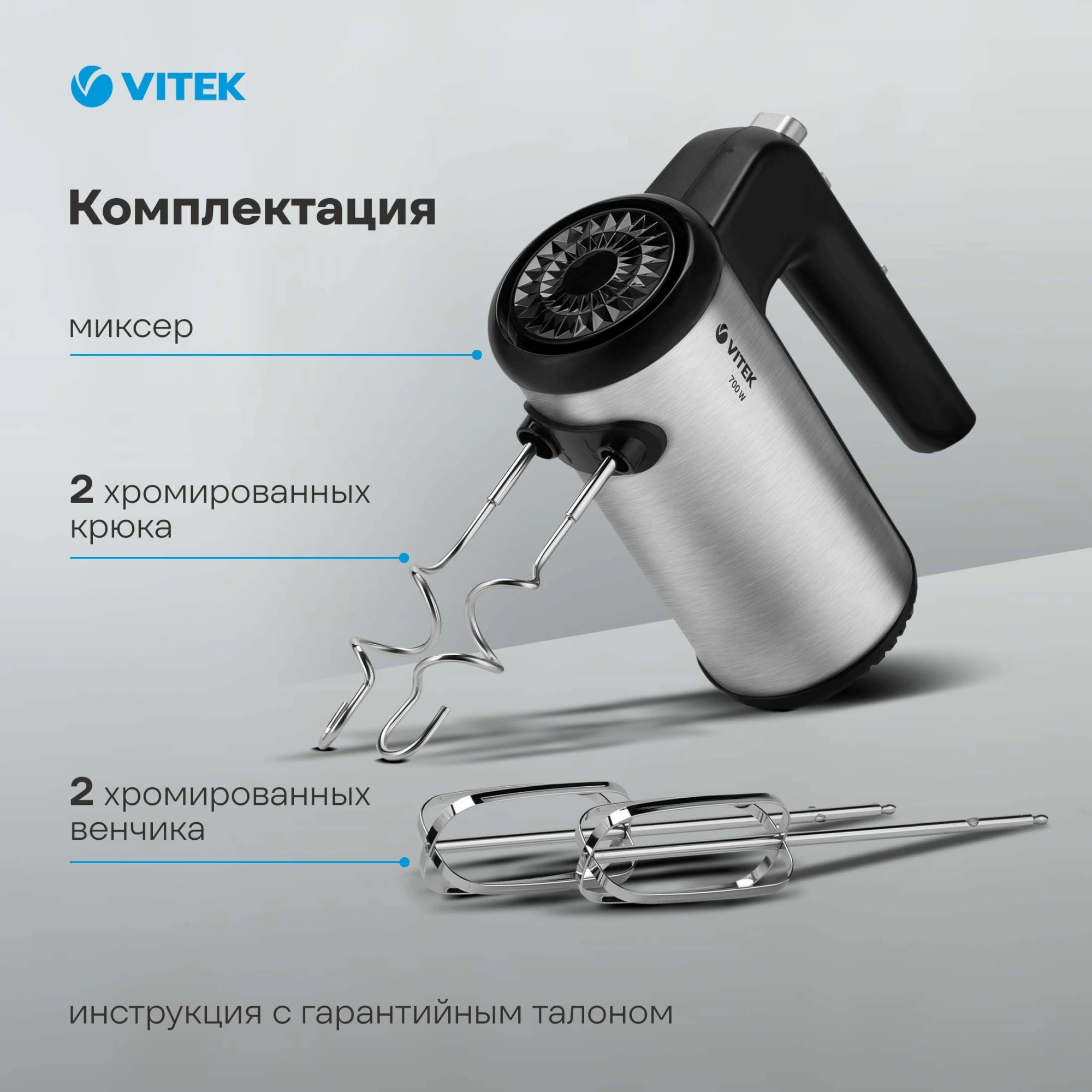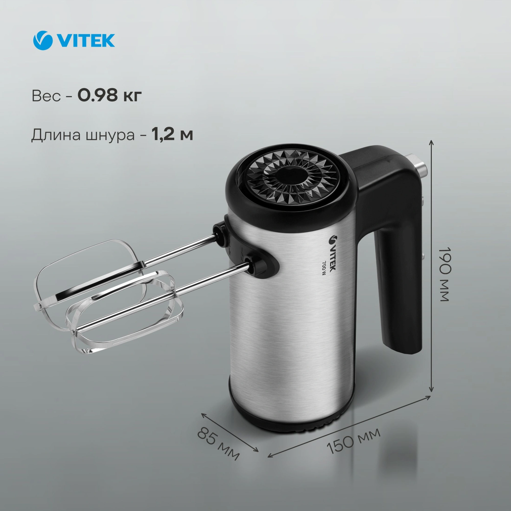Миксер VITEK VT-1411 с максимальной мощностью 700 Вт позволит взбить в крепкую пену яичные белки, приготовить воздушный мусс или нежнейший крем для торта, а также идеально вымесить тесто. Прибор имеет 5 скоростных режимов и режим «Турбо», который поможет быстро справиться с самой густой массой. В комплект входят венчики для взбивания и насадки для теста из хромированной стали, гарантирующей прибору долгий срок службы. Менять насадки очень просто — легким нажатием на специальную кнопку.