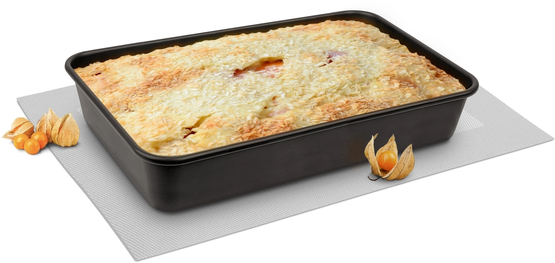 Преимущество: Рельефное дно в виде алмазной сетки (для лучшей циркуляции воздуха и легкого извлечения готового изделия). Внутреннее и внешнее а/п покрытие Xynflon. Использование: Для использования в духовке. Максимальная температура нагрева – 230°С. Рекомендуется ручная мойка
