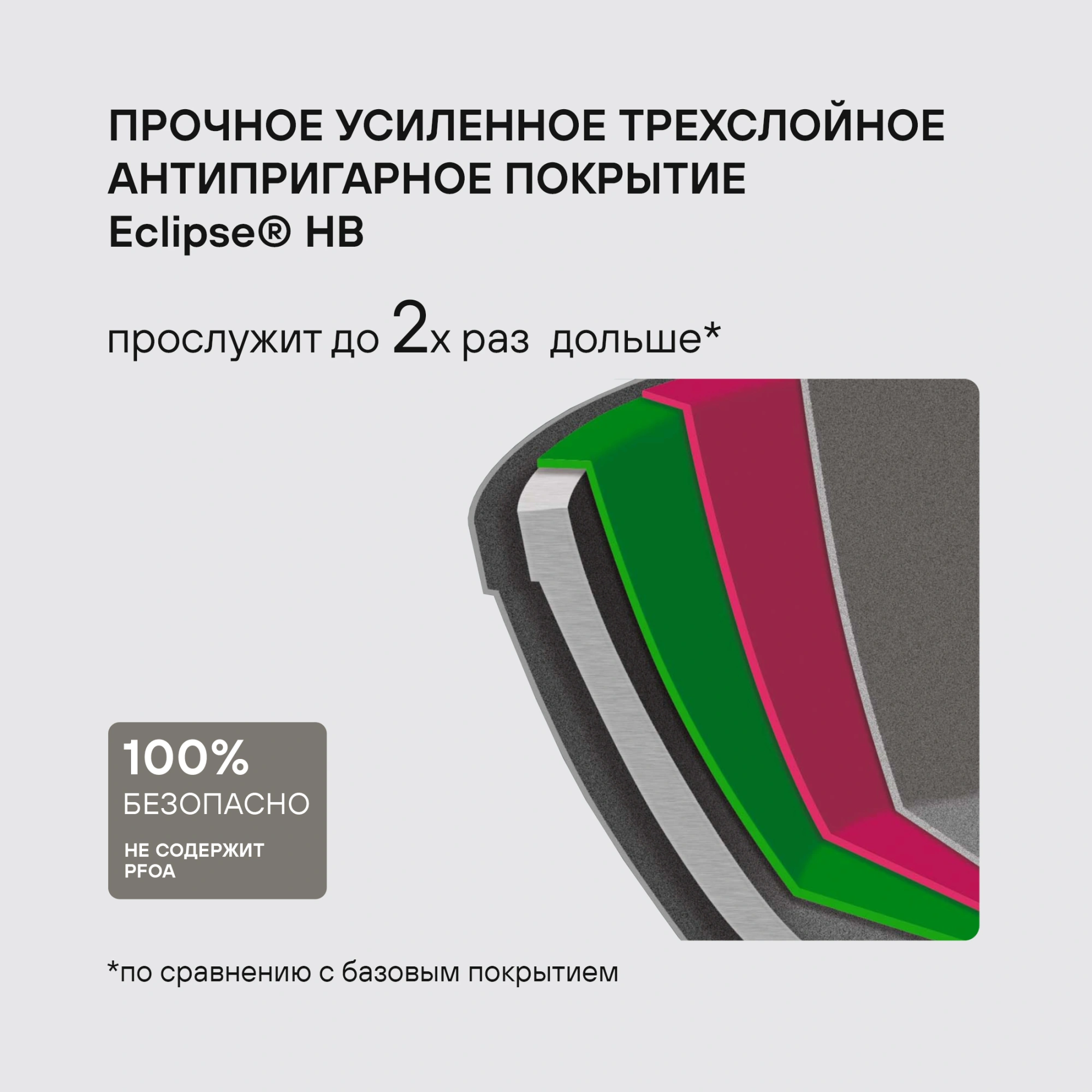 Аксессуары: из бакелита, с покрытием Soft Touch. Преимущества: специальное внешнее термостойкое покрытие для легкого ухода; Eclipse® HB – усиленное трехслойное антипригарное покрытие для интенсивного использования. Упаковка: картонный рукав.