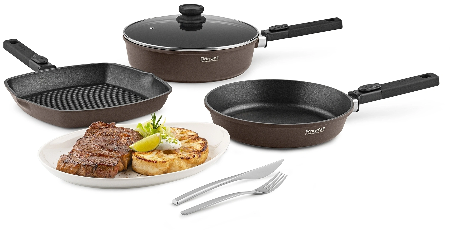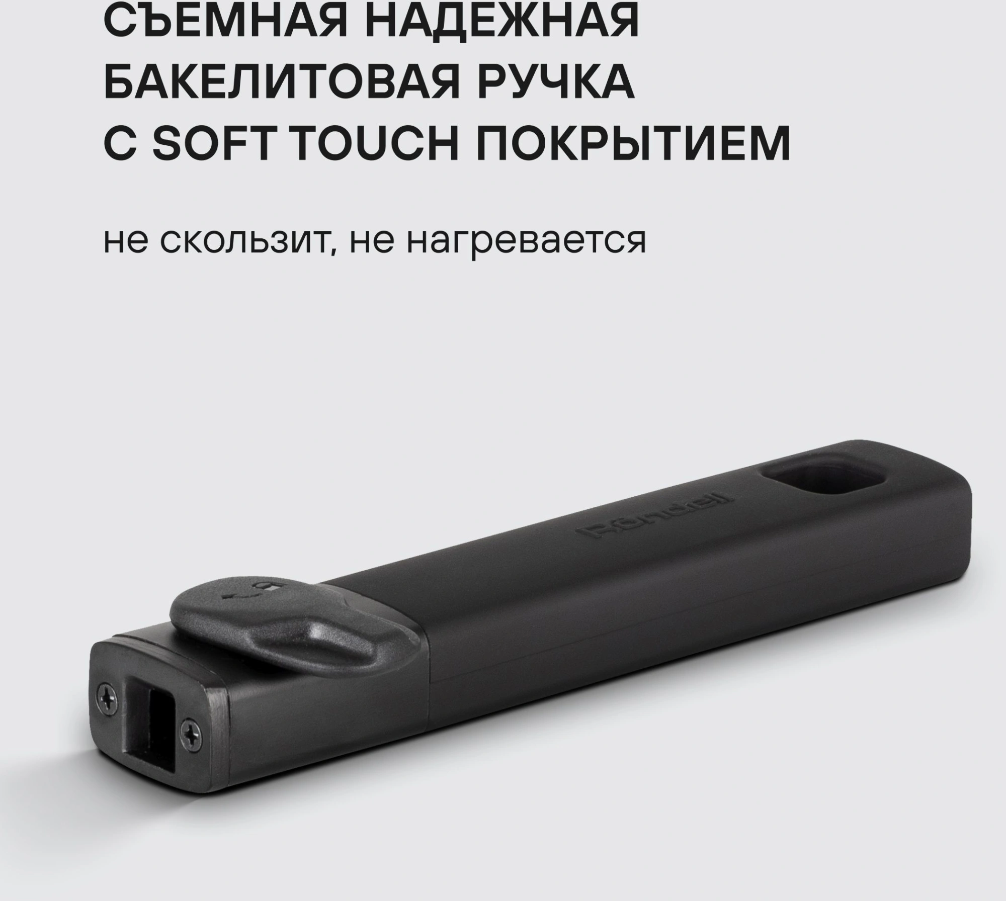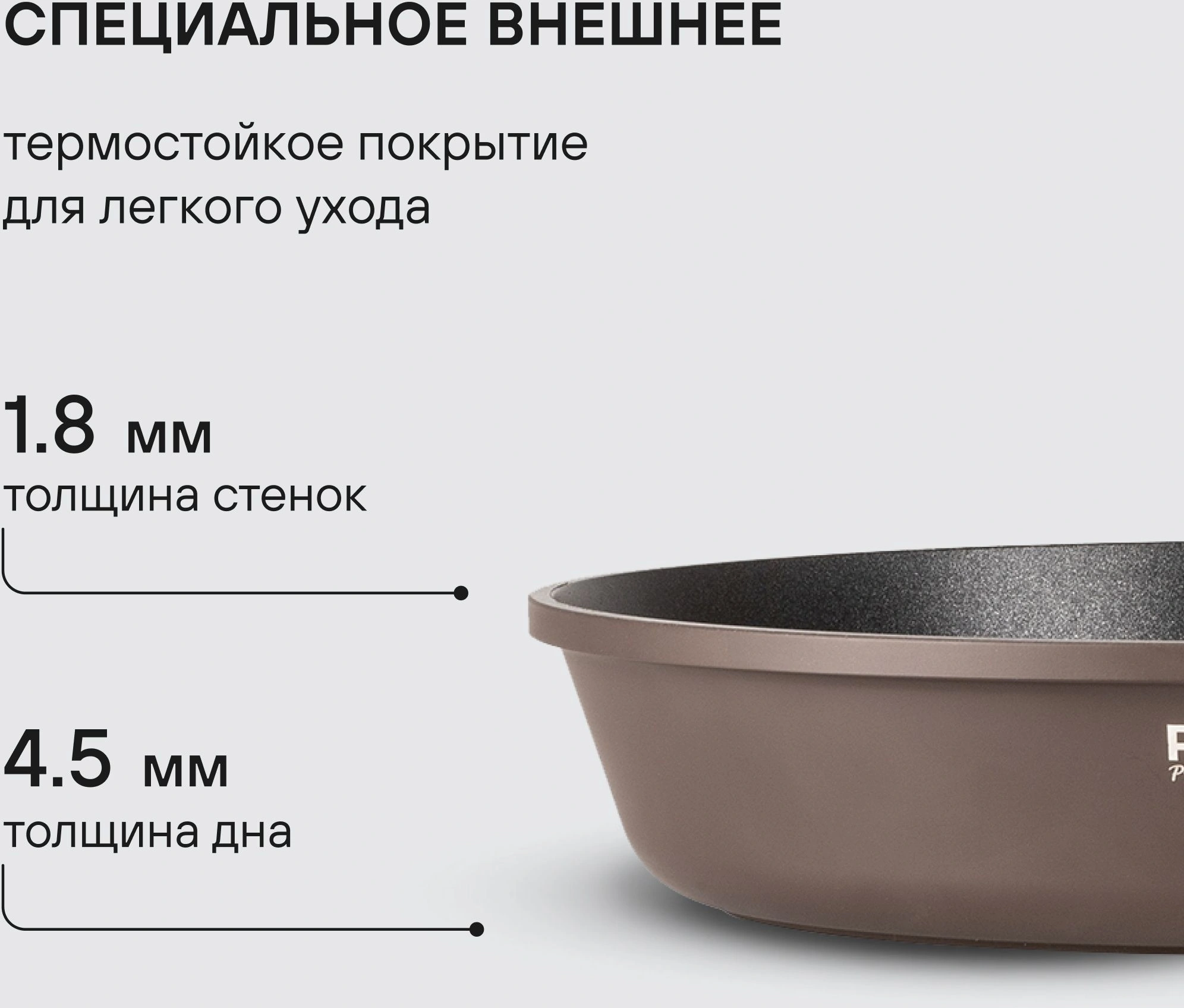 Аксессуары: эргономичные бакелитовые ручки с soft touch покрытием и силиконовыми вставками, препятствующими скольжению. Преимущества: специальное внешнее термостойкое покрытие для легкого ухода; Xylan® Plus – двухслойное, долговечное антипригарное покрытие для интенсивного использования.
