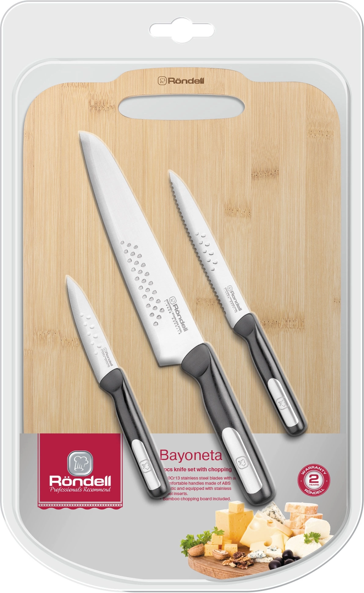 Лезвия ножей Bayoneta изготовлены из высококачественной нержавеющей стали, что гарантирует им длительной срок службы и беспрецедентную надежность. Благодаря инновационному решению — специальным выемкам на лезвиях — продукты не прилипают к ним в процессе использования (эффект «антистик»).