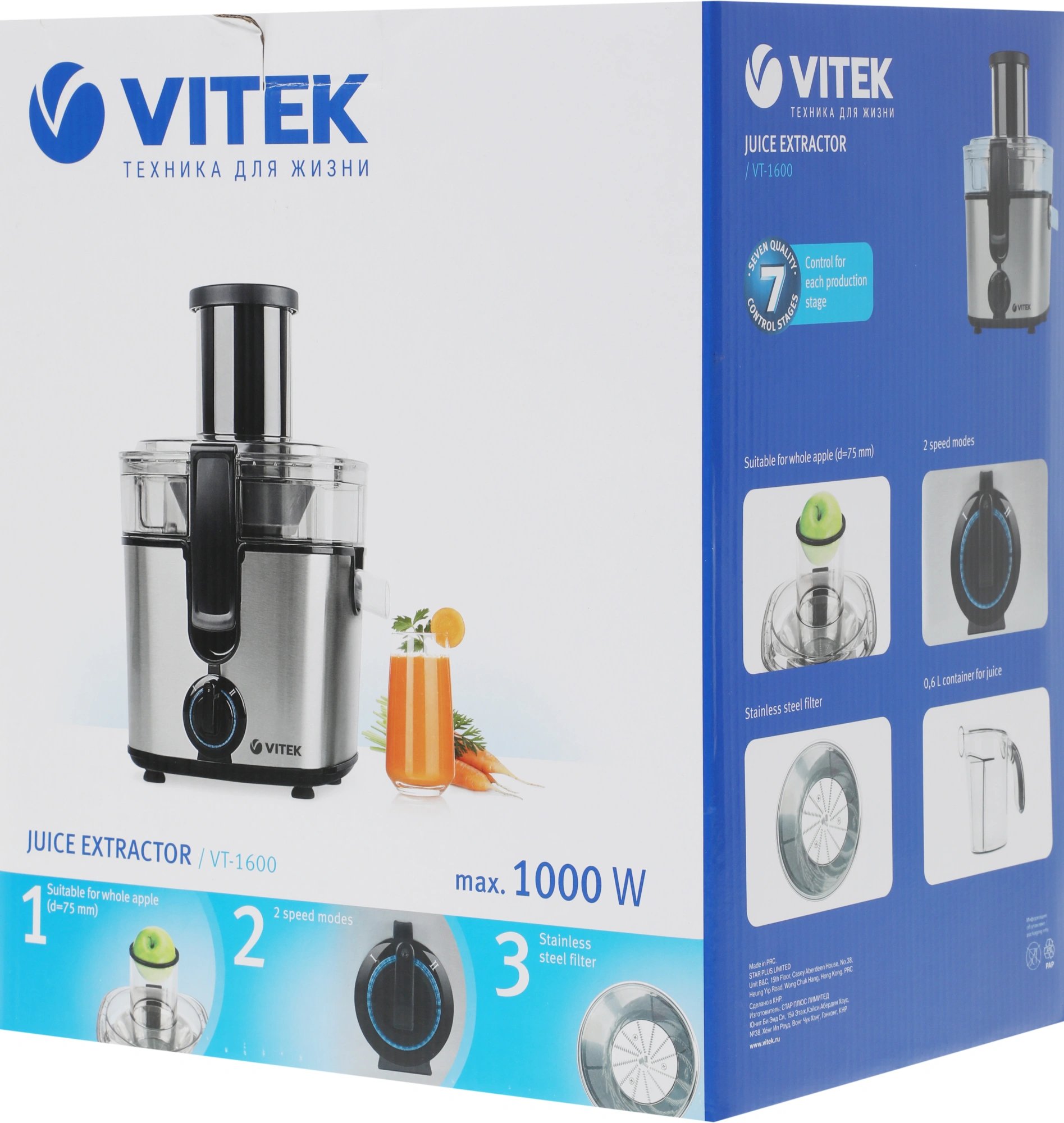 Чтобы каждое утро в вашем доме было не только добрым, но и полезным, приобретите соковыжималку VITEK VT-1600 с максимальной мощностью 1000 Вт. Теперь вы сможете без проблем готовить напитки для себя и всей семьи, причем легко и быстро. Соковыжималка VITEK VT-1600 отличается высокой надежностью и долговечностью, ведь корпус и фильтр прибора изготовлены из качественной нержавеющей стали. Пользоваться устройством очень удобно: диаметр входного отверстия составляет 75 мм, что позволяет получать сок из целого яблока, а значит, вам не придется измельчать фрукты перед началом процесса. Комфорту в использовании способствуют также прорезиненные нескользящие ножки и довольно вместительный контейнер для сока объемом 600 мл. По желанию, вы можете выбрать любой из двух скоростных режимов работы прибора. Купите соковыжималку VITEK VT-1600 и готовьте вкусные полезные напитки так часто, как того захочется!