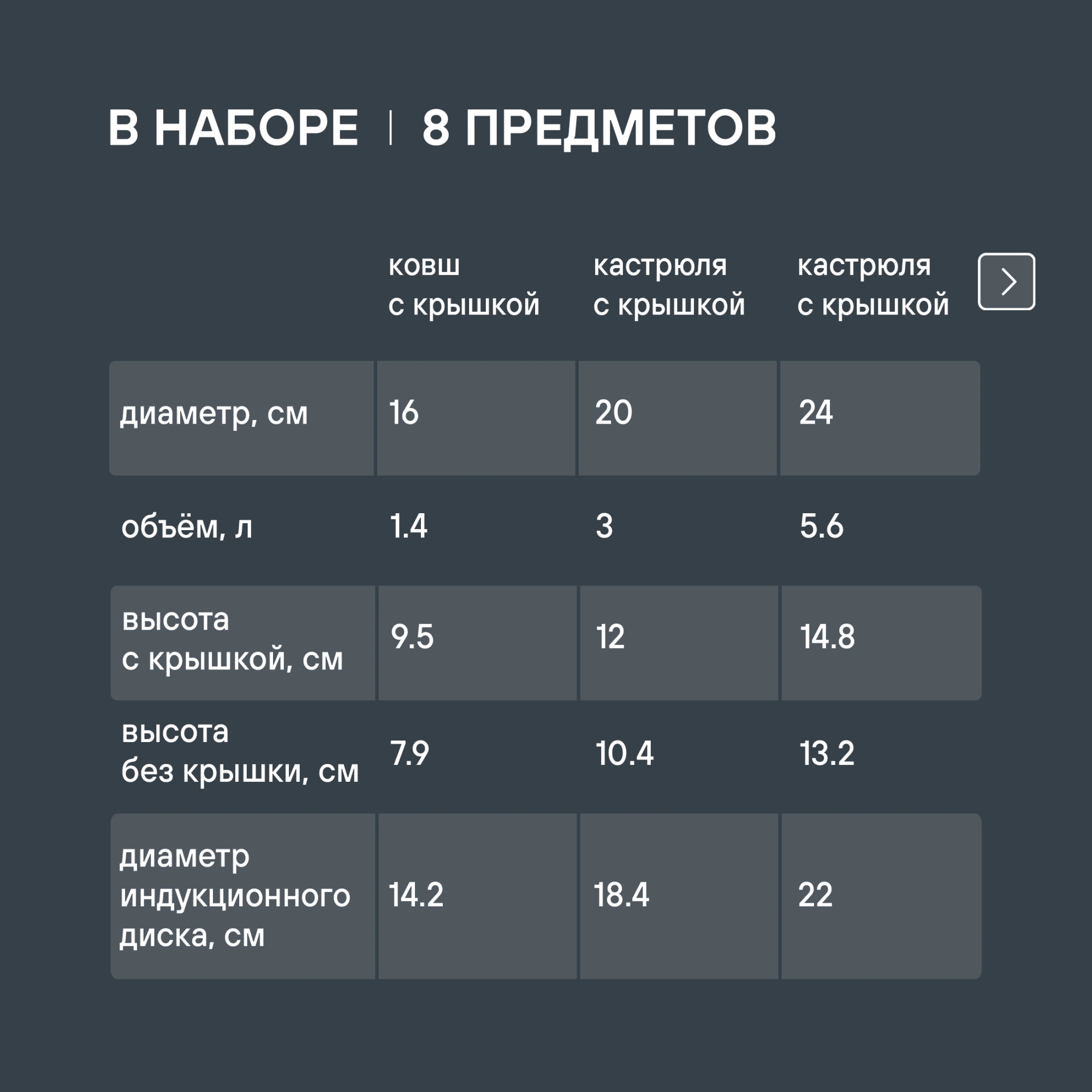 Кастрюли 20см (3,0л), 24см (5,6л), ковш 16см (1,4л) со стеклянными крышками, сотейник 24см, сковорода 20см