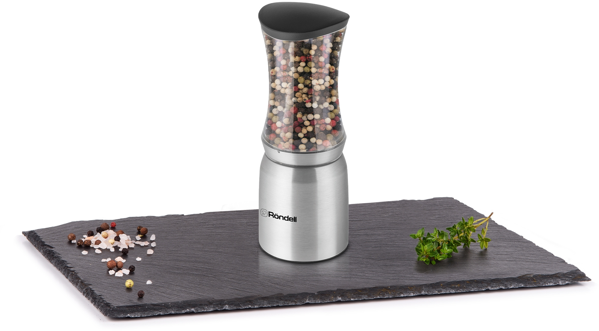 Материал: акрил, нержавеющая сталь. Керамический механизм помола. Не оставляет следов специй на столе: защитная шторка открывается только во время помола. Прозрачный контейнер для специй для морской соли и перца горошком. Регулировка степени помола. Суперобъемный контейнер – 105 гр перца горошком