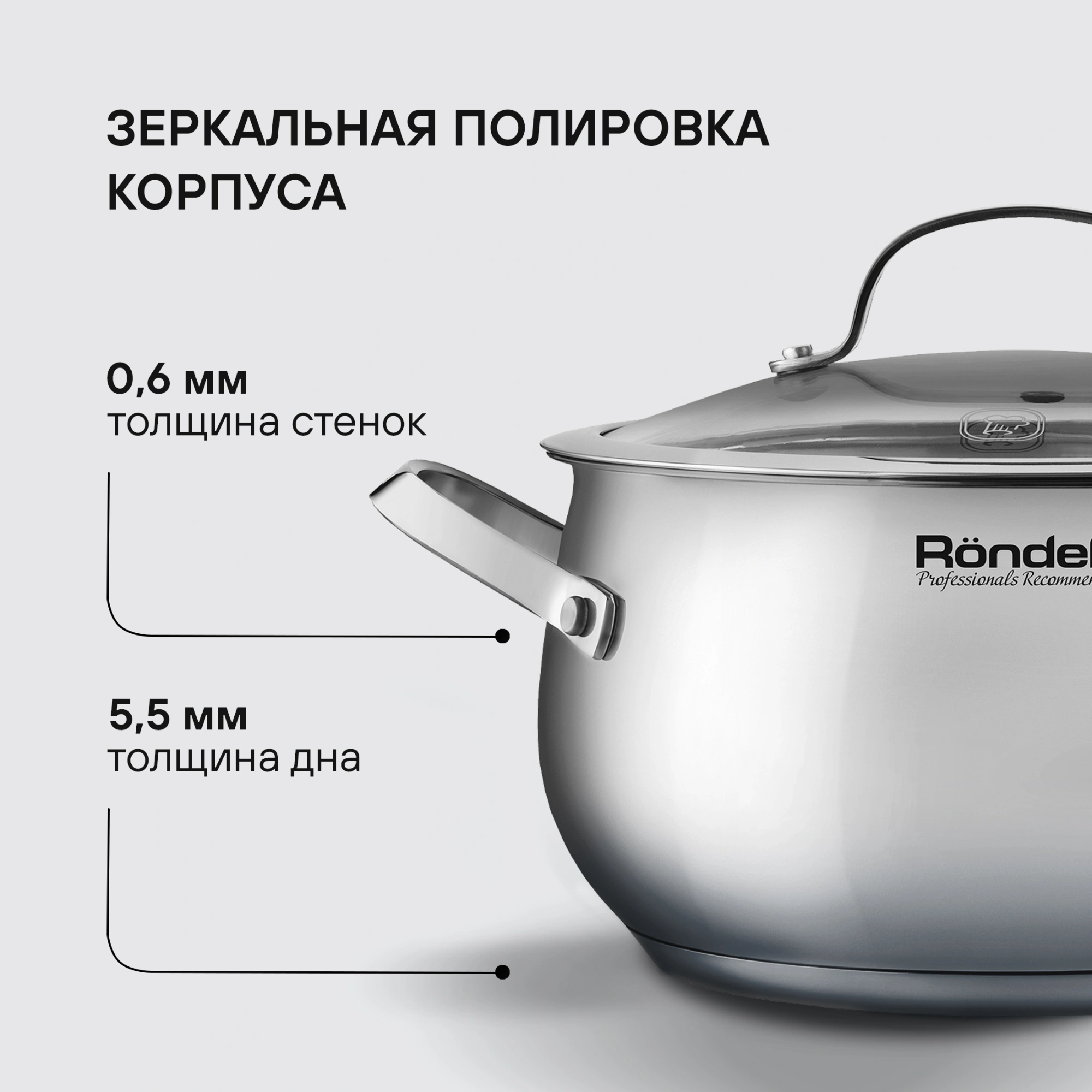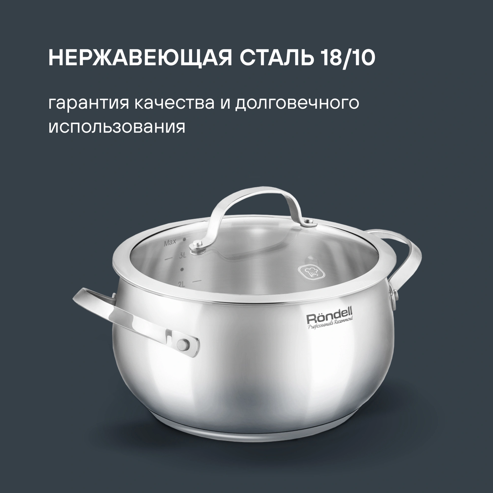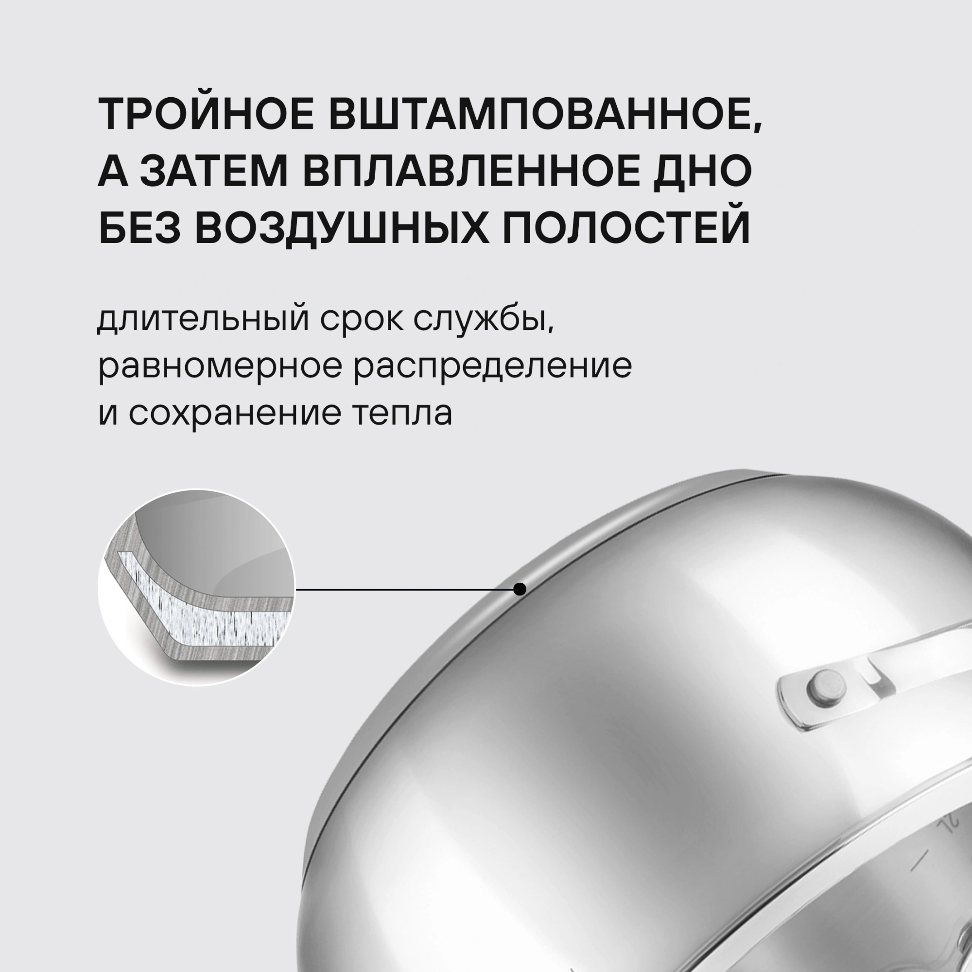 Материал: высококачественная нержавеющая сталь 18/10. Технология: тройное вштампованное, а затем вплавленное дно без воздушных полостей. Материал крышки: термостойкое стекло. Аксессуары: изящные, из нержавеющей стали. Преимущества: округлая форма корпуса.