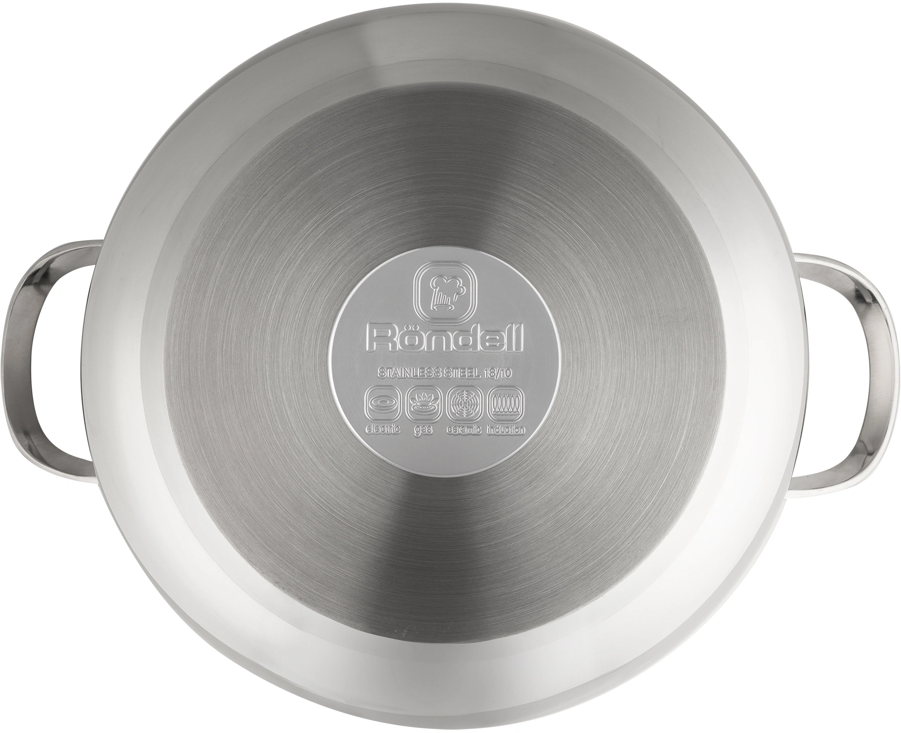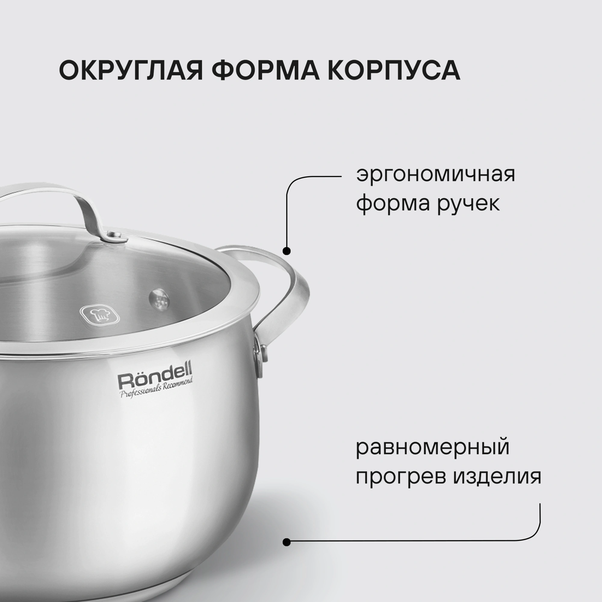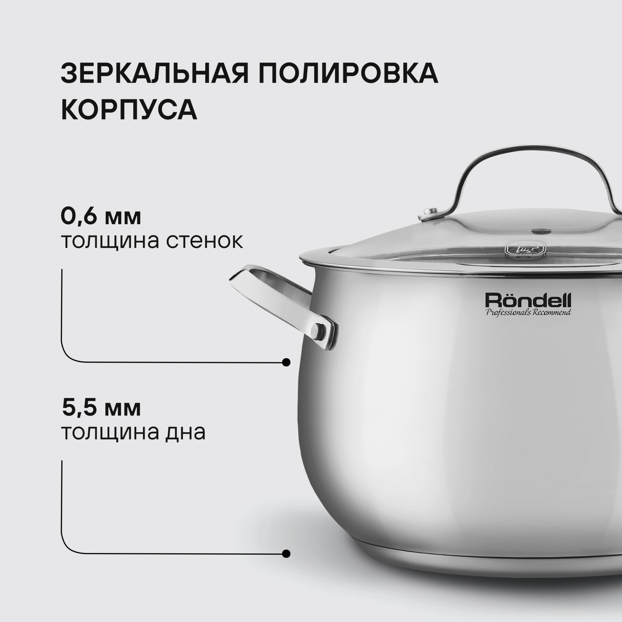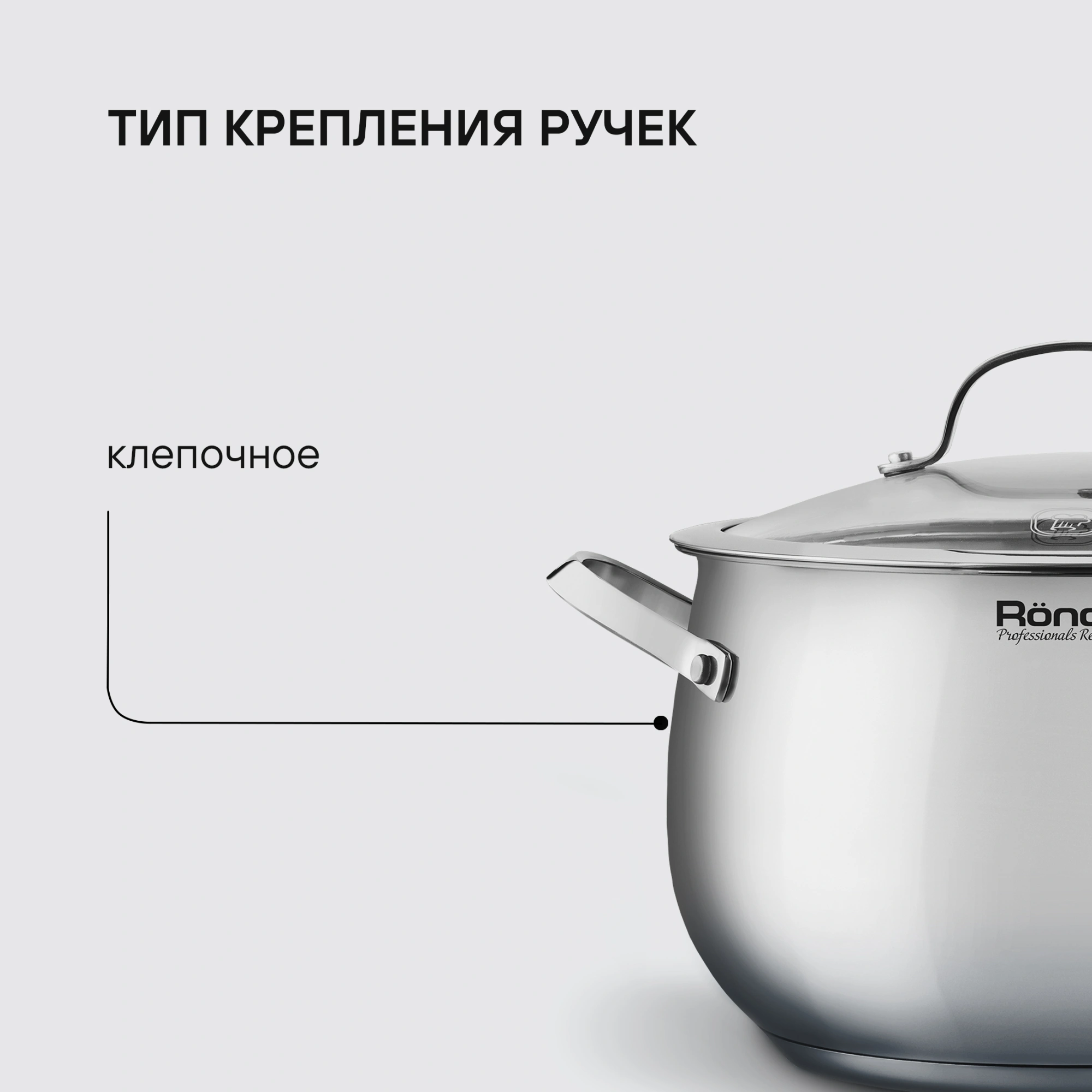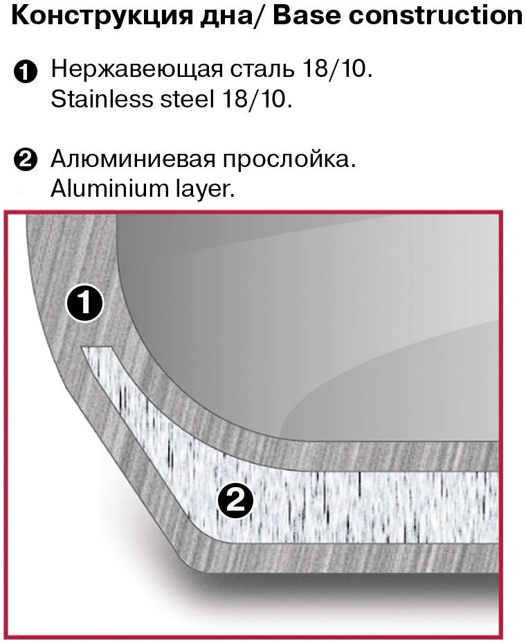Материал: высококачественная нержавеющая сталь 18/10. Технология: тройное вштампованное, а затем вплавленное дно без воздушных полостей. Материал крышки: термостойкое стекло. Аксессуары: изящные, из нержавеющей стали. Преимущества: округлая форма корпуса.