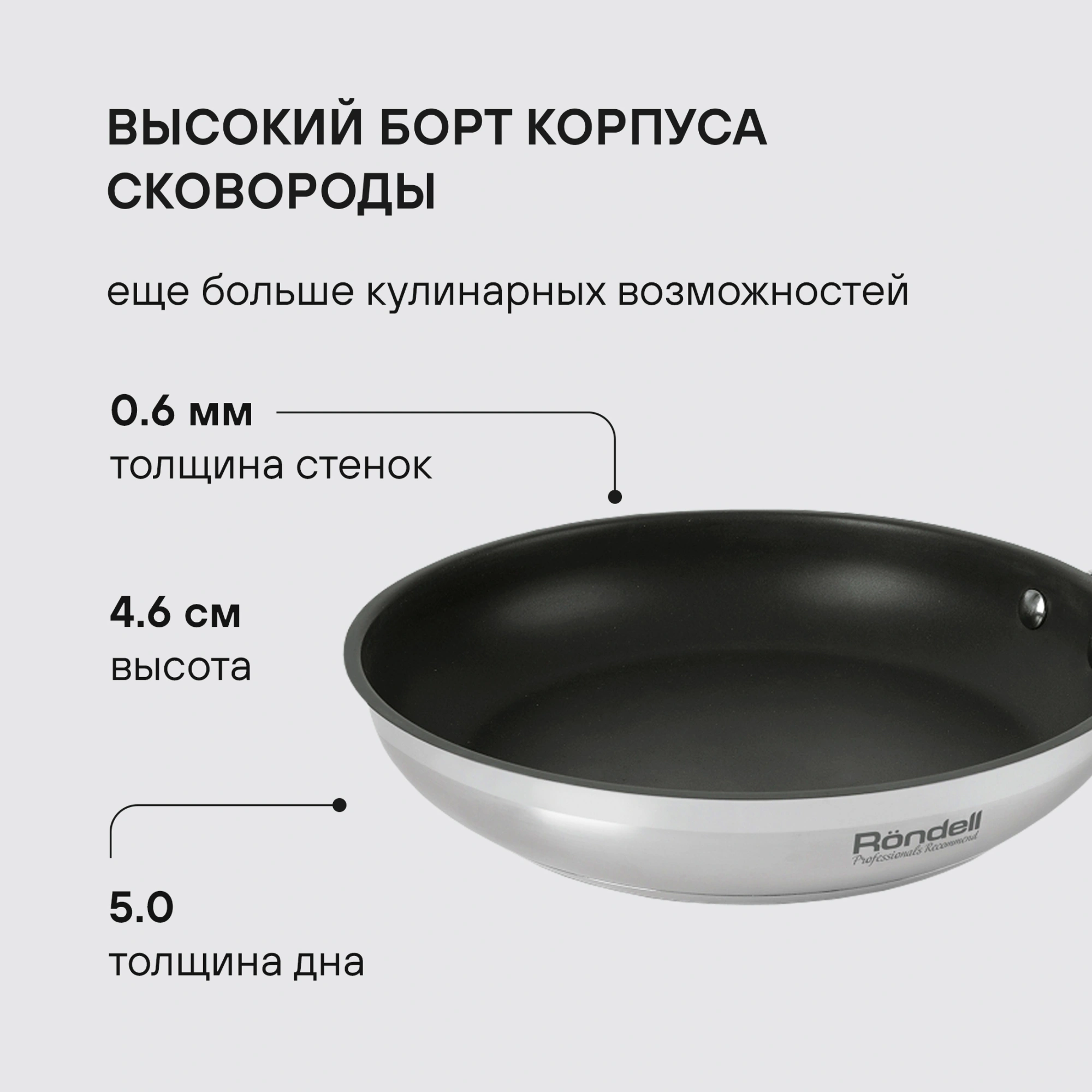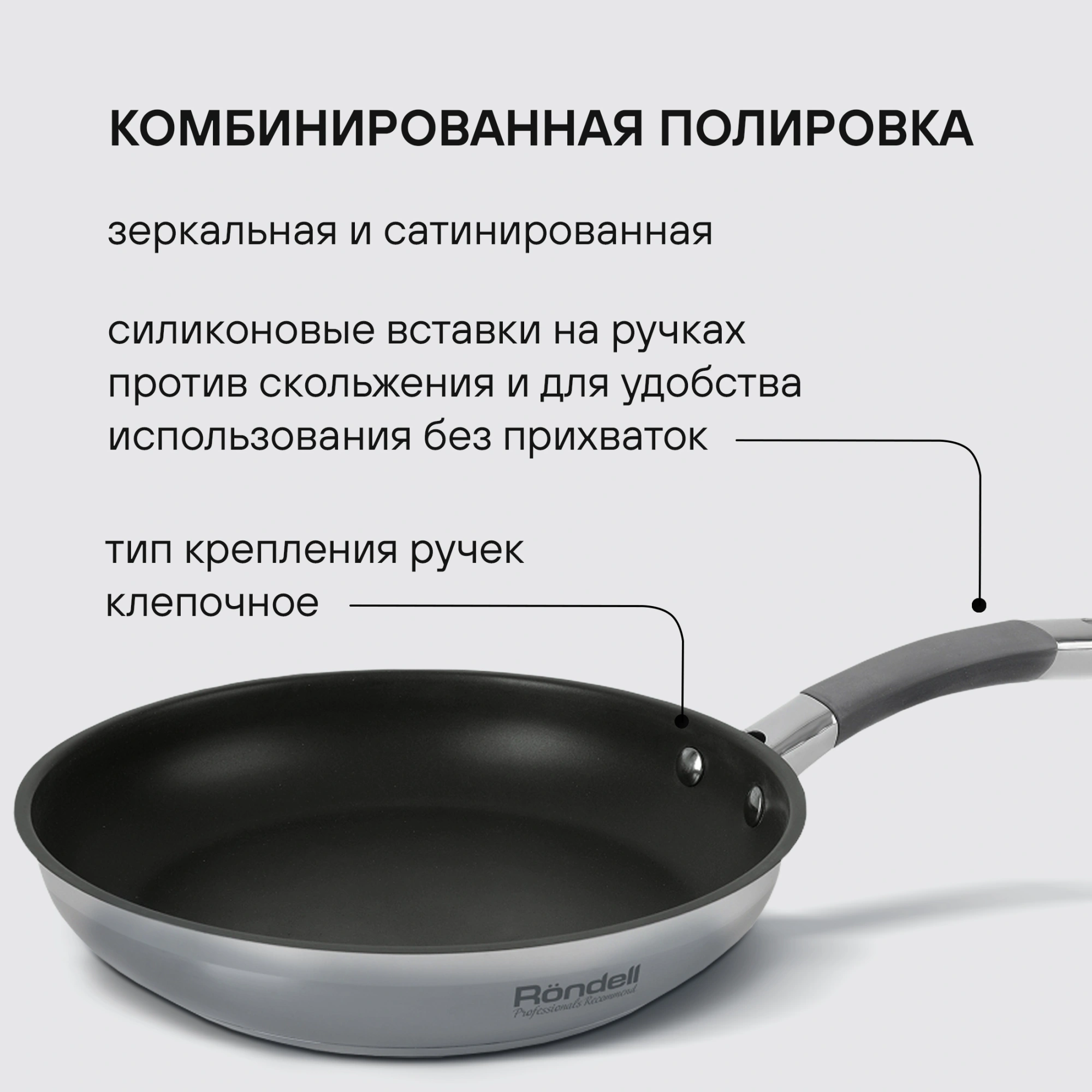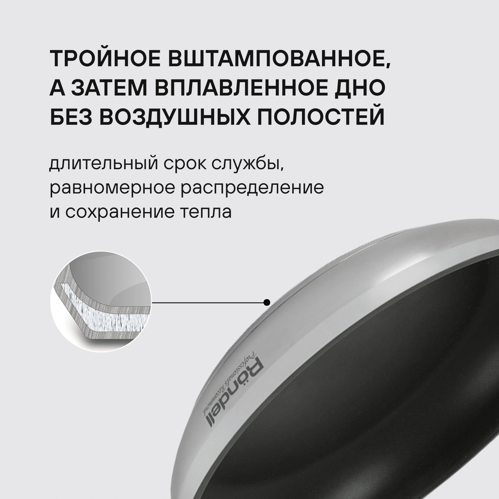 Технология: тройное вштампованное, а затем вплавленное дно без воздушных полостей. Аксессуары: удобные комбинированные: нержавеющая сталь и силикон. Преимущества: комбинированная полировка корпуса; Eclipse® - усиленное трехслойное антипригарное покрытие для интенсивного использования.