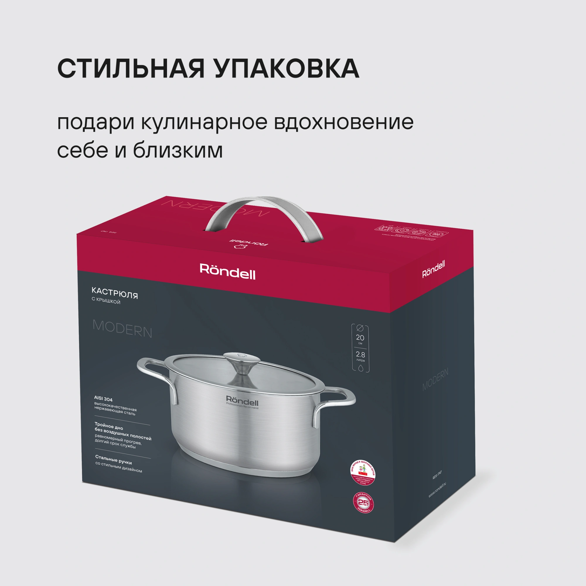 Посуда из высококачественной нержавеющей стали привлекает внимание эффектным дизайнерским решением: гармоничным сочетанием матированной полировки корпуса и зеркальной — аксессуаров. Рабочие свойства на высоте: равномерный прогрев продуктов, что гарантирует блюдам безупречное приготовление.
