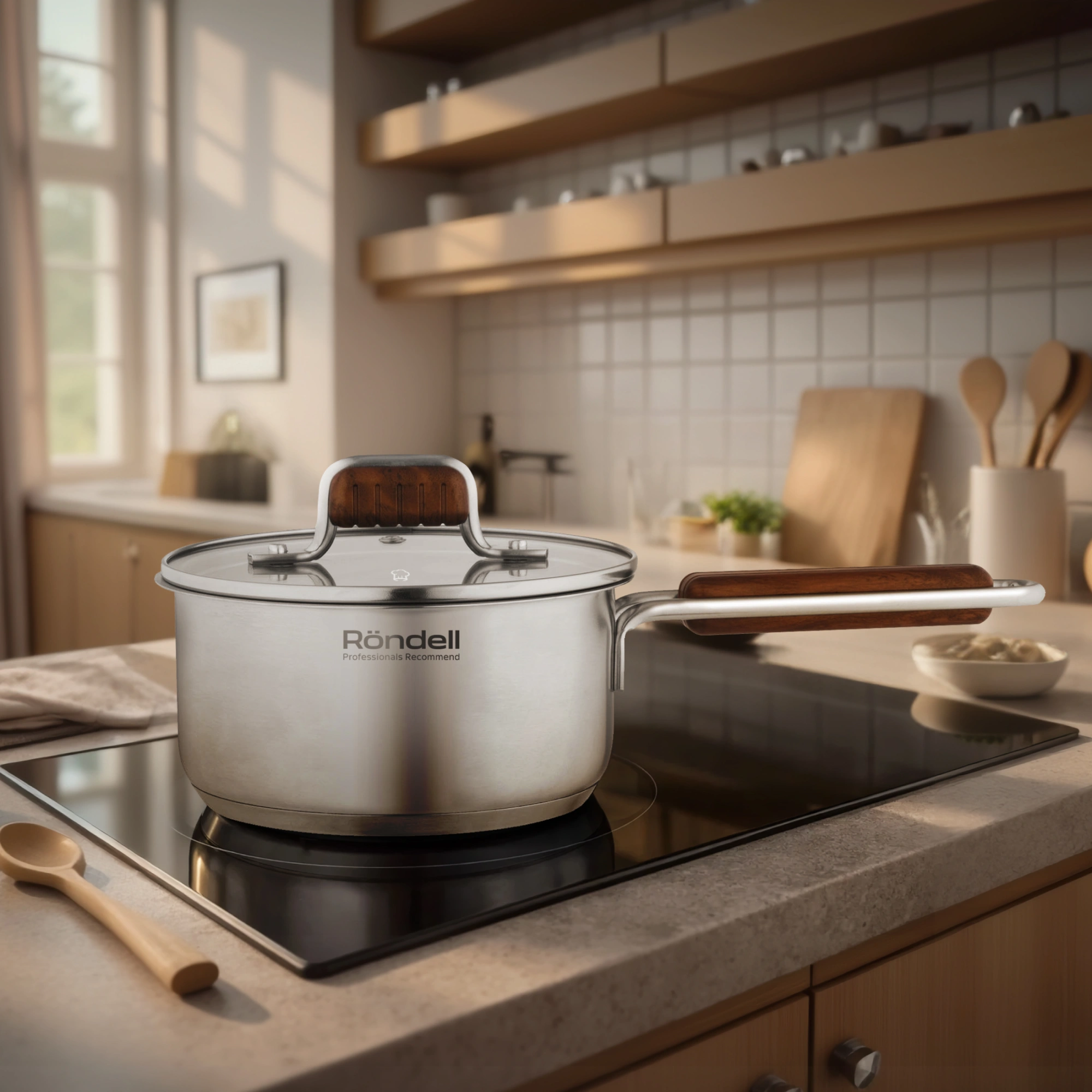 Технология: тройное вштампованное, а затем вплавленное дно без воздушных полостей. Аксессуары: оригинальная конструкция ручек - комбинация стали и бакелита. Преимущества: эргономичная форма ручек. Плоская крышка из термостойкого стекла с паровыпуском и широким металлическим ободом.