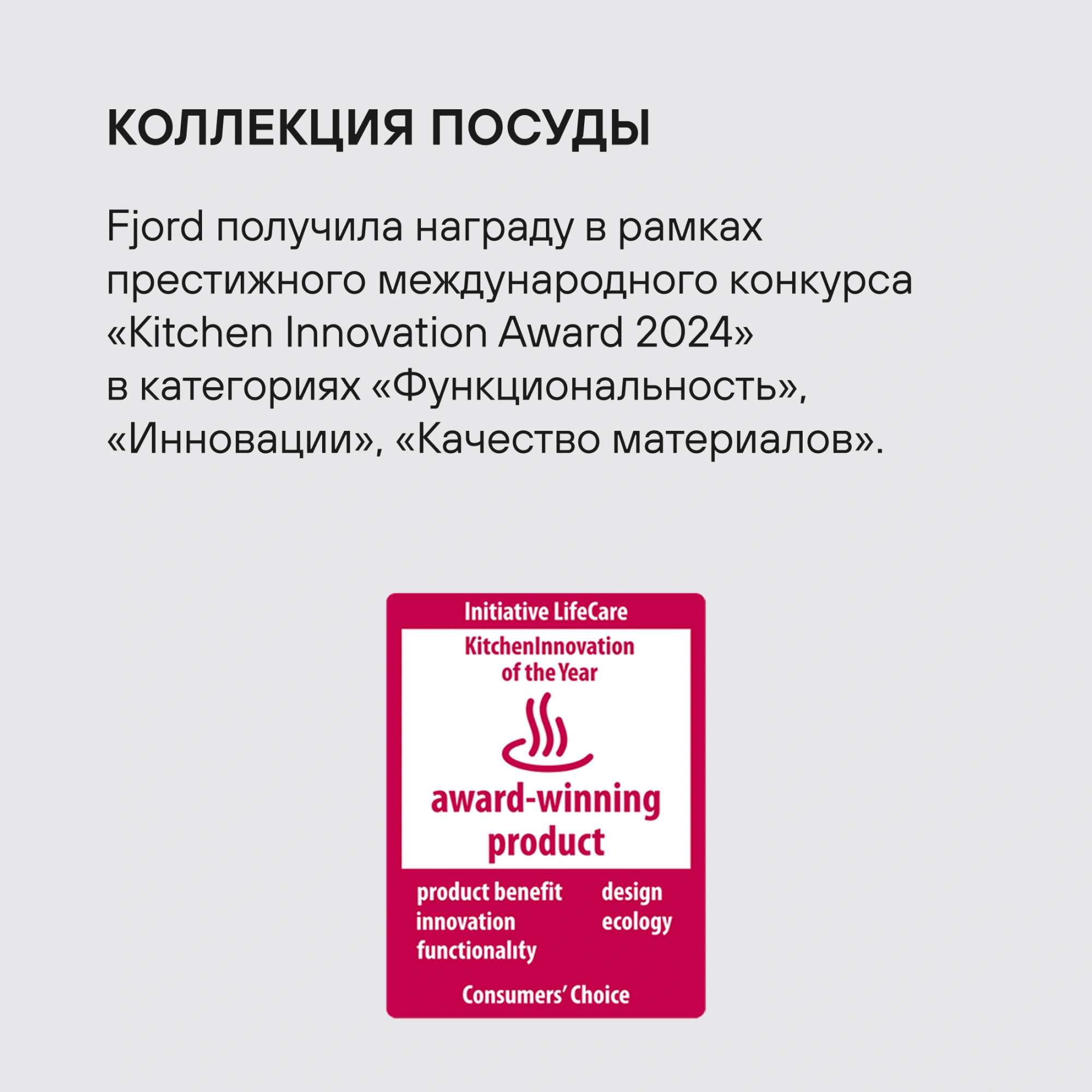 Коллекция посуды Fjord получила награду в рамках престижного международного конкурса «Kitchen Innovation Award 2024» в категориях «Функциональность», «Инновации», «Качество материалов». Пользоваться посудой удобно и безопасно благодаря бакелитовым вставкам на ручках стилизованных под дерево.
