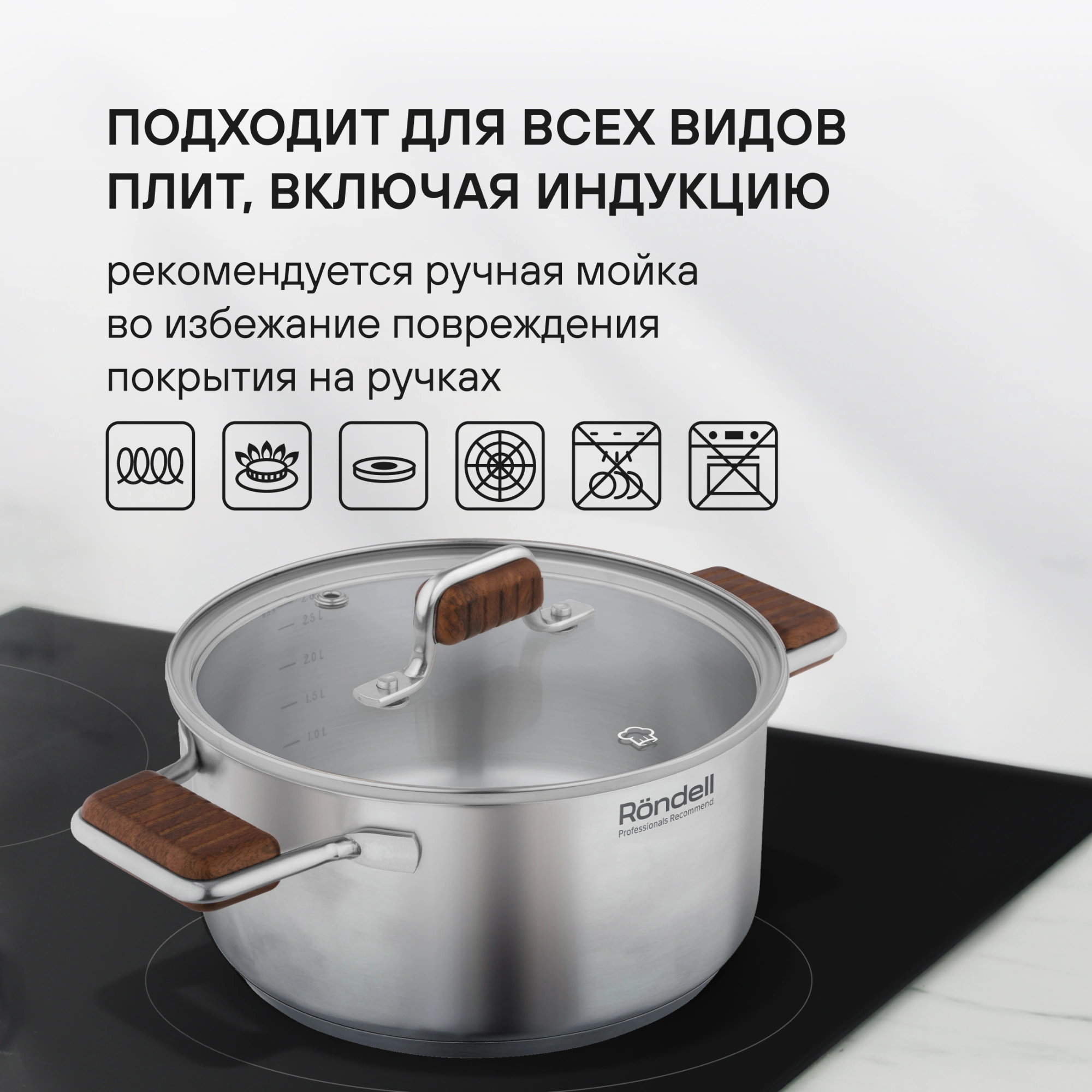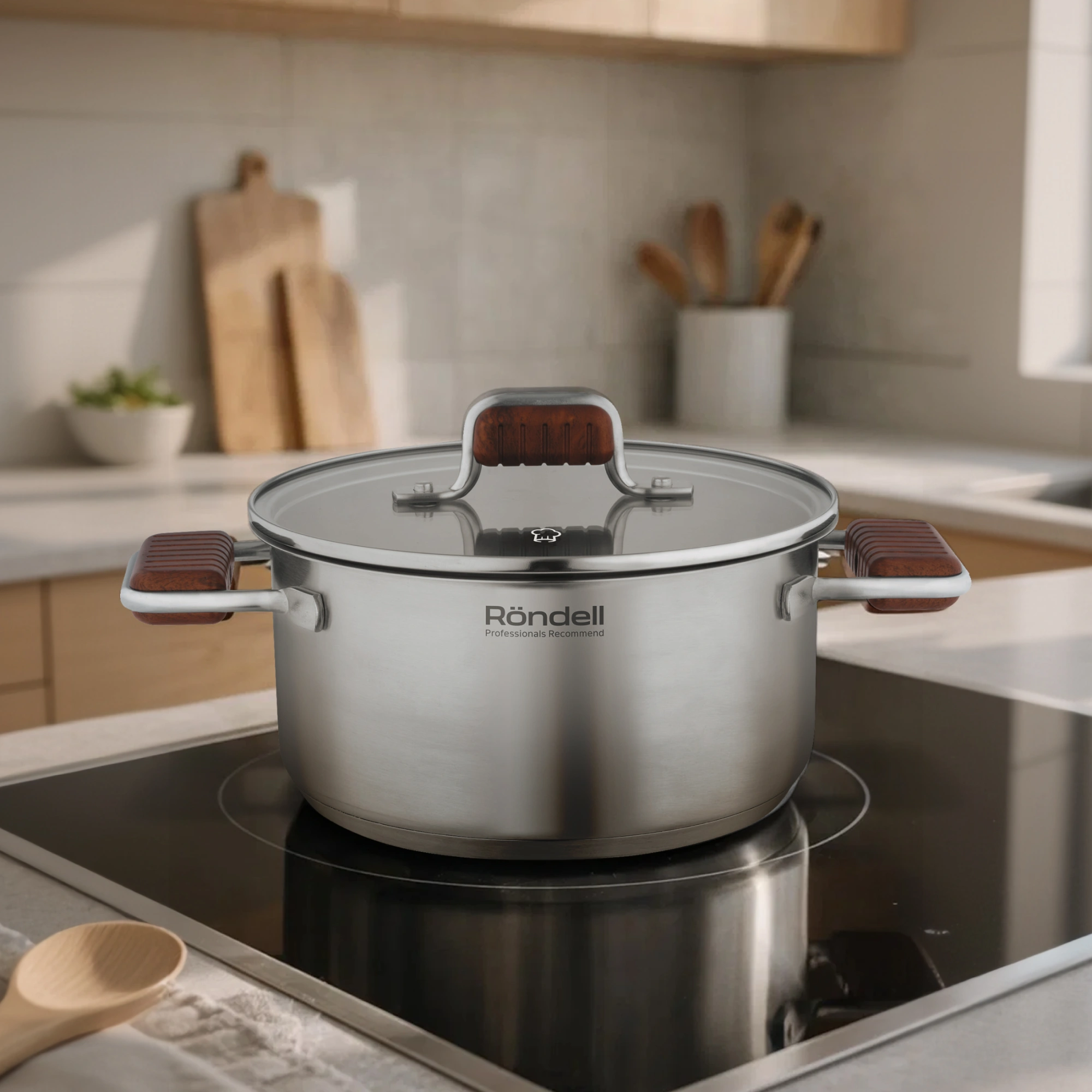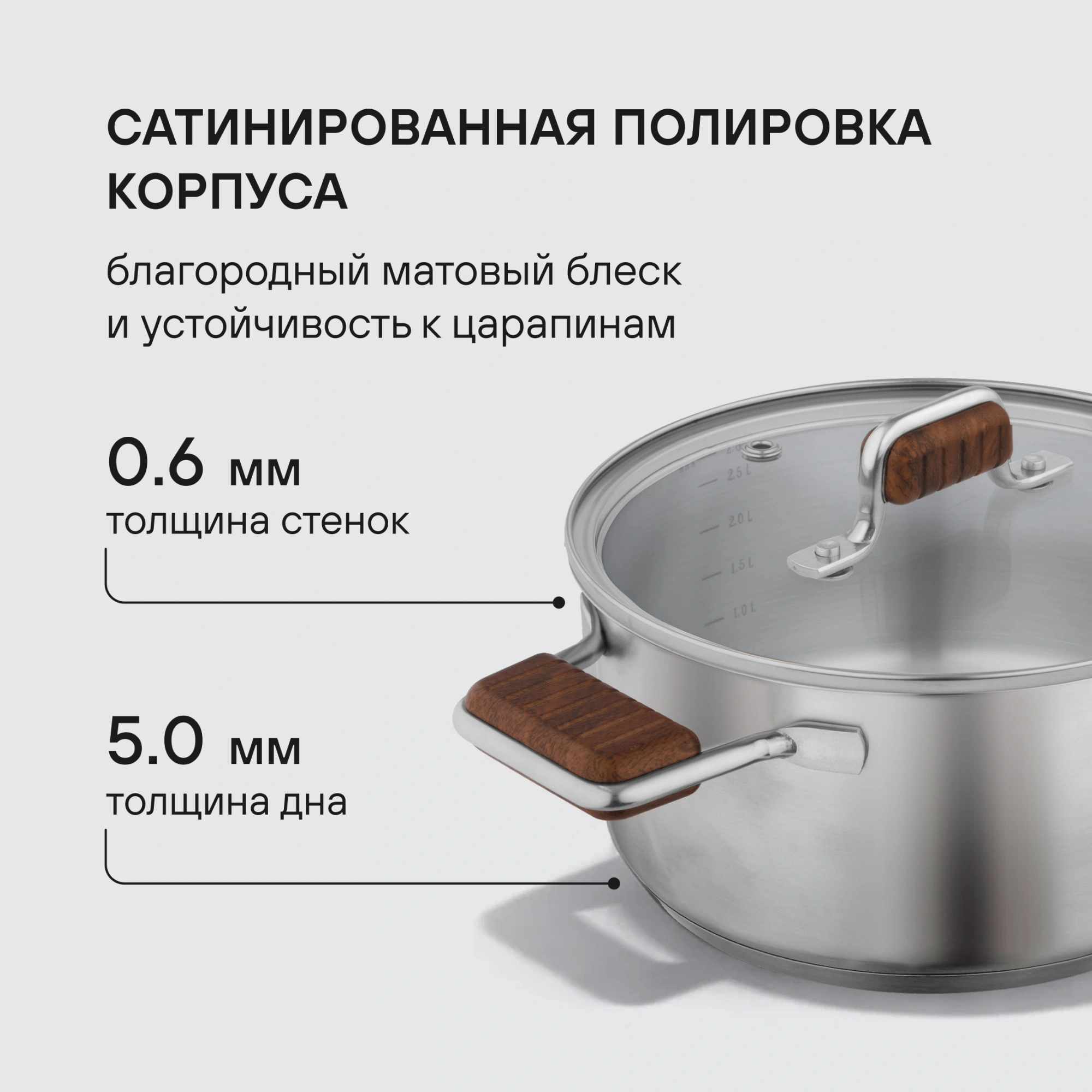 Технология: тройное вштампованное, а затем вплавленное дно без воздушных полостей. Оригинальная конструкция ручек - комбинация стали и бакелита. Преимущества: эргономичная форма ручек; Плоская крышка из термостойкого стекла с паровыпуском и широким металлическим ободом.
