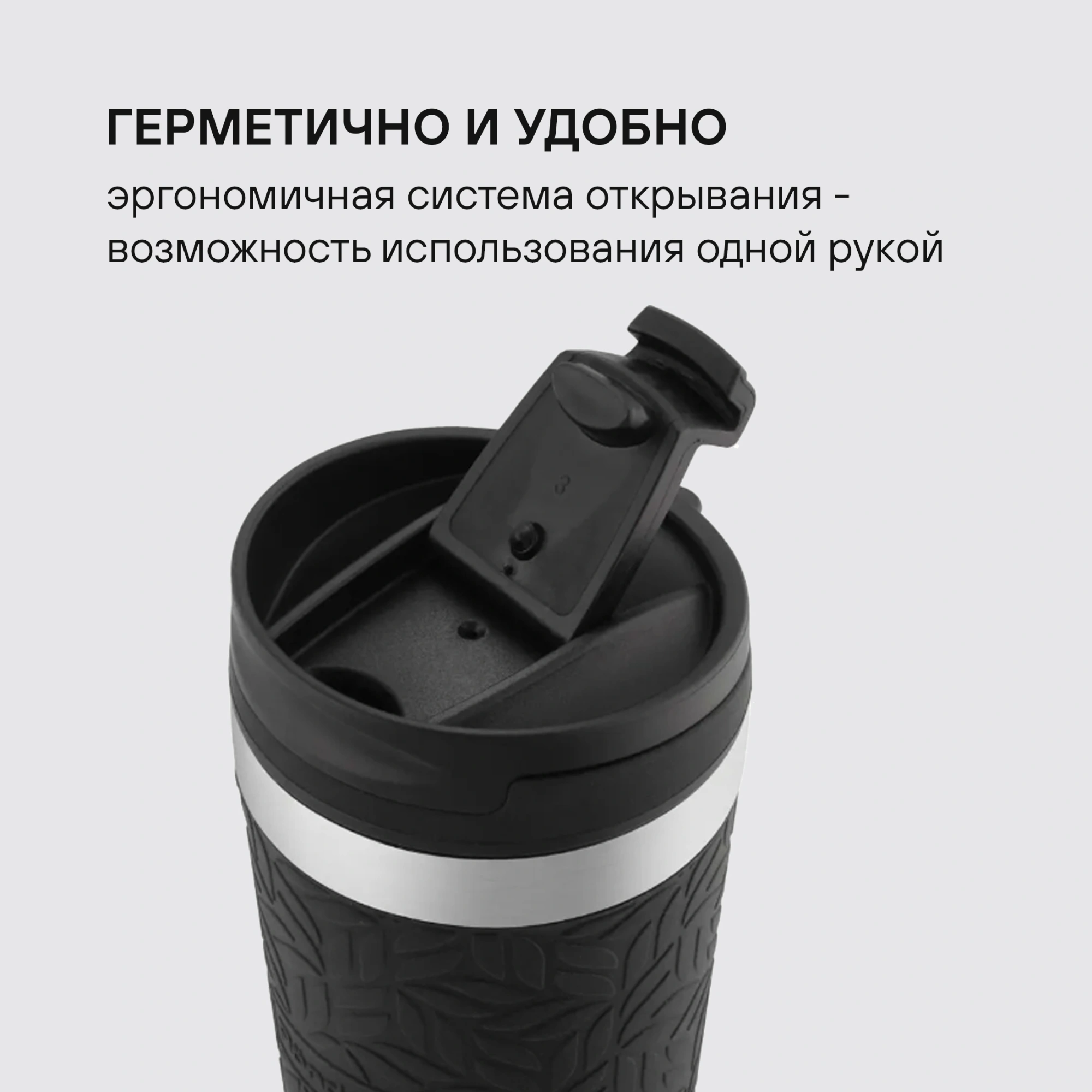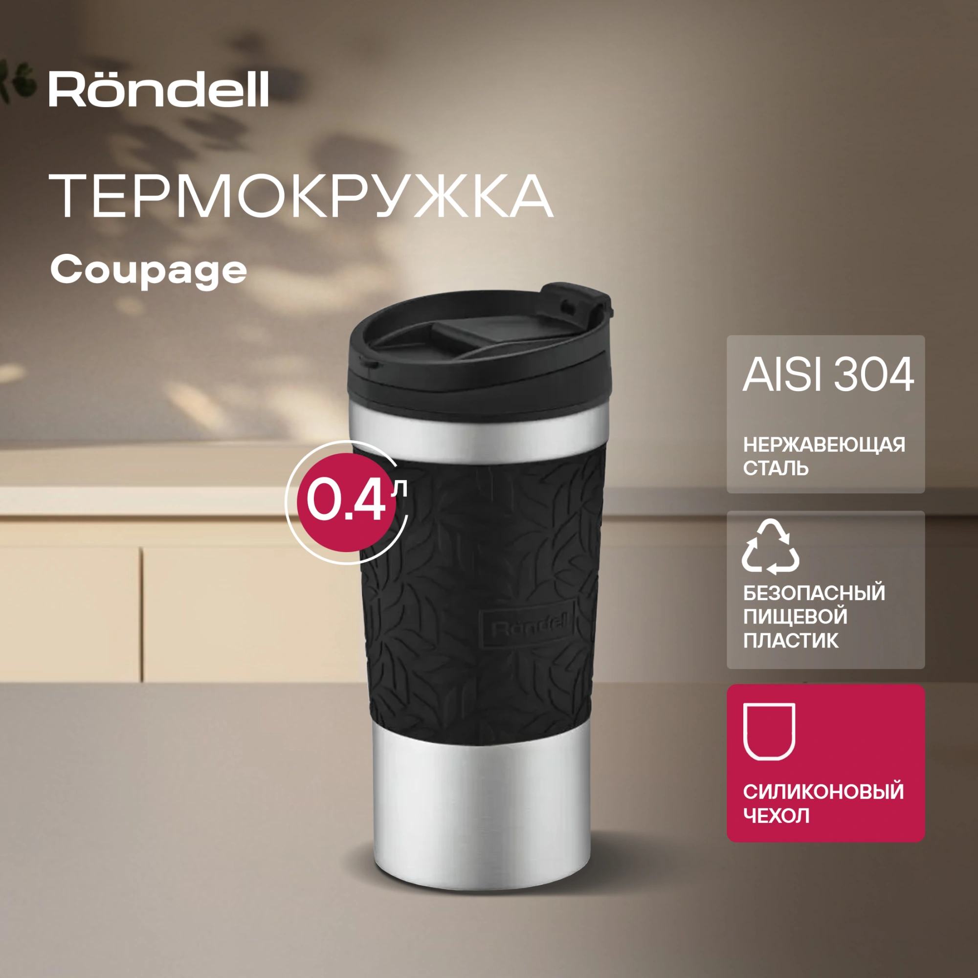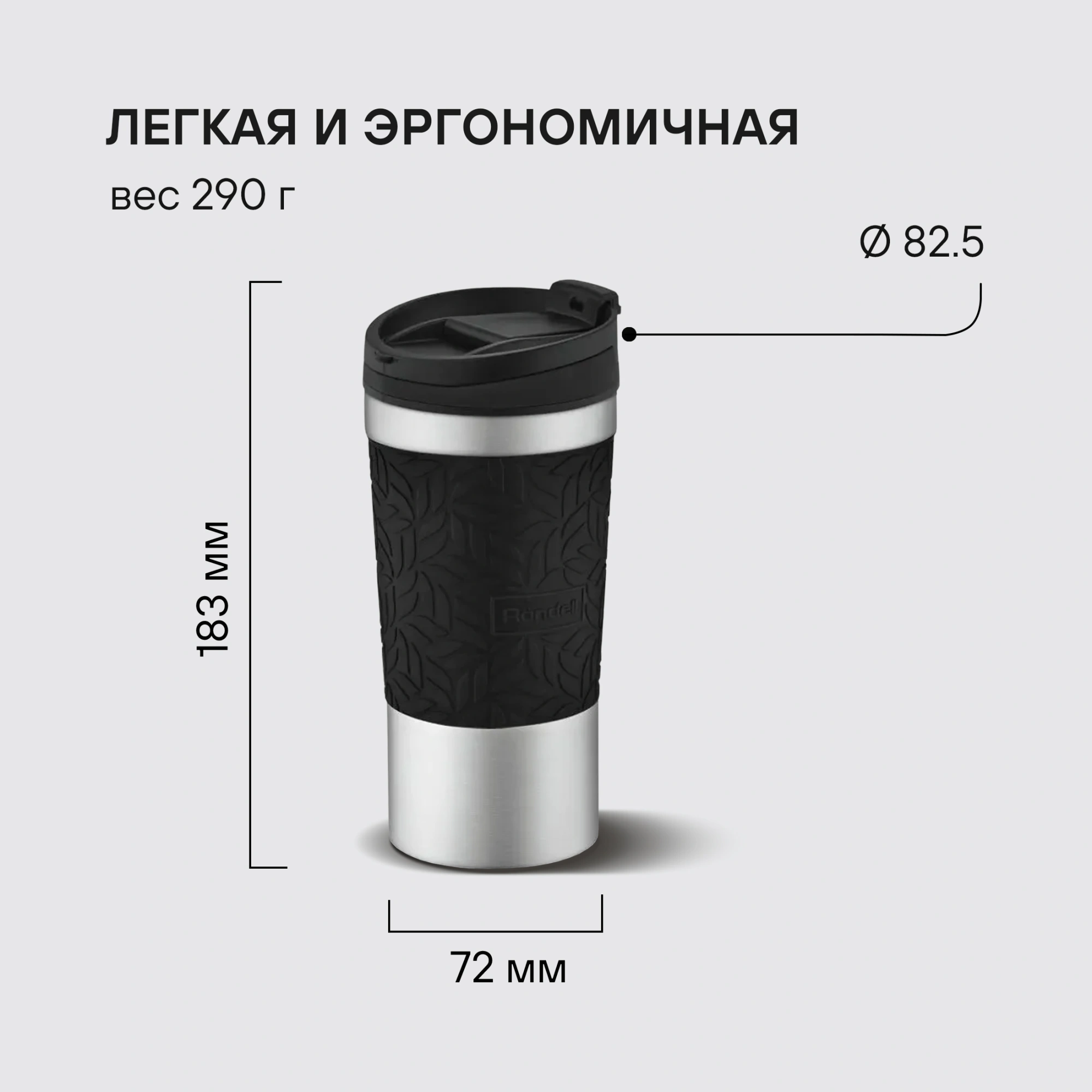 Преимущество: силиконовый чехол на корпусе с уникальным дизайном Rondell – удобно держать, не выскальзывает из рук. Двойные стенки корпуса и вакуумный слой с медной металлизацией внутренней колбы для лучшего сохранения температуры напитка. Эргономичная система открывания одной рукой.