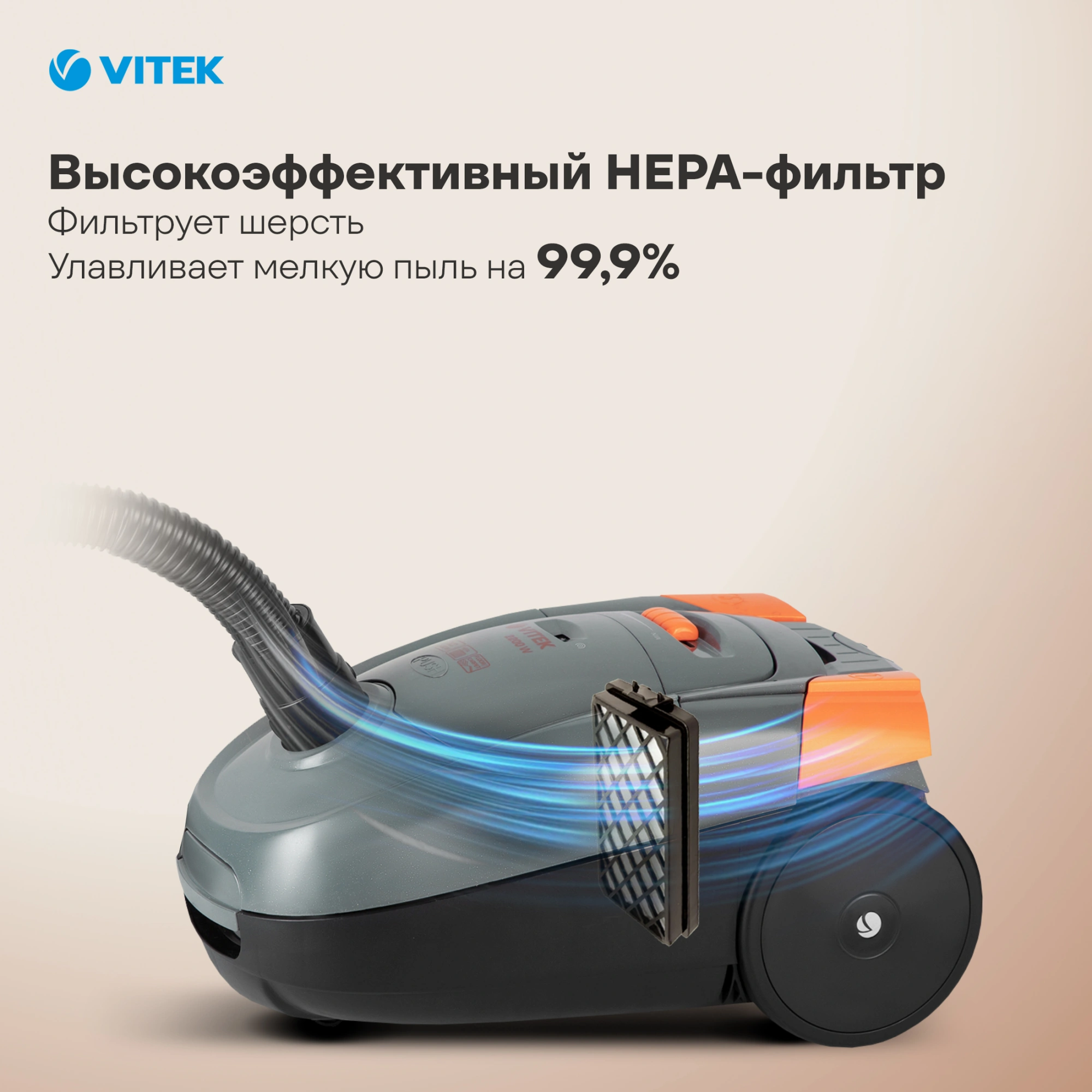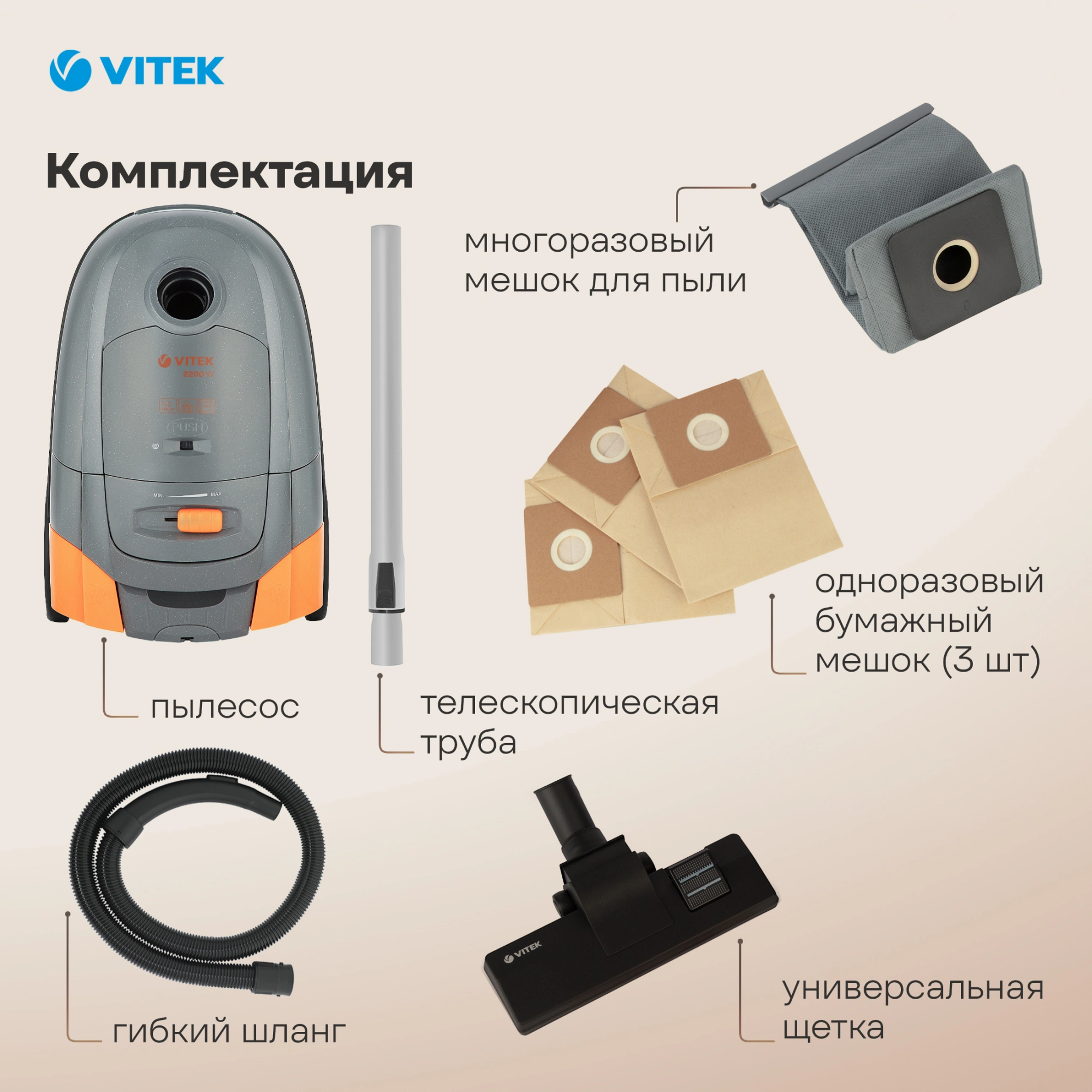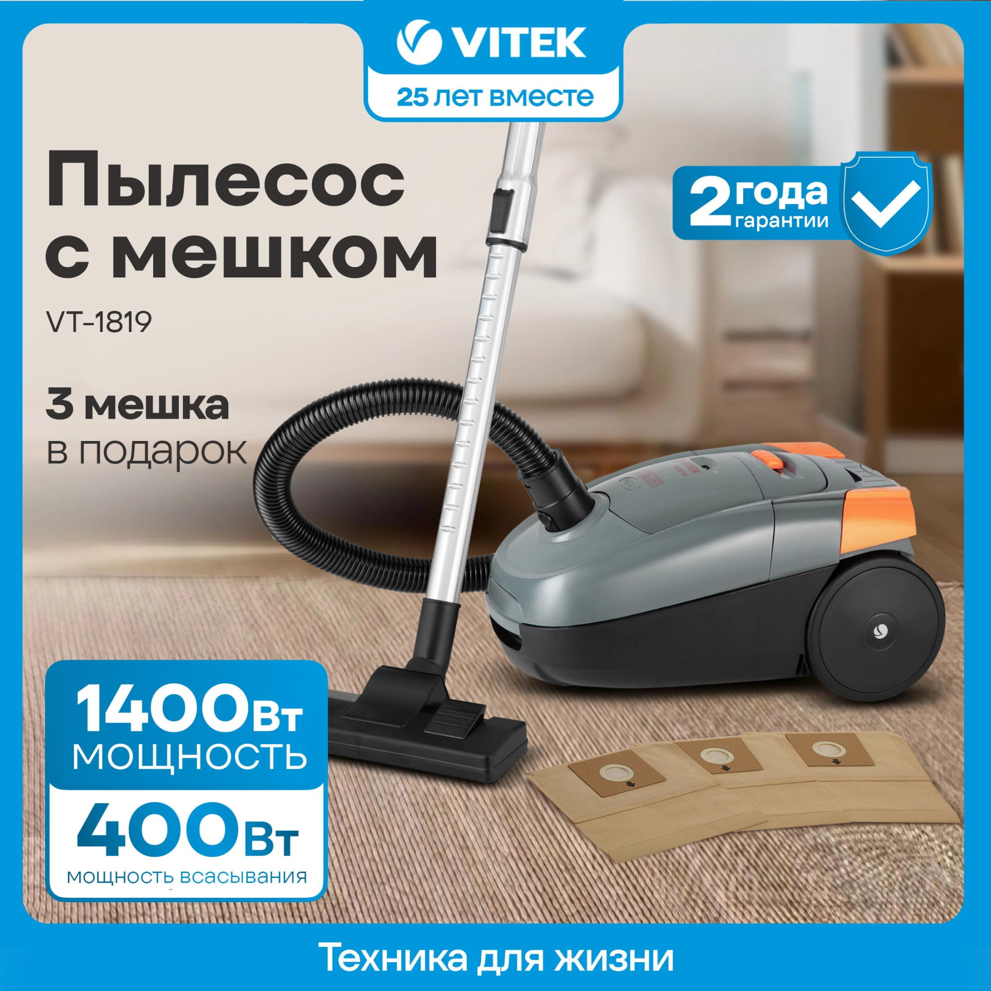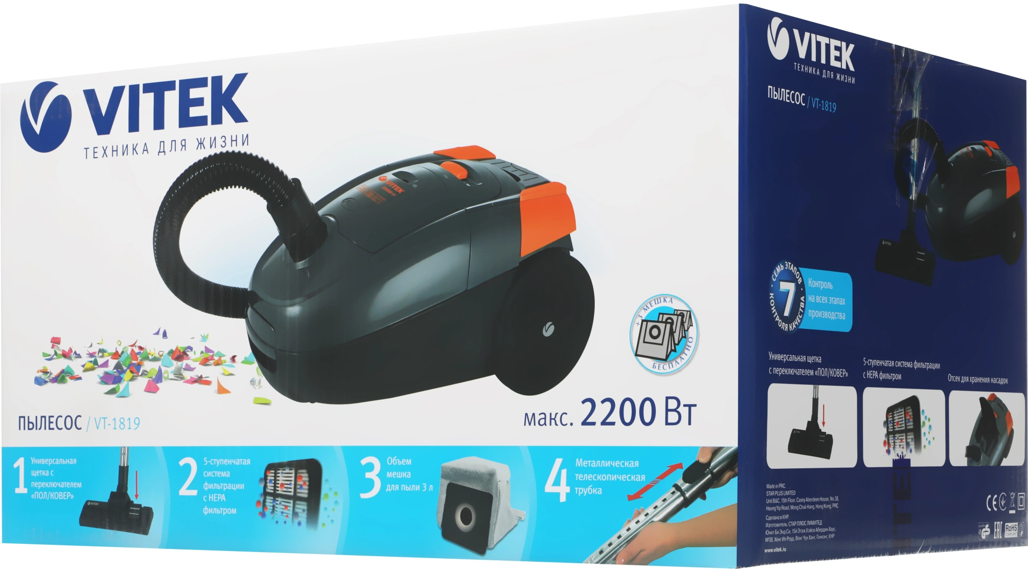 Сделать быструю и качественную уборку квартиры поможет пылесос с мешком для сбора пыли VITEK VT-1819 с мощностью 2200 Вт. Пользоваться им очень комфортно благодаря удобной телескопической металлической трубе. Прибор имеет вместительный тканевый пылесборник объемом 3 л (в комплект также входят три запасных бумажных мешка). Регулировать мощность всасывания устройства (до 400 Вт) можно механически, с помощью переключателя, расположенного на корпусе. О наполненности пылесборника вас оповестит специальный индикатор. Пылесос оснащен пятиступенчатой системой фильтрации с HEPA-фильтром, позволяющим задерживать мельчайшие частицы микроорганизмов и аллергенов. Удобству хранения устройства в любом помещении способствует возможность вертикальной парковки. Купите пылесос VITEK VT-1819, который всегда выполнит свою работу на отлично!