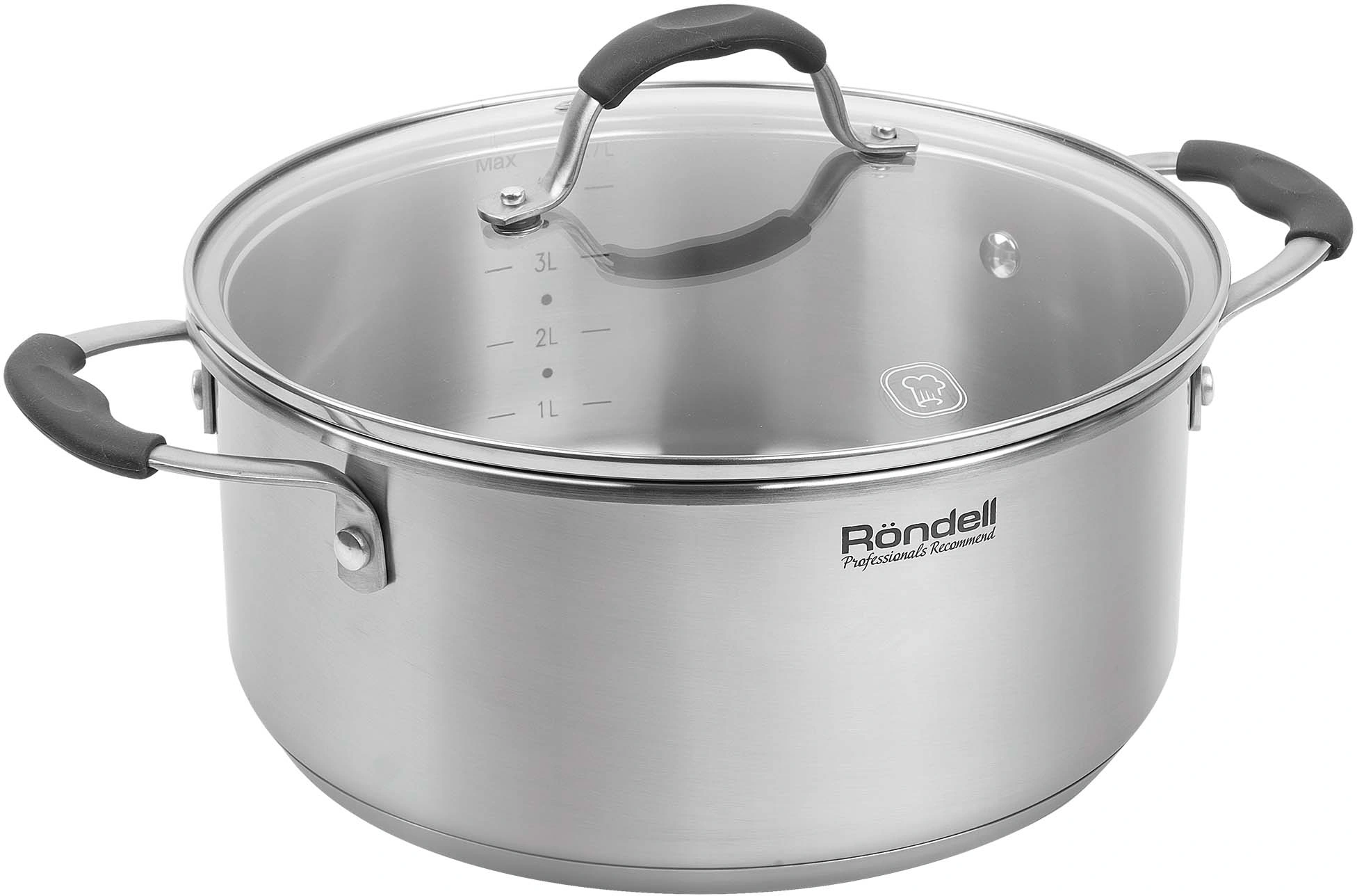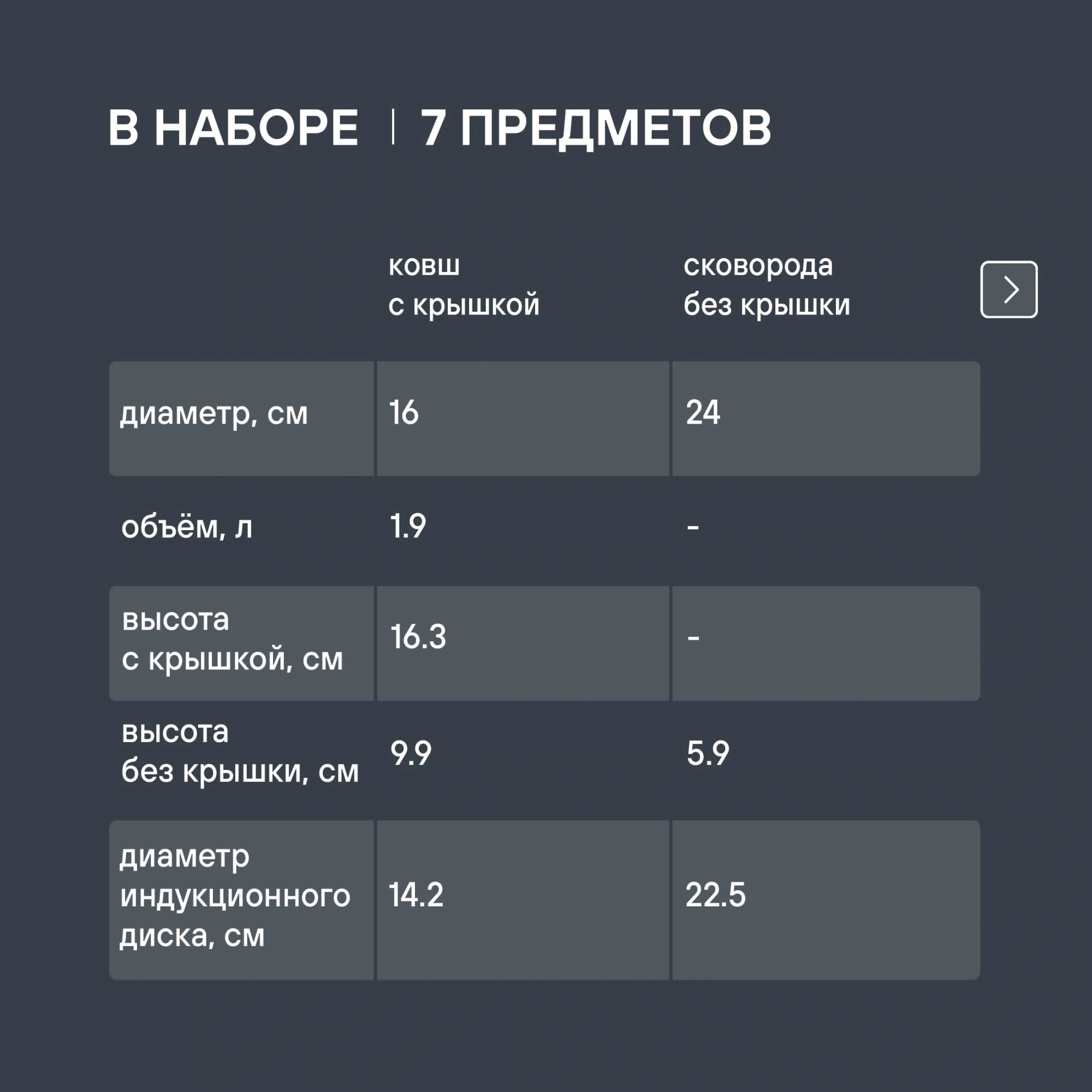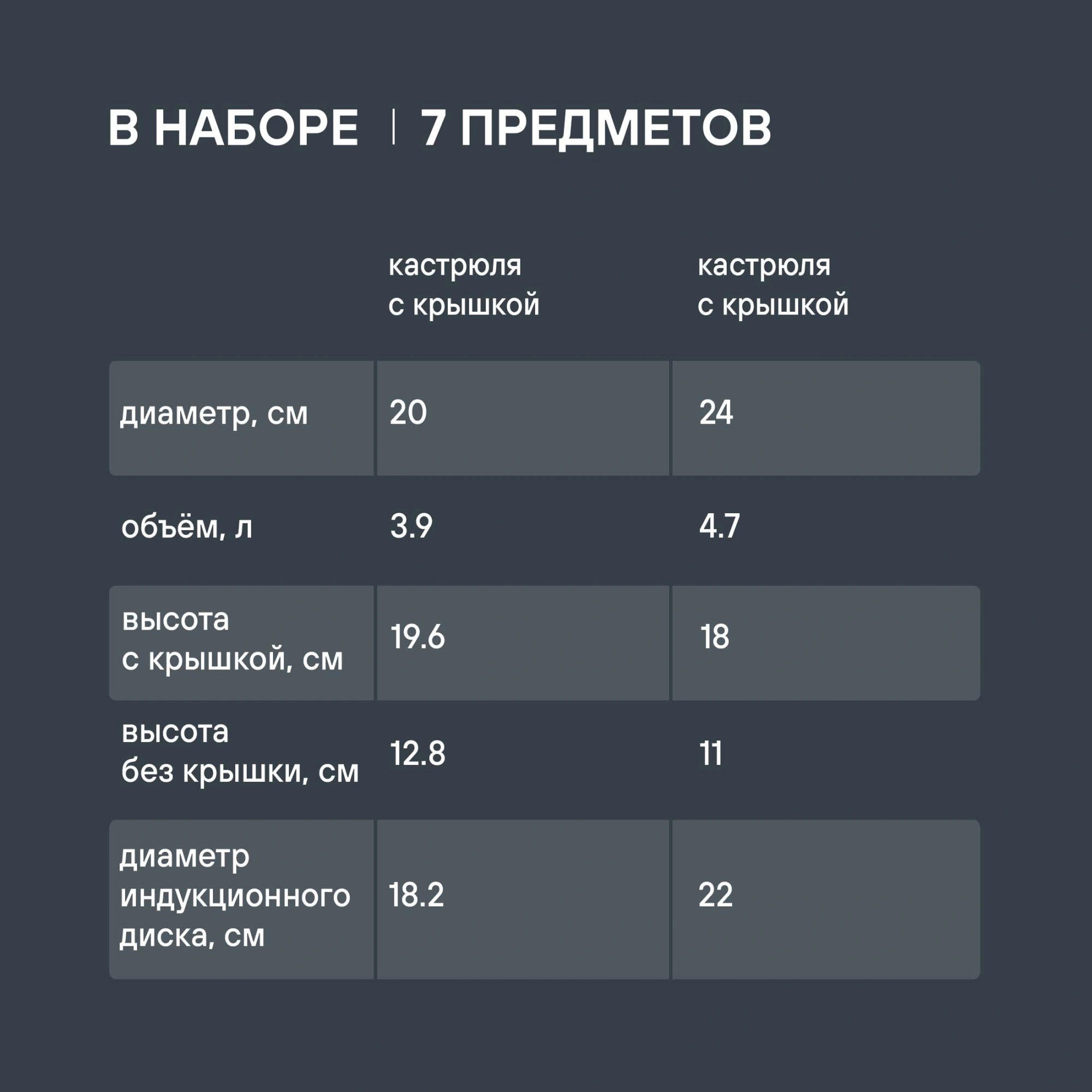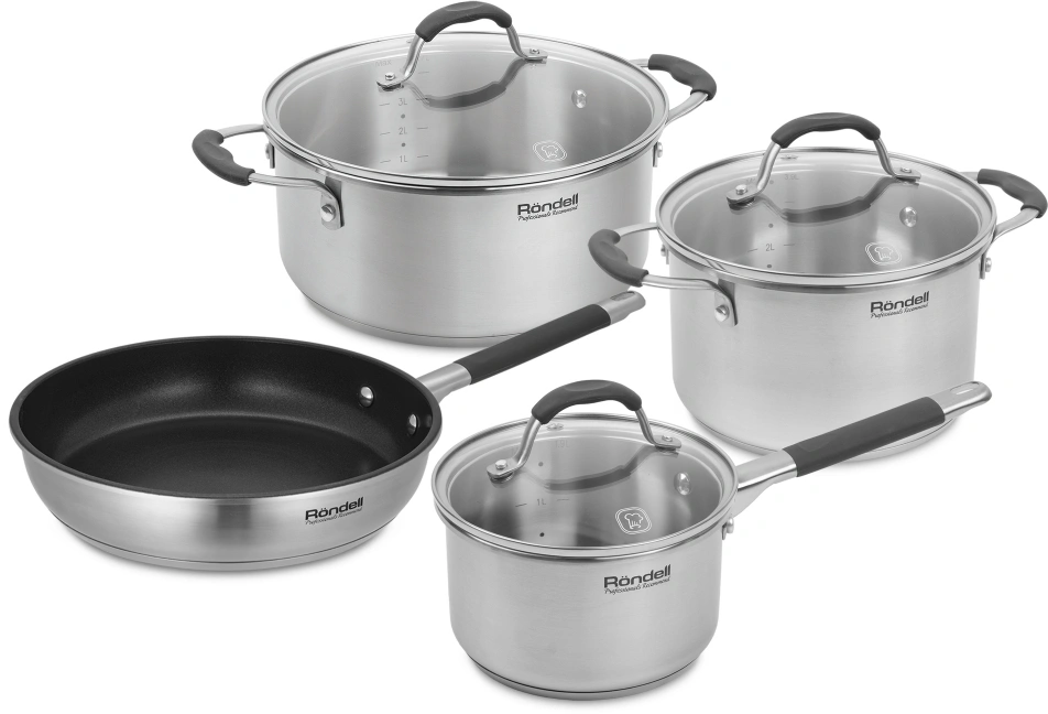 Кастрюли 20 см (3,9 л), 24 см (4,7 л), ковш 16 см (1,9 л) со стеклянными крышками, сковорода 26 см