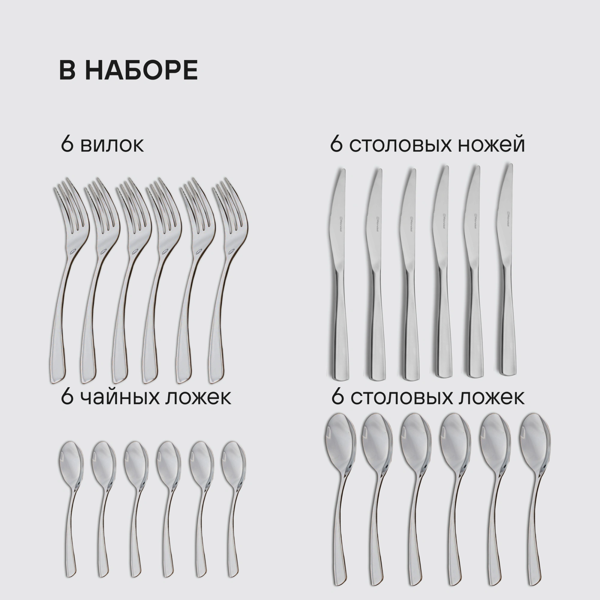 шесть вилок, шесть столовых ложек, шесть ножей и шесть чайных ложек
