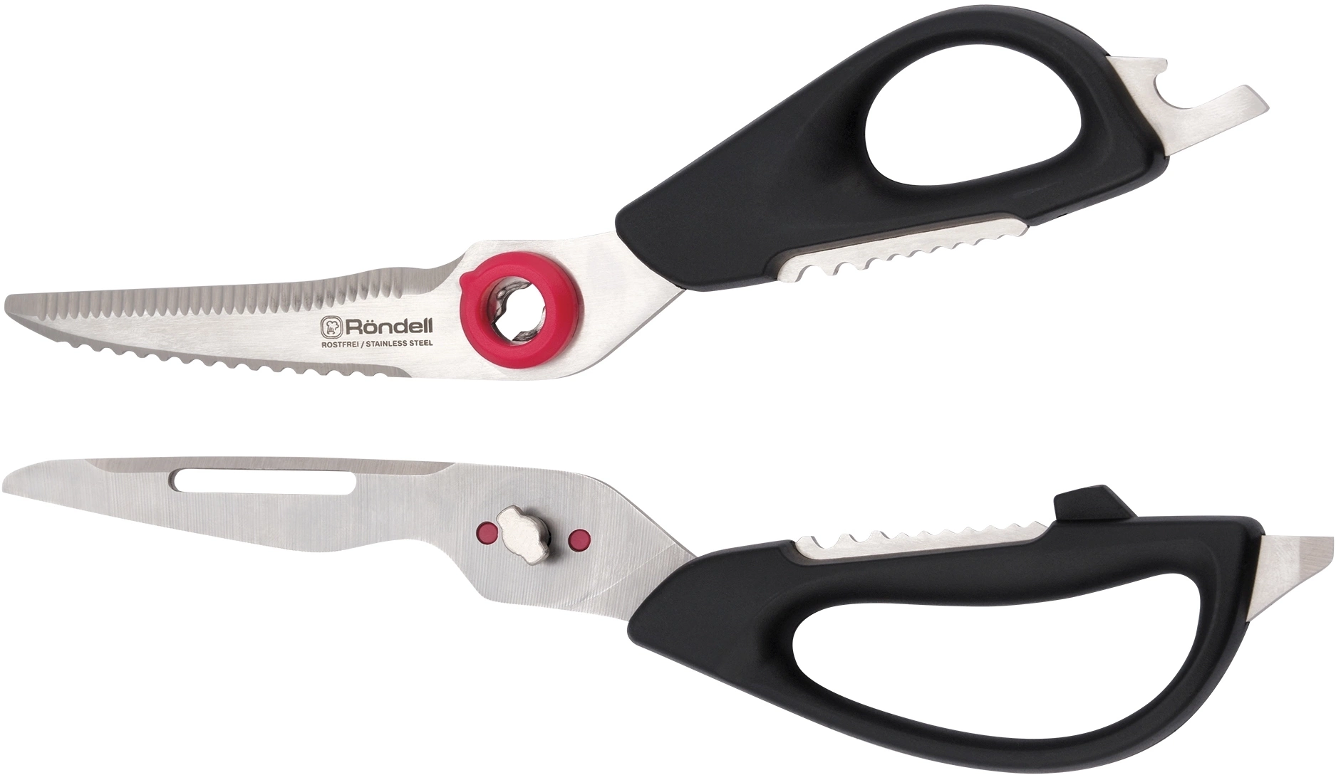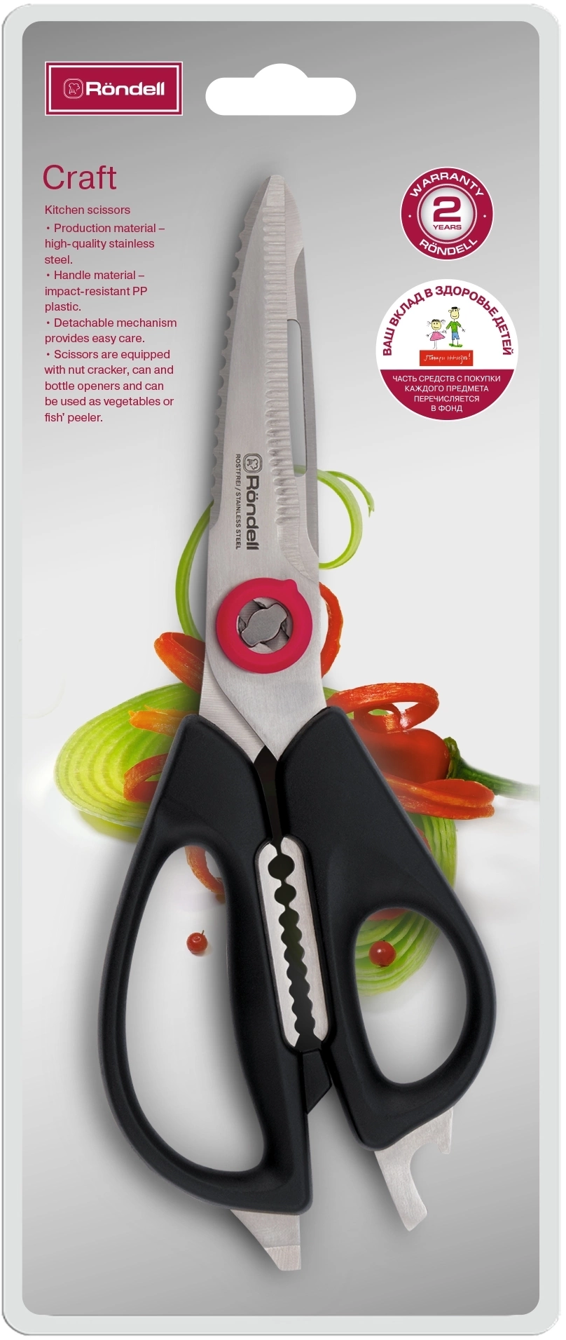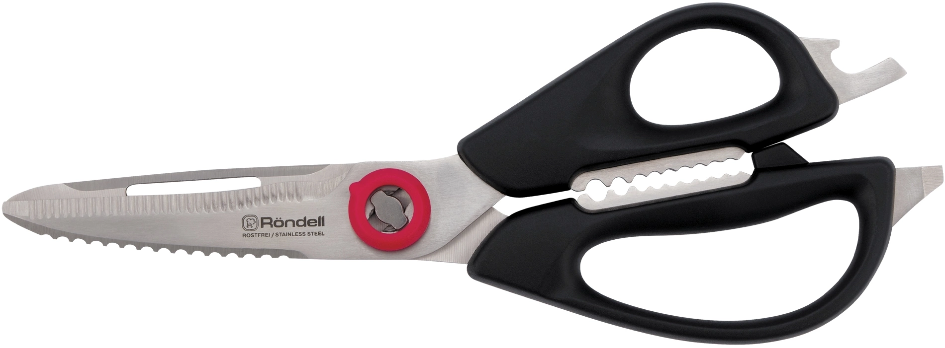 Кухонные ножницы универсальны, поскольку оснащены орехоколом, открывалкой для банок и бутылок и могут использоваться для чистки овощей и рыбы. Принадлежности из ABS пластика и нержавеющей стали отличаются невероятным комфортом в использовании.