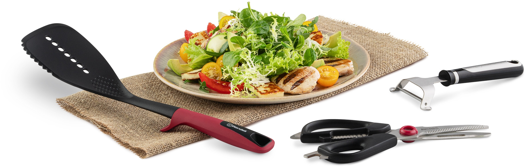 Преимущества: удобный хват, эргономичная форма ручек. Использование: не подходит для посудомоечной машины. Упаковка: картонная подложка. Материал рабочей поверхности: нержавеющая сталь и прорезиненный полипропилен. Материал ручки: ABS пластик и нержавеющая сталь.