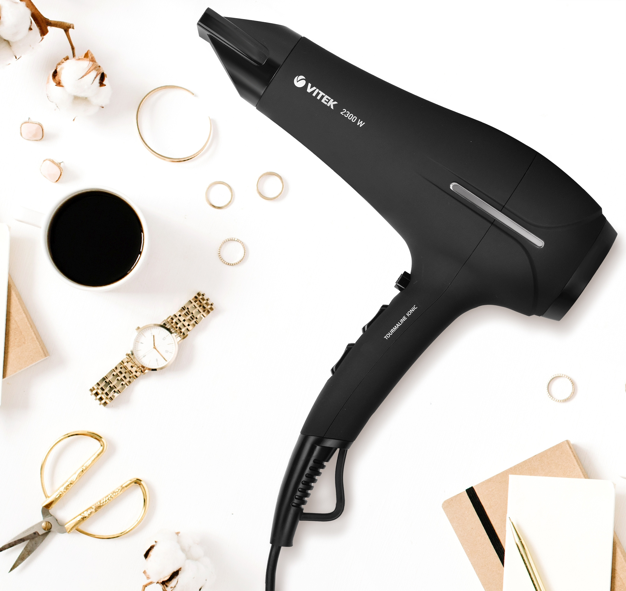 Стильный фен VITEK VT-2262 BK защитит ваши волосы и позаботится о них с помощью функции турмалиновой ионизации. Вы можете настроить подходящий режим и с легкостью высушить волосы или сделать романтичную укладку.
