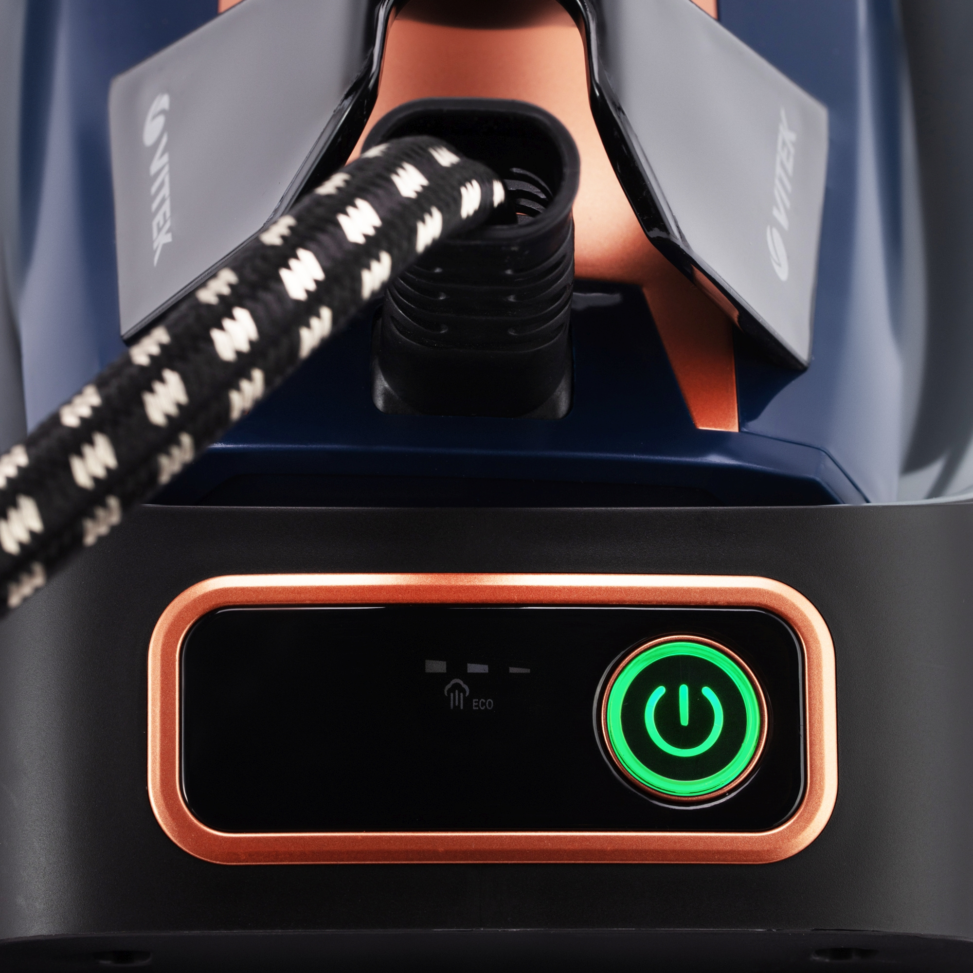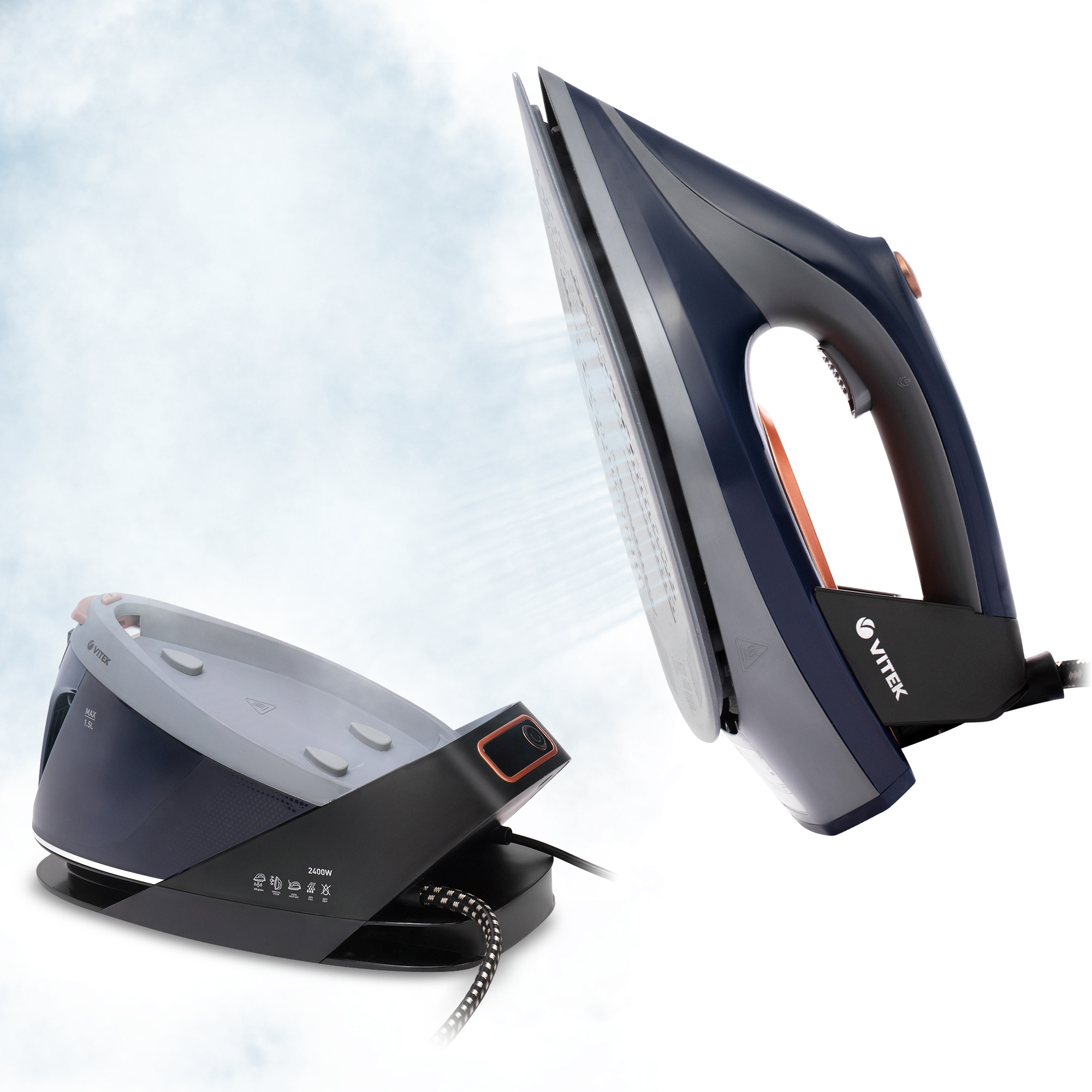 Быстро и качественно отгладить костюм, брюки, платье или плащ позволит паровая станция VITEK VT-2430 с мощностью 2400 Вт и максимальным давлением 5,5 бар. Устройство может работать как в режиме обычного утюга, так и вертикального отпаривателя, поэтому легко справится и с легкими, и с довольно плотными, тяжелыми тканями. Если вы выберете первый вариант, то будете приятно удивлены гладкостью керамической подошвы, которая обеспечивает сверхлегкое скольжение по любому материалу. Решили воспользоваться режимом отпаривателя? Пожалуйста! Прибор, оснащенный съемным резервуаром для воды емкостью 1,5 л, способен функционировать в режиме постоянной подачи пара (до 110 г/мин), а также в режиме парового удара (до 220 г/мин). О накипи можно не беспокоиться: в паровой станции предусмотрена специальная встроенная защита. И что особенно удобно, устройство автоматически отключится, если вы не будете им пользоваться в течение некоторого времени.