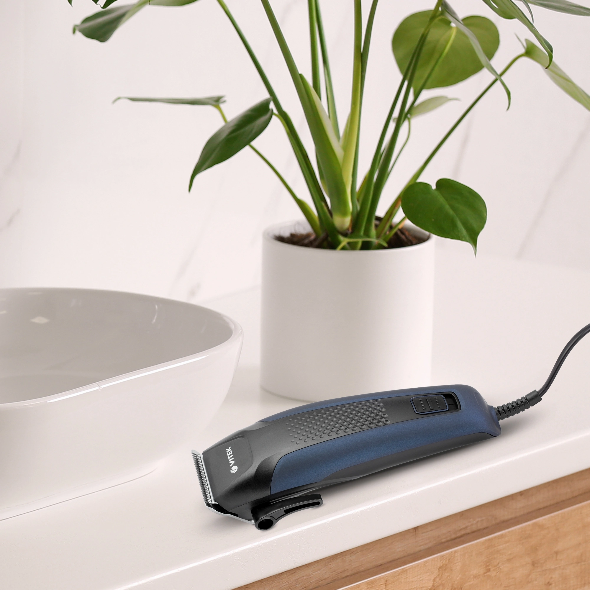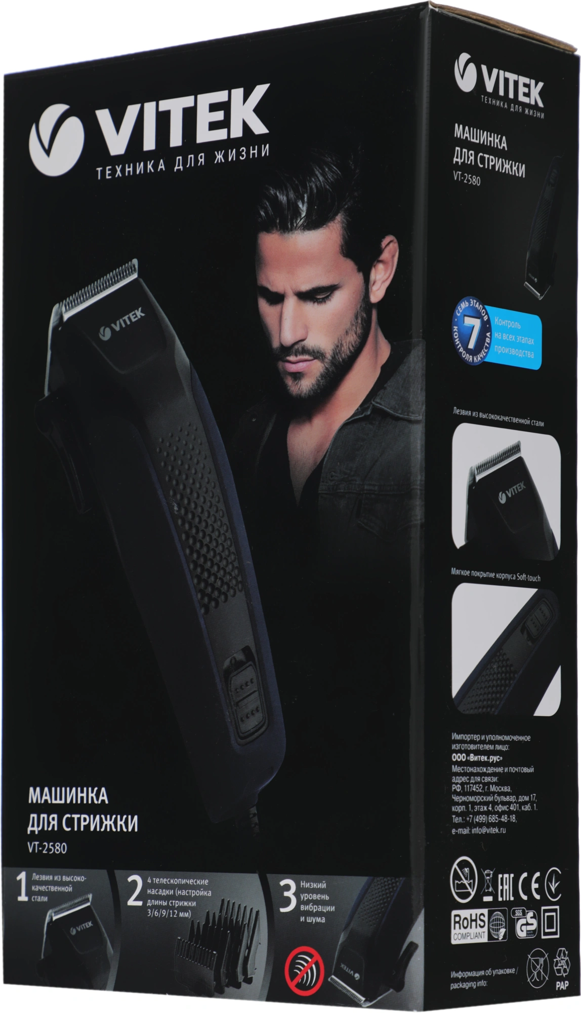 VITEK VT-2580 – это полноценный набор для стрижки волос, в который вместе с машинкой входят также расческа и ножницы. Машинка имеет четыре различные насадки с лезвиями из высококачественной стали, которые обеспечивают необходимую длину волос – от 3 до 12 мм, а низкий уровень вибрации и покрытие корпуса Soft touch делают процесс стрижки легким, приятным и комфортным.