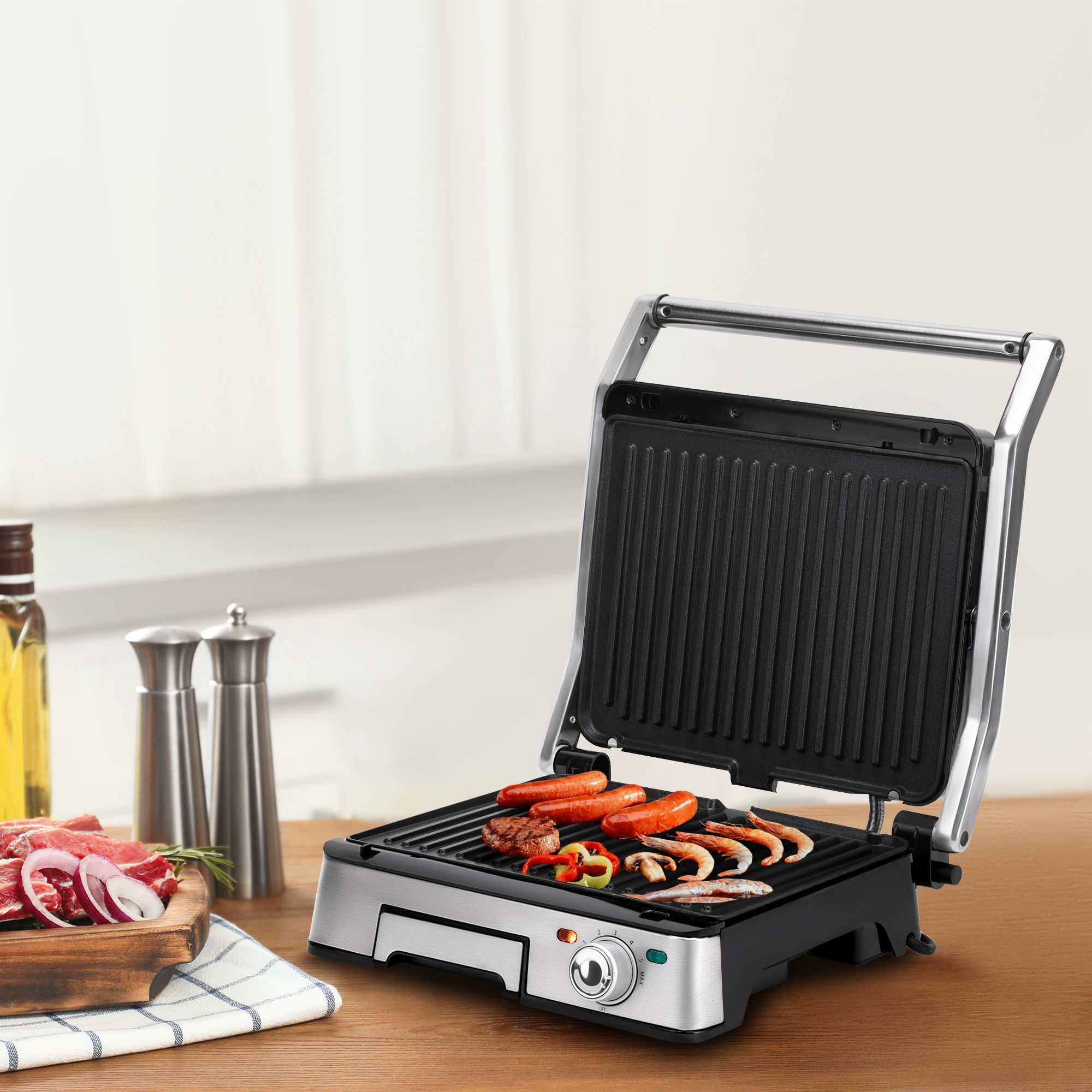 Любите мясо, рыбу или овощи с румяной корочкой? Приготовить их в домашних условиях поможет гриль-пресс VT-2636 в корпусе из нержавеющей стали и высококачественного термостойкого пластика (максимальная мощность — 2000 Вт). Особому комфорту в работе способствует фиксация открытия пластин на 90° и 180° (последнее обеспечивает возможность использования устройства в качестве открытого гриля). Температуру нагрева можно регулировать в зависимости от рецепта или вашего желания: от 70°С до 240°С. Продукты в гриль-прессе готовятся очень быстро, ведь нагревательные элементы расположены и в верхней, и в нижней части прибора. Размер моющихся пластин с антипригарным покрытием (290 х 230 мм) рассчитан на 4 порции. Для особого удобства в эксплуатации в приборе предусмотрен встроенный лоток для сбора масла, поэтому устройство можно смело ставить и на столешницу, и на стол. Купить гриль-пресс VITEK VT-2636 — значит, подарить себе возможность регулярно баловать близких вкусными аппетитными блюдами.