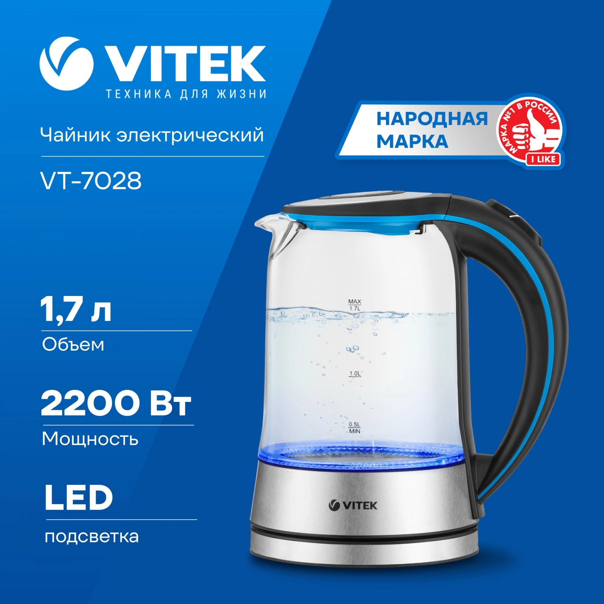 Мощный чайник VITEK VT-7028 из термостойкого стекла объемом 1,7 л позволит оперативно приготовить горячий чай на 8 человек. Прибор безопасен за счет отключения при отсутствии воды и легко чистится.
