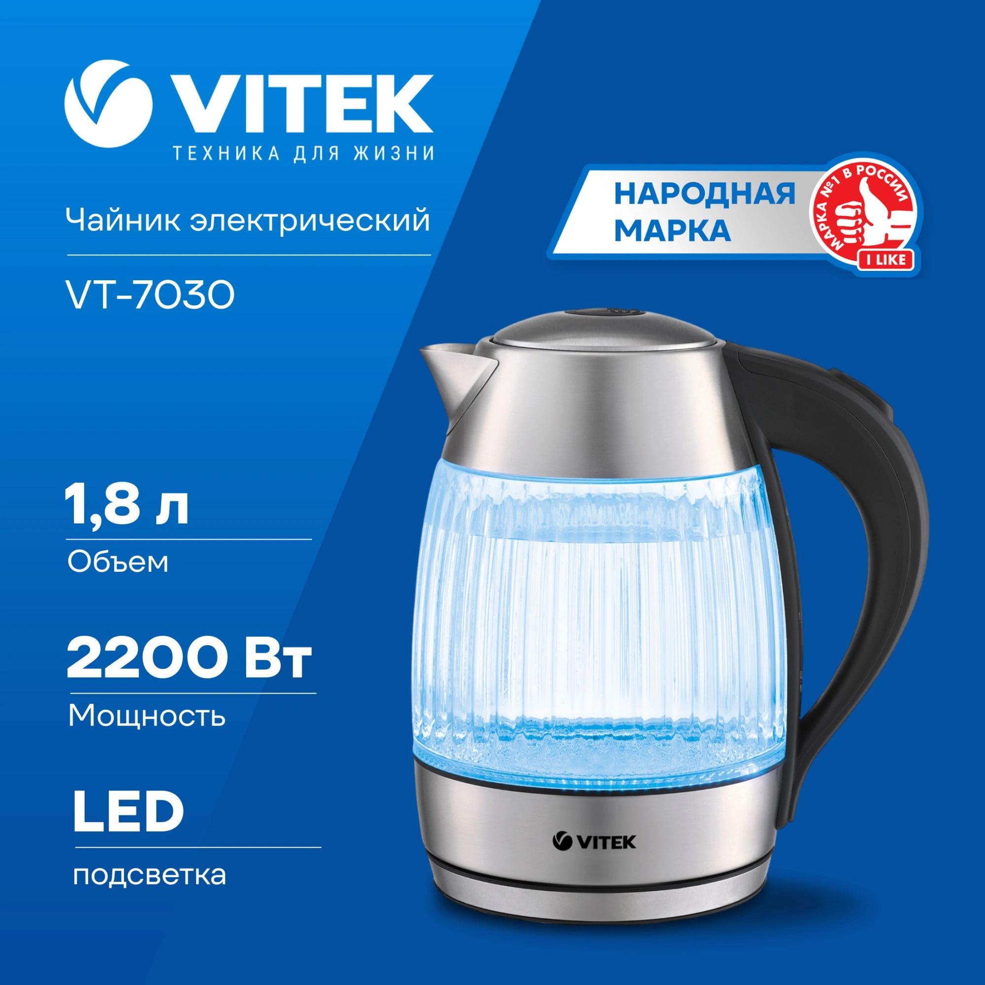 Быстро и качественно приготовить ваши любимые напитки поможет чайник VITEK VT-7030 объемом 1,8 л с максимальной мощностью 2200 Вт. Изготовлен прибор из высококачественного текстурированного термостойкого стекла, благодаря чему он очень стильно и необычно смотрится в интерьере. Наблюдение за процессом кипячения воды доставит вам эстетическое удовольствие, благодаря эффектной подсветки корпуса. Пользоваться чайником очень удобно: он способен поворачиваться на 360°, а его крышка открывается простым нажатием на кнопку. Следить за уровнем воды поможет специальная шкала, расположенная на боковой поверхности прибора. Специальный фильтр на носике защитит ваши напитки от накипи: при необходимости его легко снять и промыть. Нагревательный элемент прибора встроен в плоское дно и защищен пластиной из высококачественной нержавеющей стали, поэтому ухаживать за устройством очень легко. При перегреве, закипании воды или ее отсутствии чайник отключается автоматически. Купите чайник VITEK VT-7030: сделайте подарок себе и всей семье!