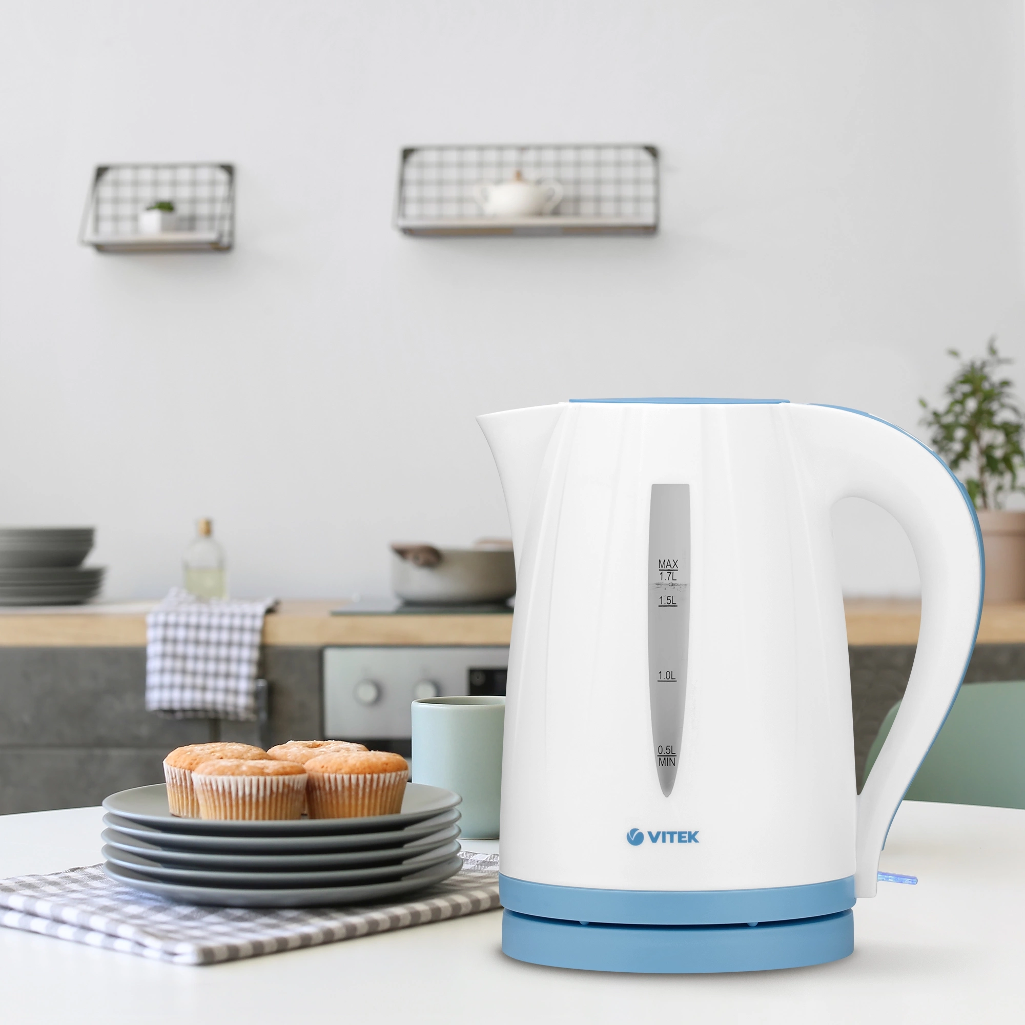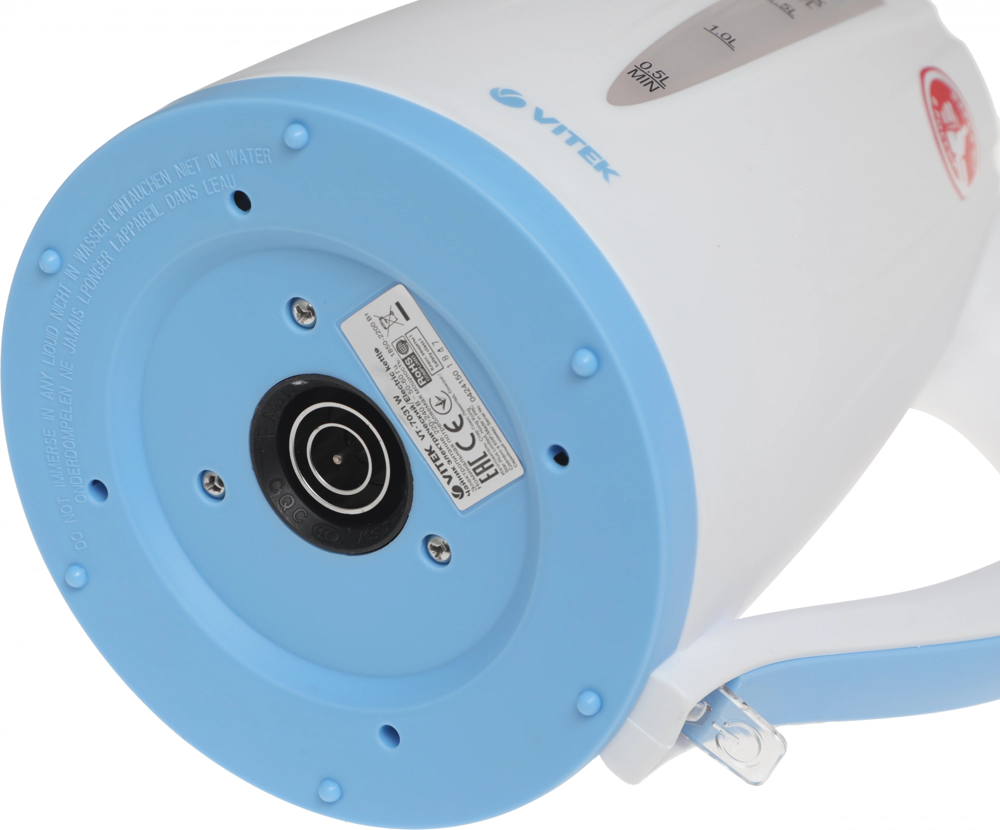 Чайник VITEK VT-7031 из термостойкого пластика снабжен функцией отключения при закипании и отсутствии воды. Благодаря скрытому нагревательному элементу прибор легко чистить.